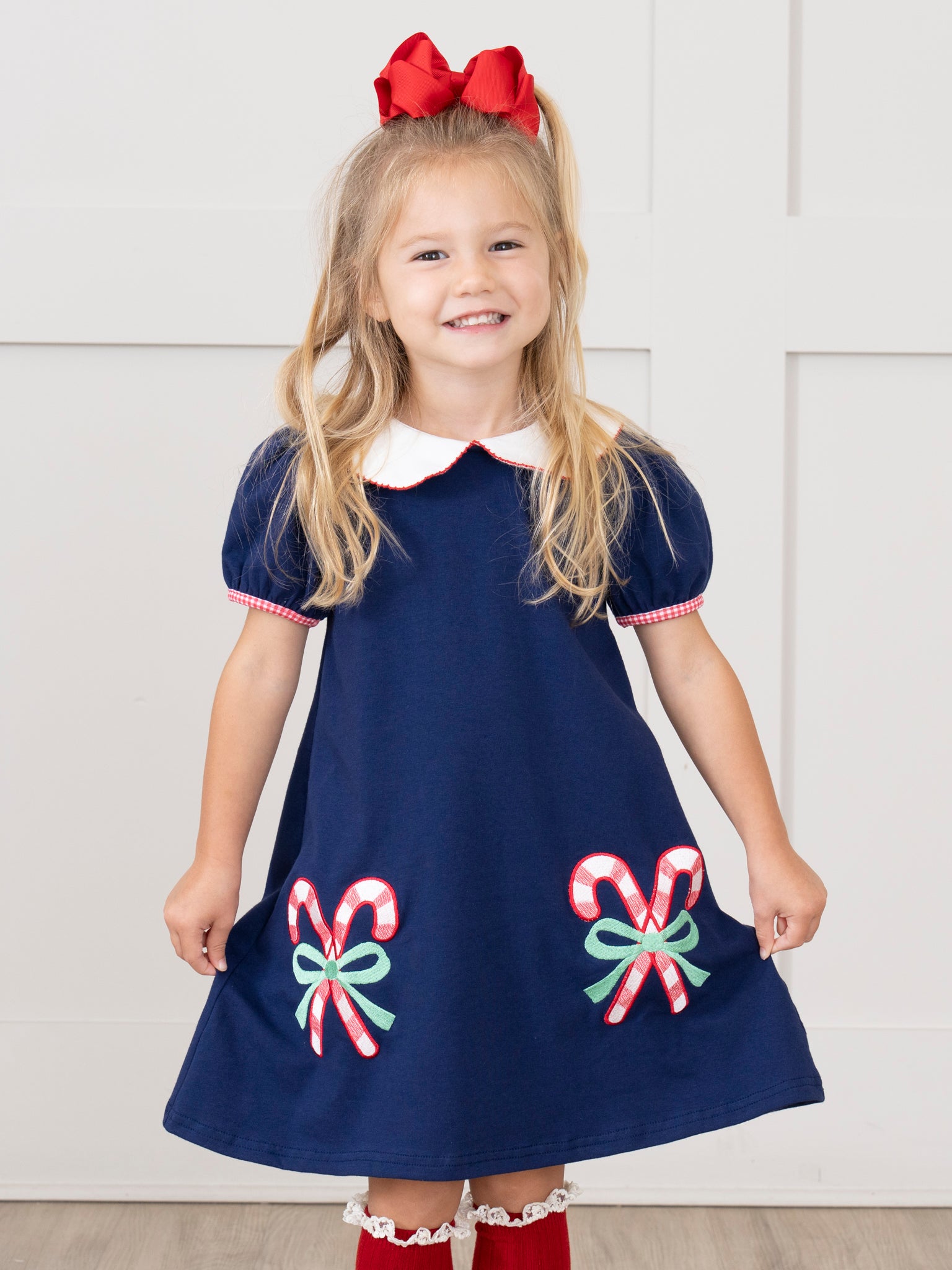 Bring a big bite of sweetness with the Candy Cane Munchers Embroidered Dress! This piece by Marie Nicole Clothing is perfect for that little sweet tooth in your life. With embroidered candy canes and a cozy, classic style, this dress keep your child comfy and jolly during the winter holidays.