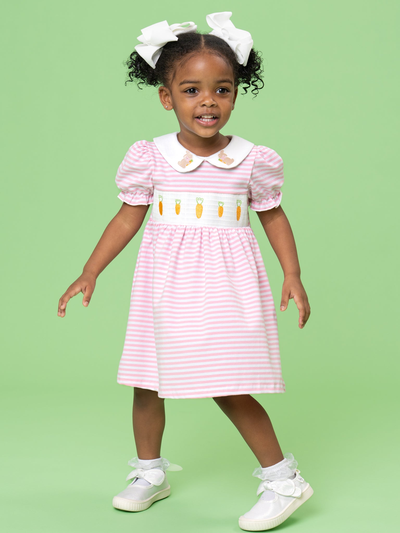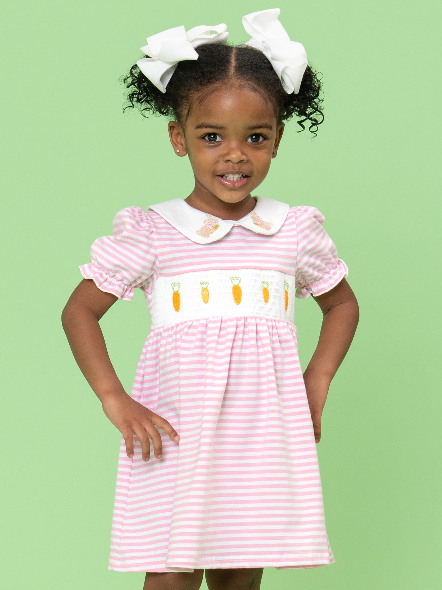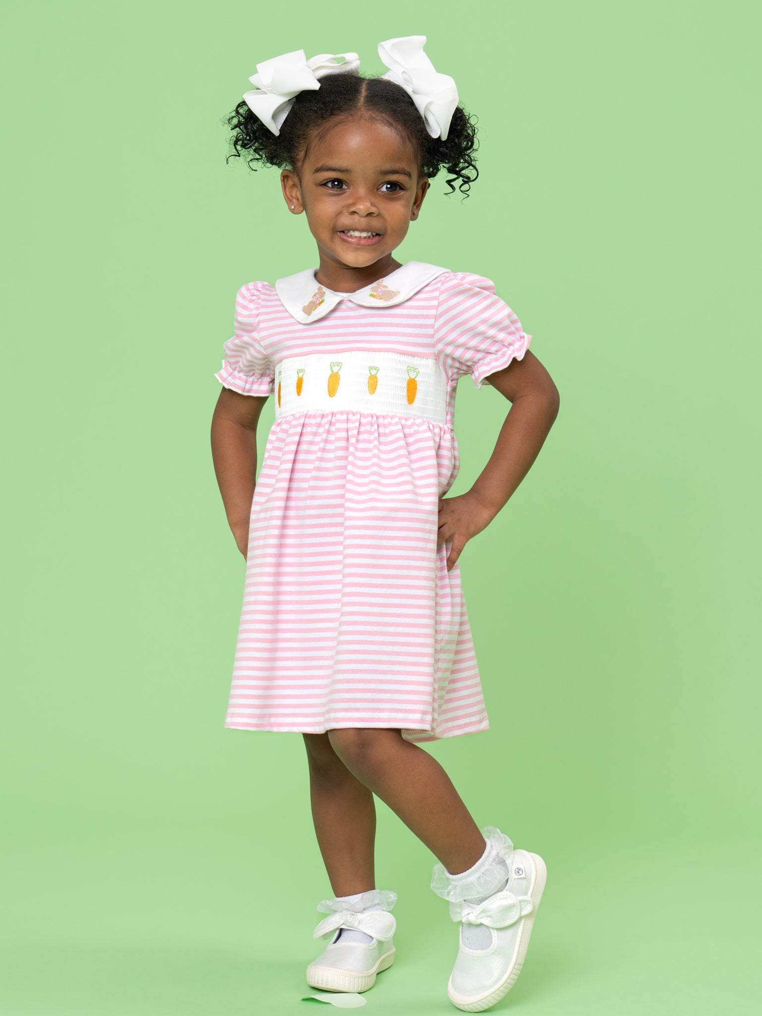 Carrot Parade Striped Smocked Dress by Marie Nicole Clothing offers classic Easter charm with soft stripes, a Peter Pan collar, and a smocked panel marching with tiny carrots across the chest. The gently gathered skirt and puff sleeves keep little ones comfortable and picture-ready for church, egg hunts, and spring celebrations.