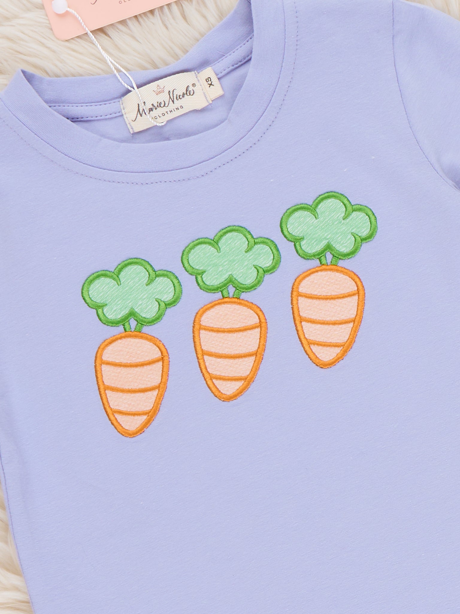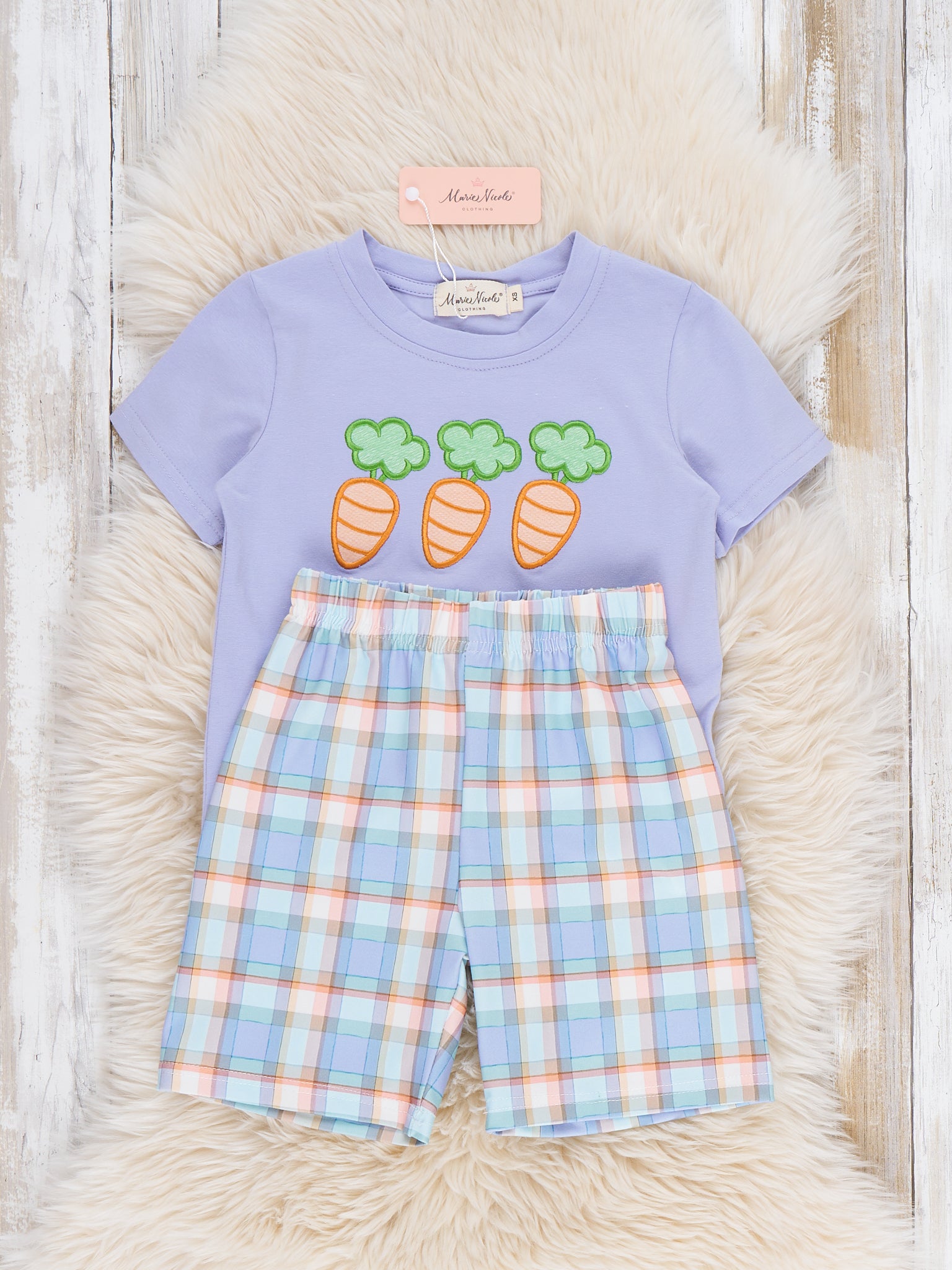 Carrots Trio Embroidered Outfit by Marie Nicole Clothing features a short sleeve tee with carrot appliqué and coordinating gingham shorts. This playful and comfortable set is perfect for springtime, Easter celebrations, and everyday farm-inspired fun, designed with cheerful designs and soft, stretchy fabric.