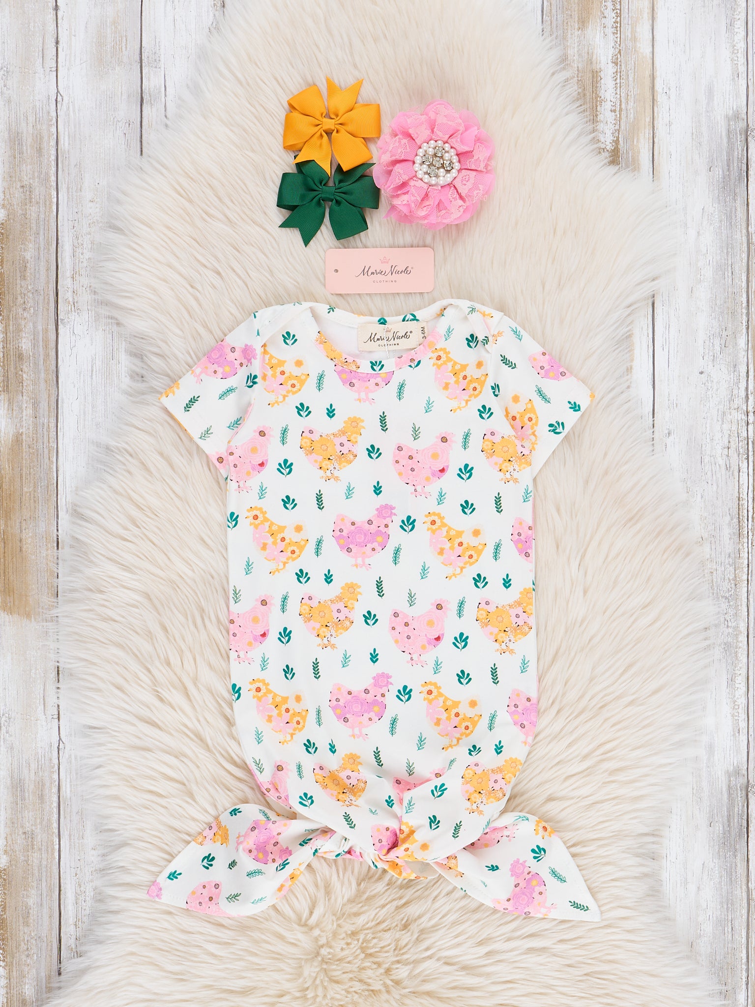 Dress your little chick in this adorable Hen Garden Knot Gown from Marie Nicole Clothing. This sister set features a gown adorned with a charming hen print. The knot closure adds comfort for growing baby. Perfect for a fun day out!