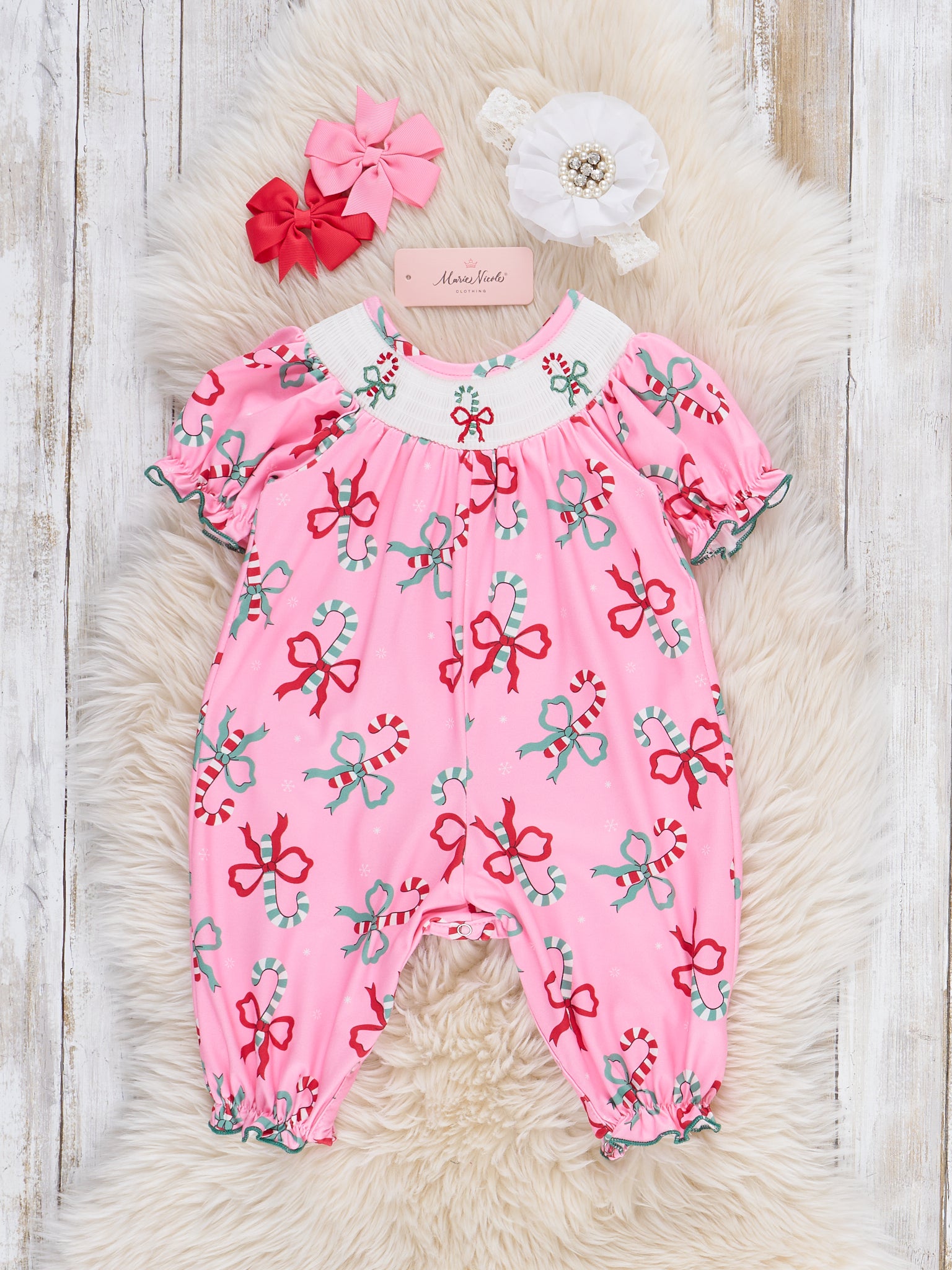The Christmas Sweet Tooth Smocked Romper by Marie Nicole Clothing features playful candy cane and bow motifs with delicate smocking at the neckline, puff sleeves, and gathered hems for comfort and festive style. This romper is perfect for holiday events, cozy playdates, and capturing cheerful seasonal moments.