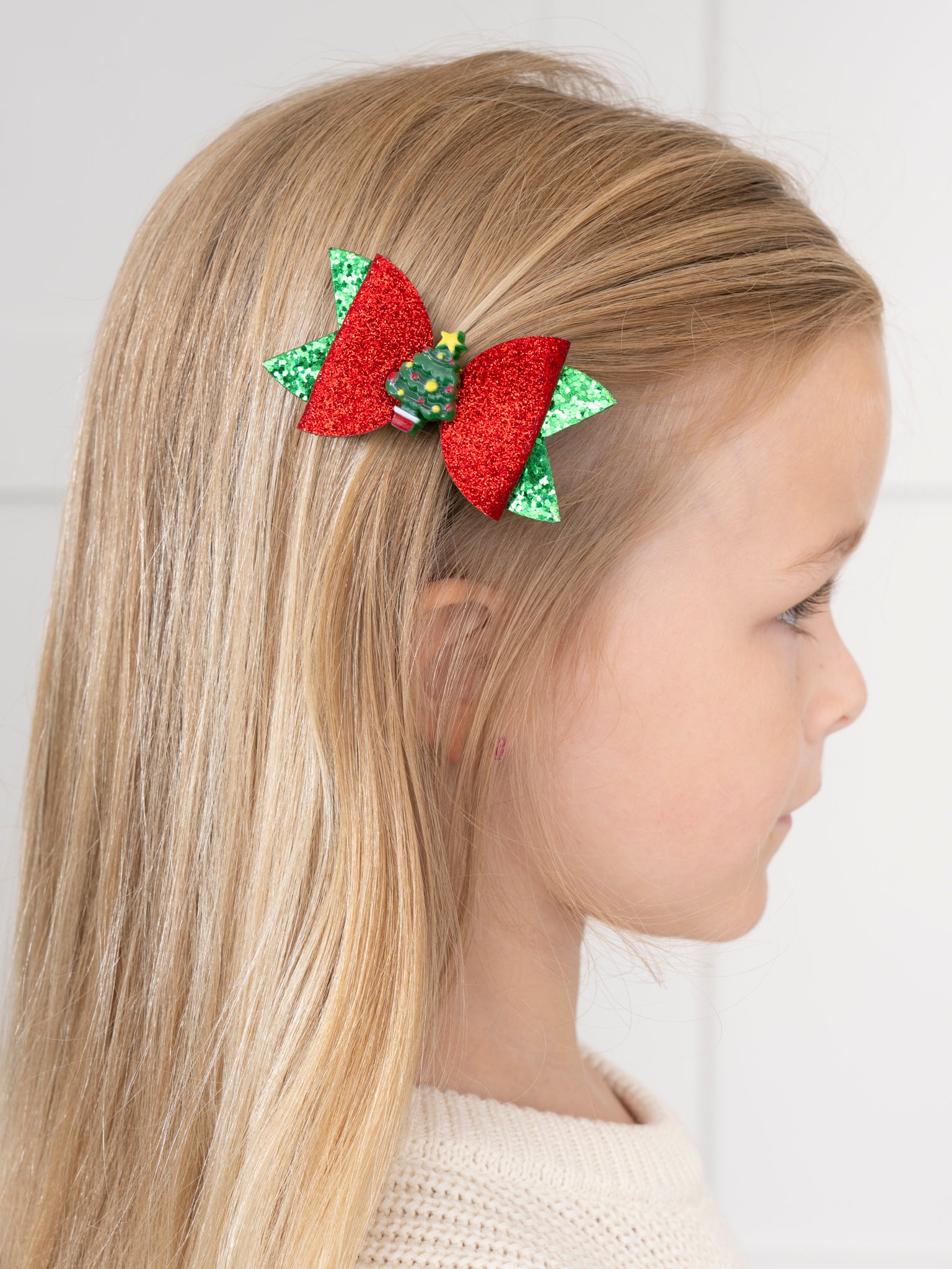 Be bright like a Christmas tree! Marie Nicole Clothing's Christmas Tree Glitter Bow is a bedazzling hairpiece that is perfect for the winter holiday season. Bring a piece of Christmas cuteness to any outfit with this adorable bow!