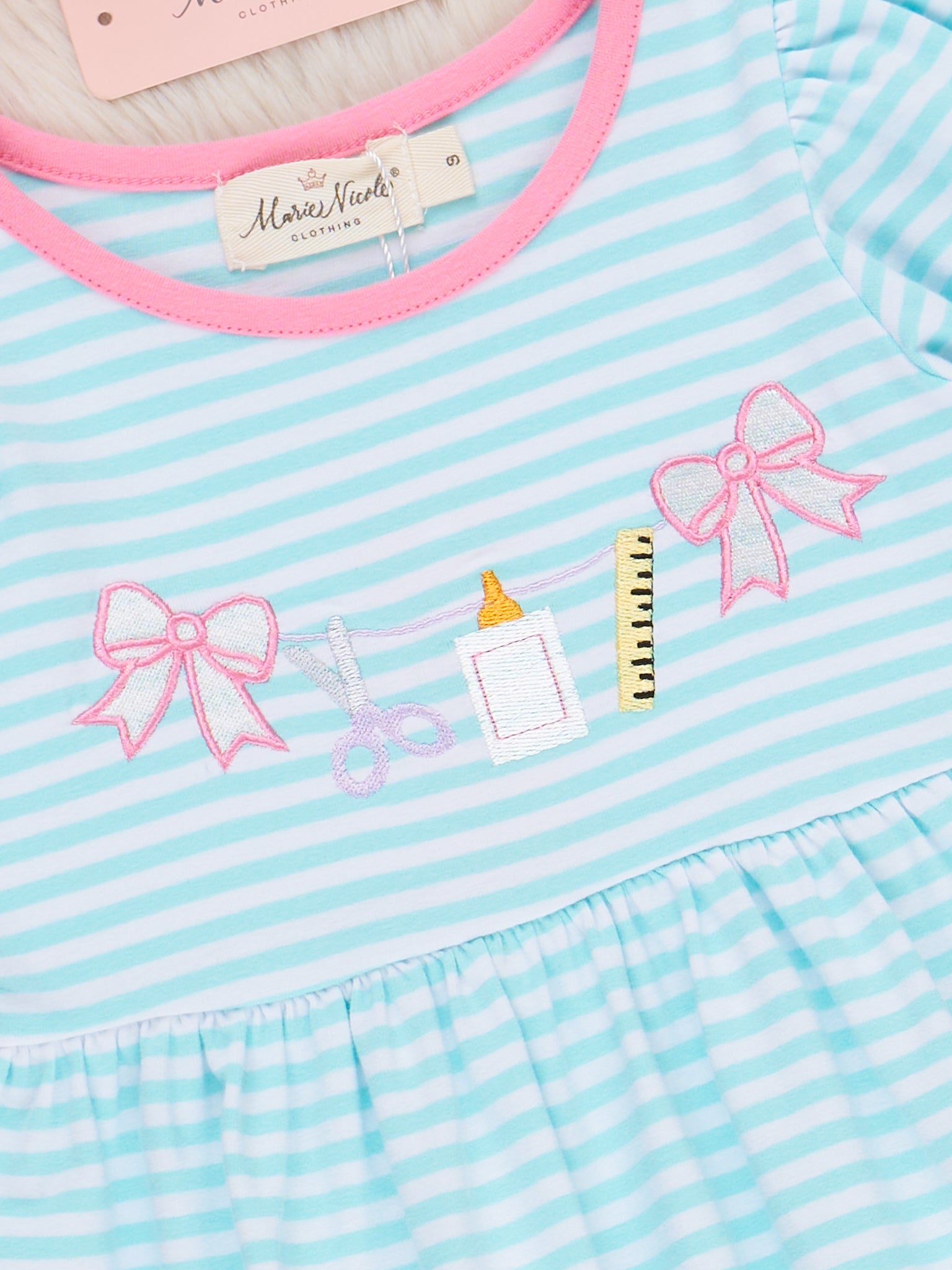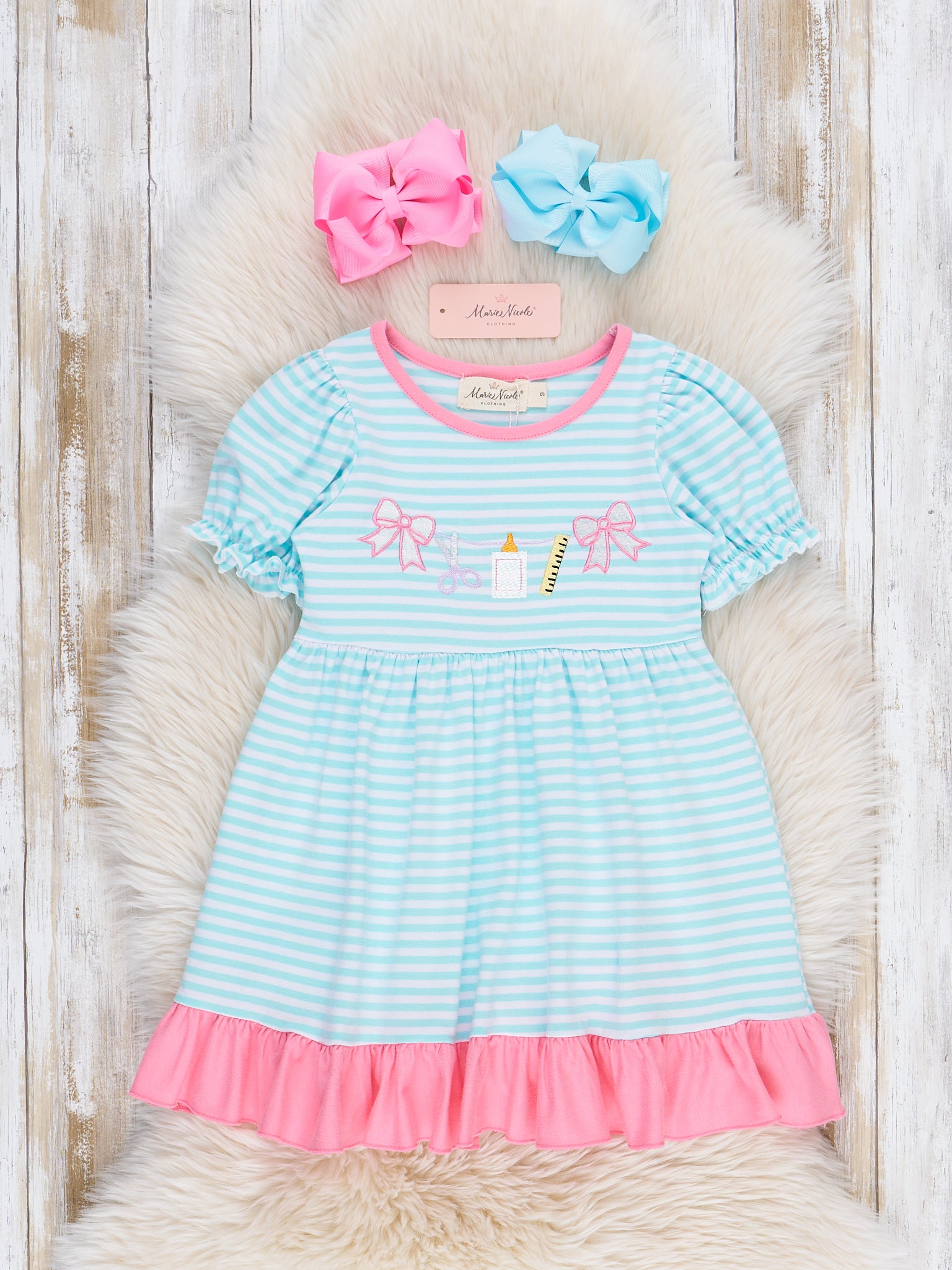 The Classroom Bows Striped Ruffle Dress brings a touch of charm to every school day. With its classic striped pattern, adorable embroidered accents, and soft ruffle details, this dress from Marie Nicole Clothing is perfect for both classroom learning and playground fun.