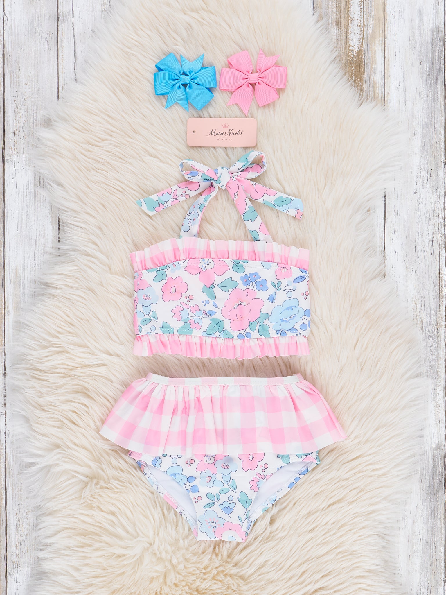 Get ready to make a splash this summer with our Cottage Floral & Gingham Halter Tie Swimsuit! This adorable girls swimsuit features a floral top with pink gingham ruffle trim and halter straps, while the floral print bottoms have a cute pink gingham peplum detail. Perfect for fun in the sun (and photoshoots by the pool)! From Marie Nicole Clothing.