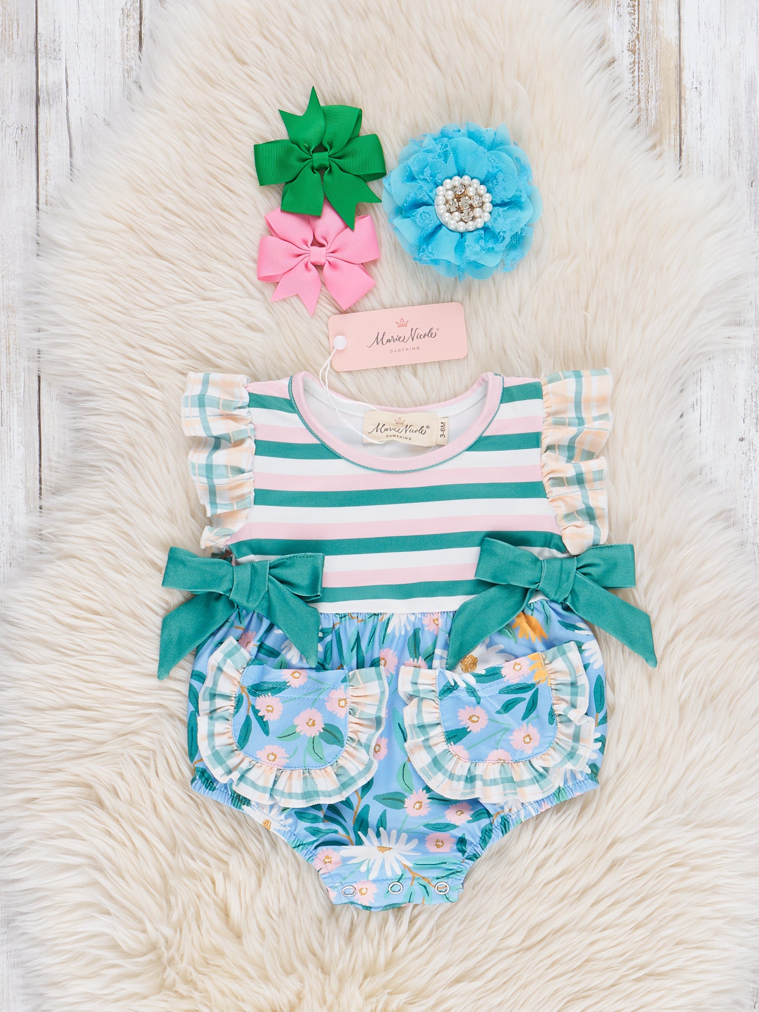Get your little one ready for summer adventures in our Country Wildflowers Ruffle Bubble! Featuring a striped bodice with playful ruffle sleeves and a floral print bottom boasting bows and sweet ruffle pockets. From Marie Nicole Clothing, this dress is perfect for sisters who love to match in style.
