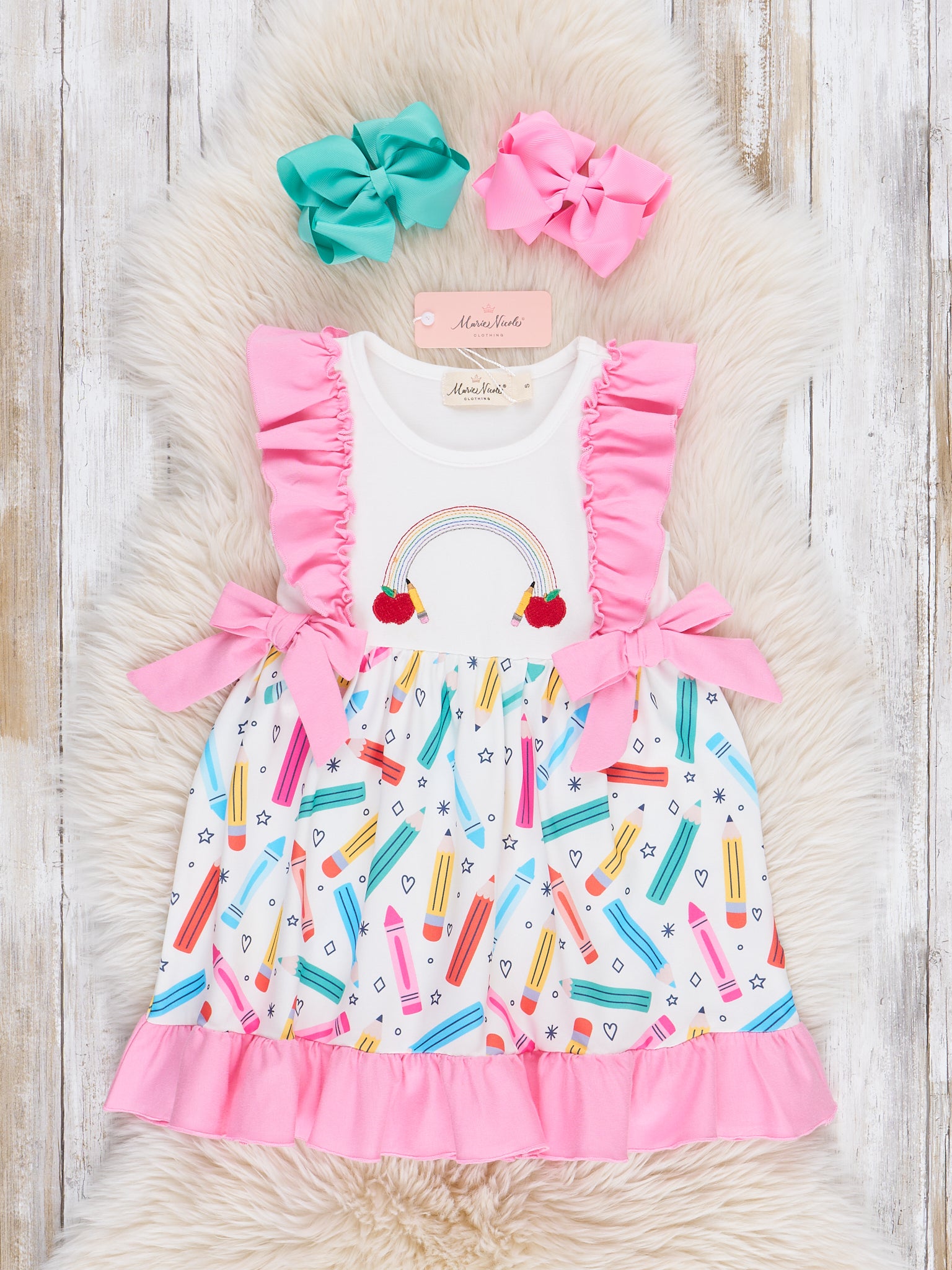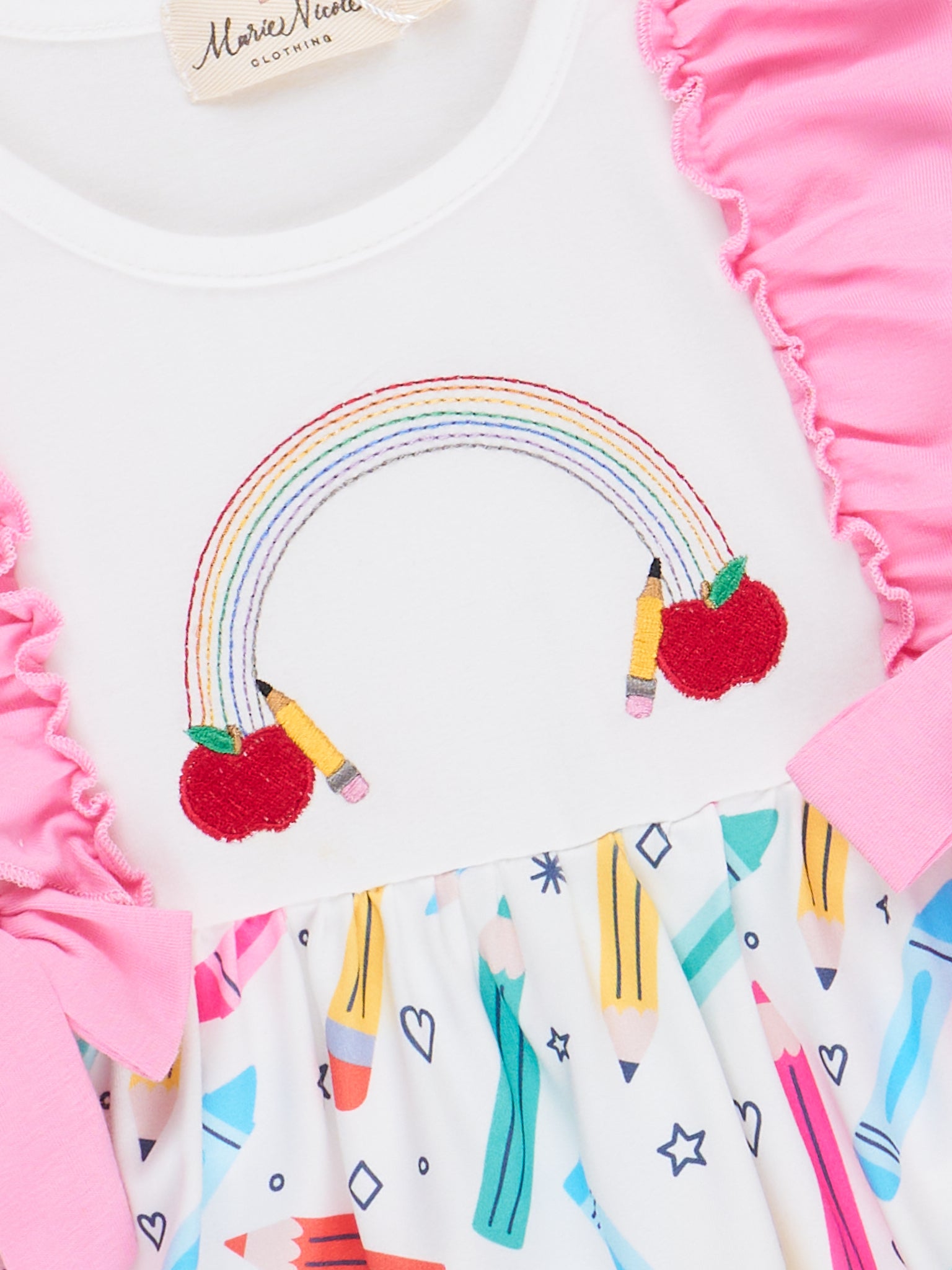 The Crayon Sprinkles Ruffle Dress is a playful and colorful choice that’s perfect for brightening up any day. Featuring a fun color print with vibrant hues and finished with charming ruffle details, this dress from Marie Nicole Clothing is lightweight and comfortable for all-day play. Whether it’s school, a playdate, or just a day full of fun, she’ll love twirling in this sweet and lively dress.