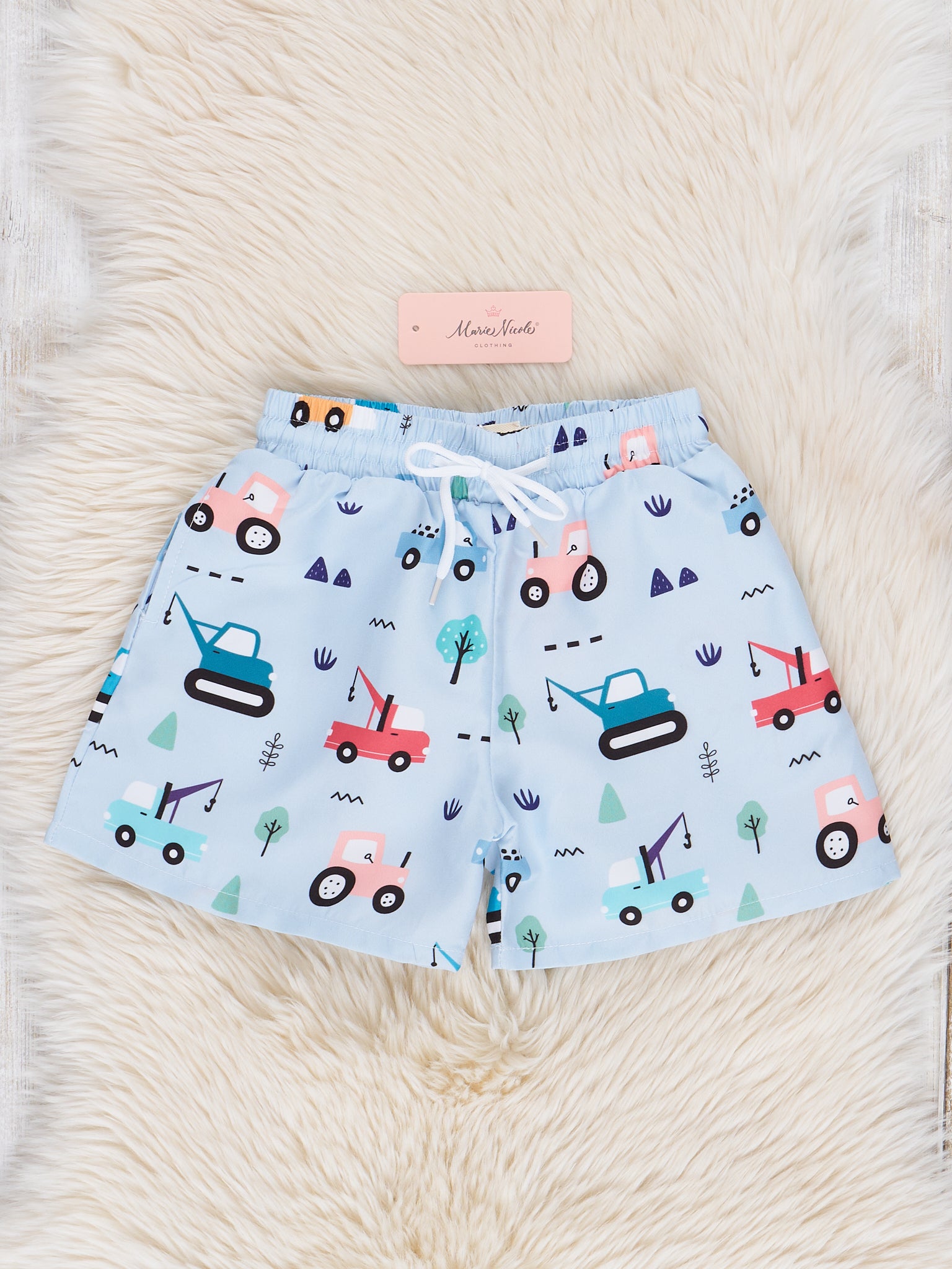 Get your little one ready for some fun in the sun with our Cruising Around Swim Trunks from Marie Nicole Clothing! These light blue trunks are perfect for a summer day at the pool, featuring a playful print that will have your child feeling like they're cruising through the water. Print features heavy equipment like tractors, trucks, excavators, and tow trucks. Check out the matching sibling set!