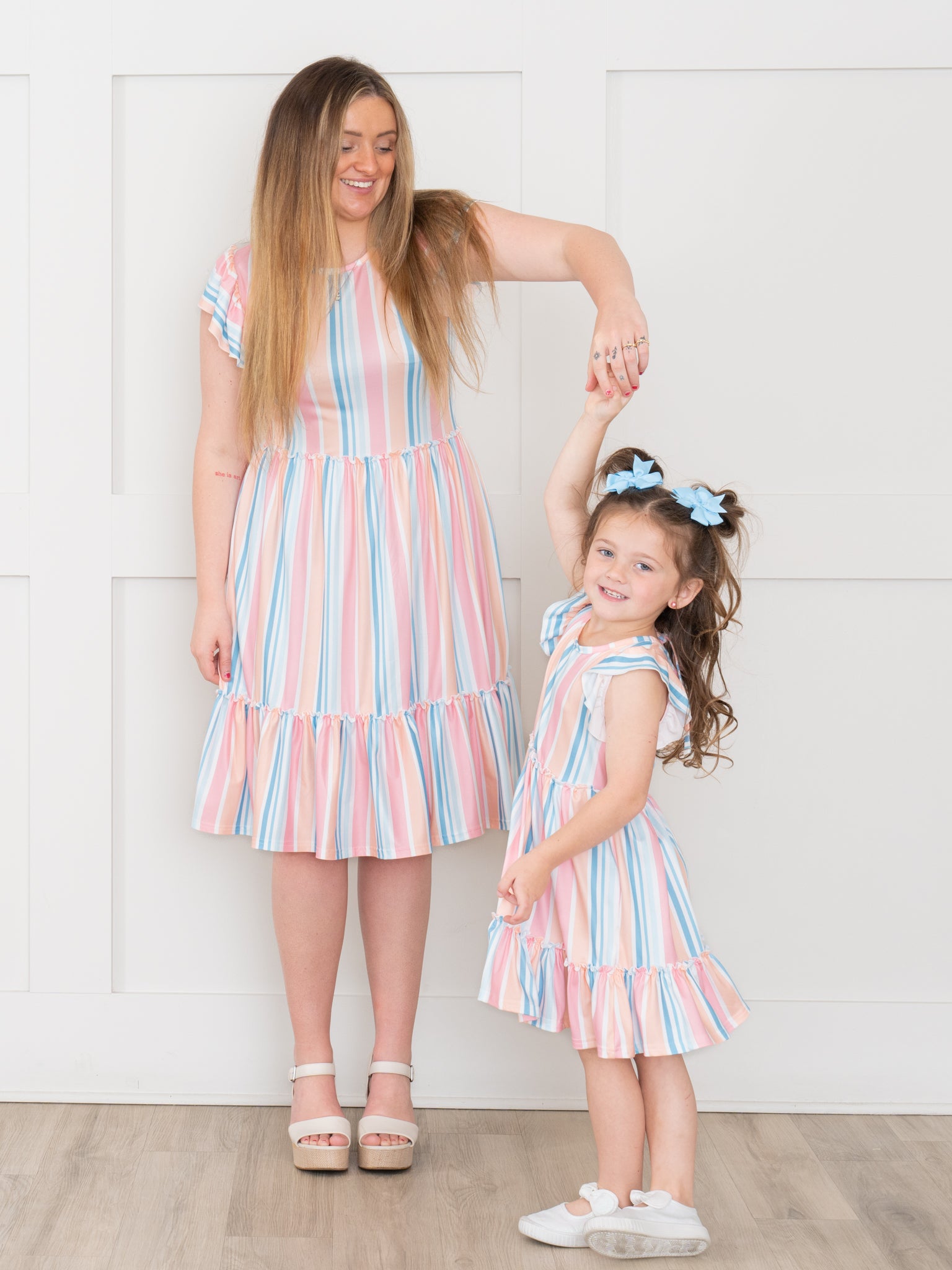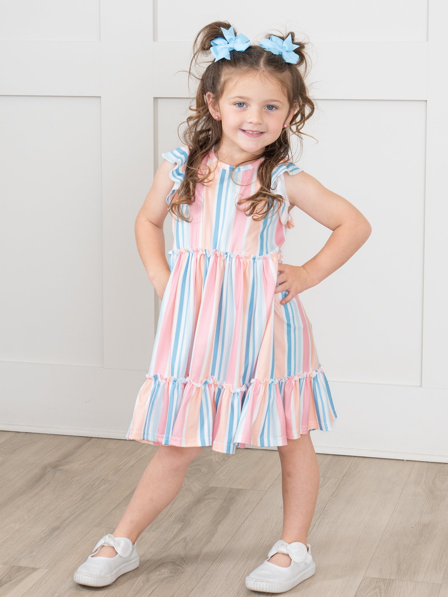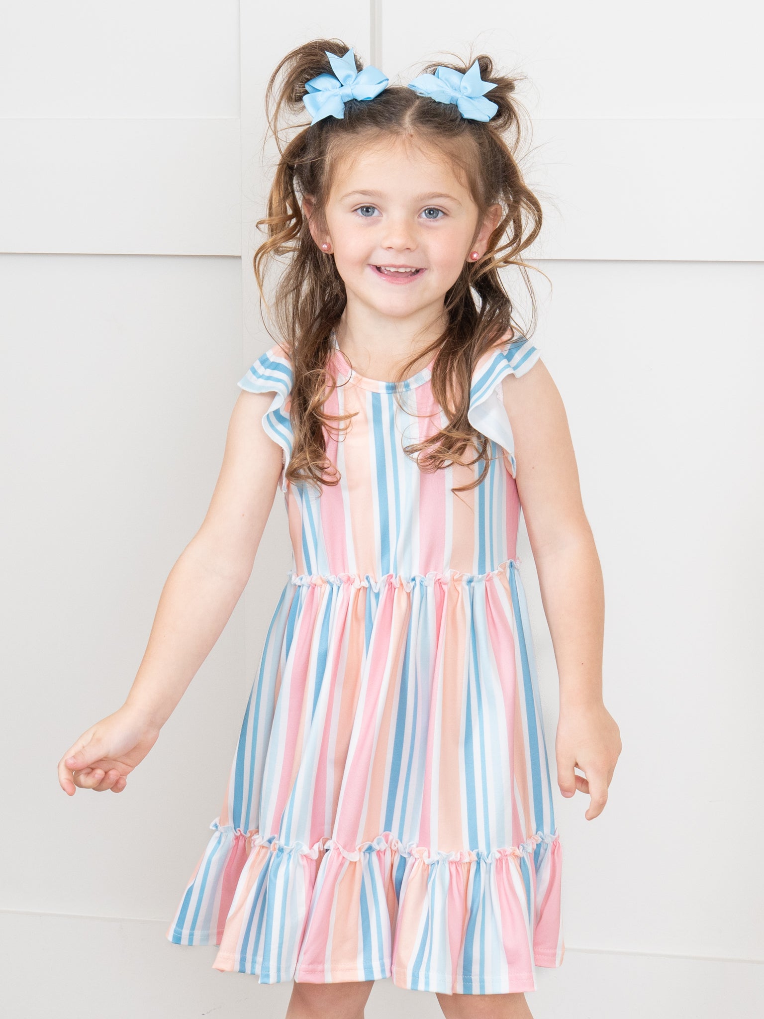 This Day Bloom Tiered Stripe Ruffle Dress by Marie Nicole Clothing features the sweetest stripes & ruffle trim for a beautiful family match. With colors inspired by flower petals and the brightness of spring, this soft, comfy one-piece is perfect for warmer weather. The stylish tie neck make it extra cute. As a Mom & Me set, it is perfect for family matching!