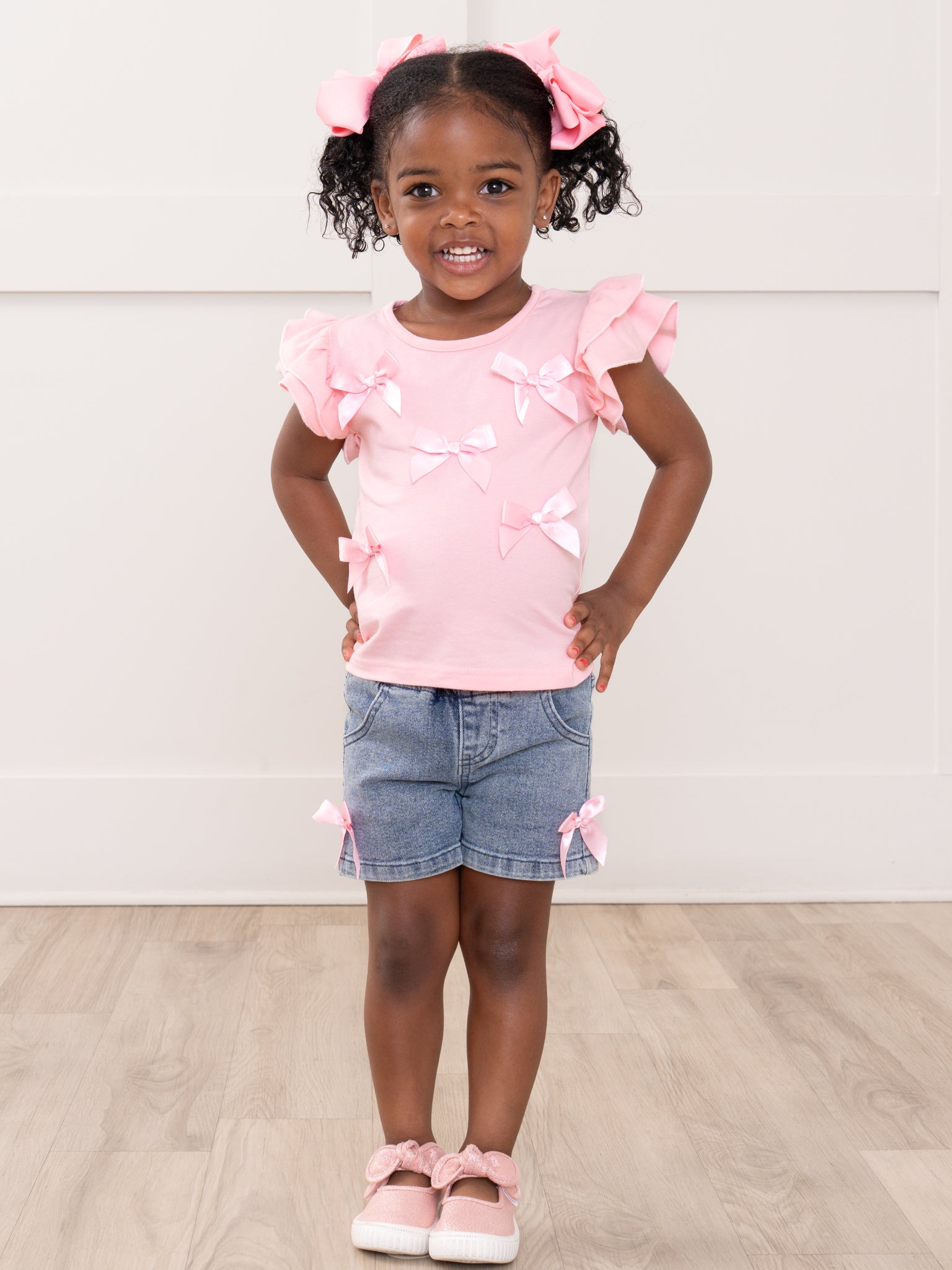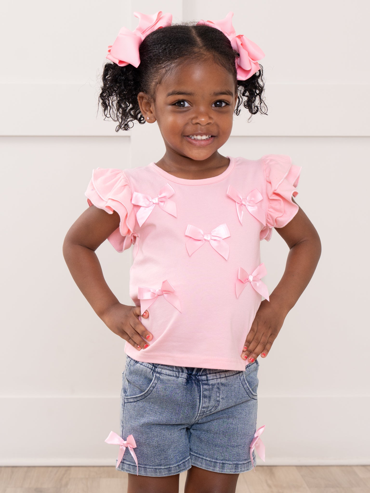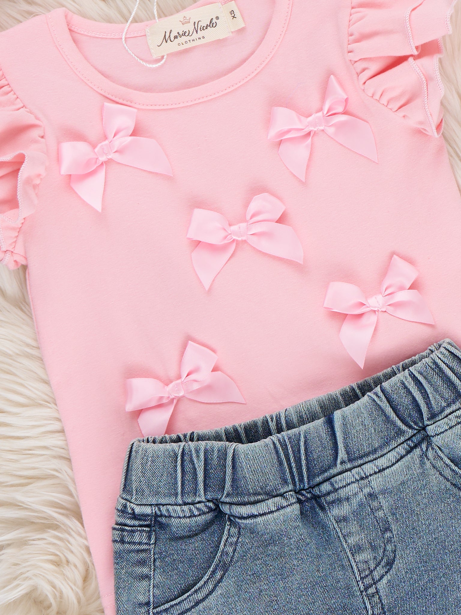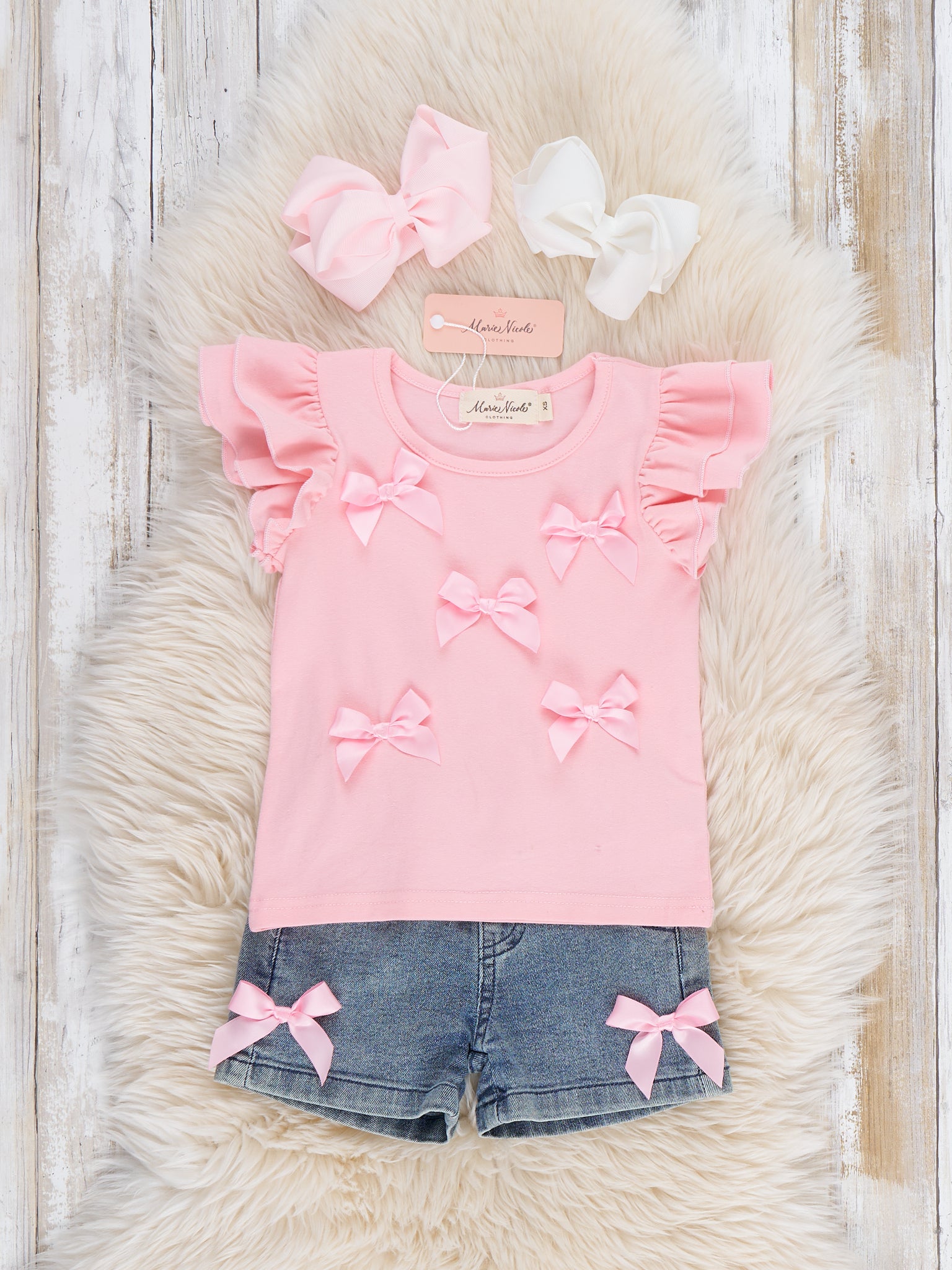 The Denim & Ribbons Ruffle Outfit by Marie Nicole Clothing blends sweet details with everyday charm. Featuring a ruffle-sleeve top adorned with delicate bow accents and paired with comfy denim-style shorts finished with matching bows, this outfit is designed for easy movement and all-day comfort. Perfect for playdates, family outings, and picture-ready moments, it offers a polished yet playful look.