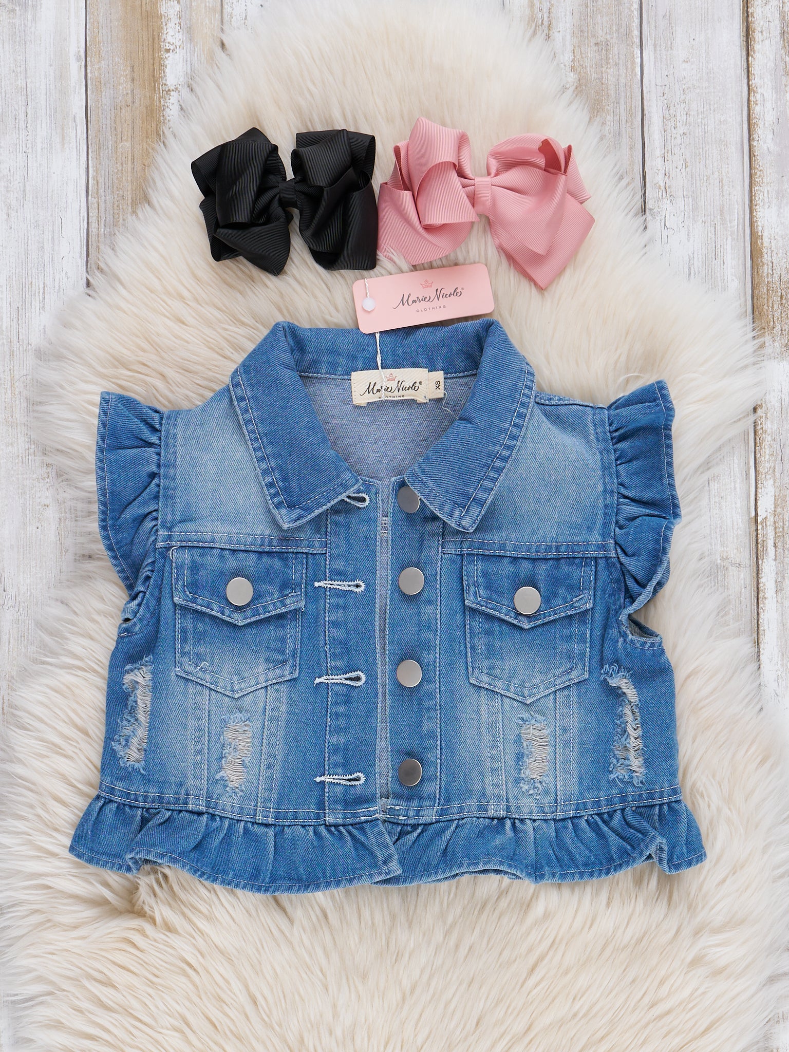 This adorable denim vest is the perfect layering piece for your little one’s wardrobe. Featuring cute ruffle sleeves and stylish frayed hem detailing, this vest adds a trendy touch to any outfit. With its button-front design, it’s easy to wear and pairs beautifully with dresses, skirts, or leggings.