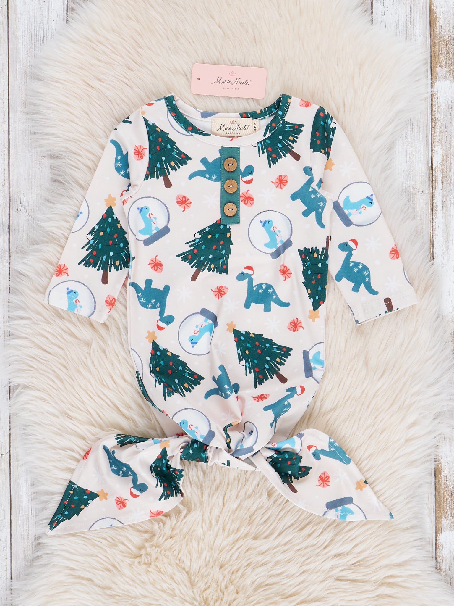 Brighten up the holiday season with our Dinosaurs & Evergreens Raglan Knot Gown for baby! This playful gown features a fun Christmas print of dinosaurs and trees with a knot closure with room for baby to grow. Get ready for some festive fun! Let all your littles match this season with this sibling set!
