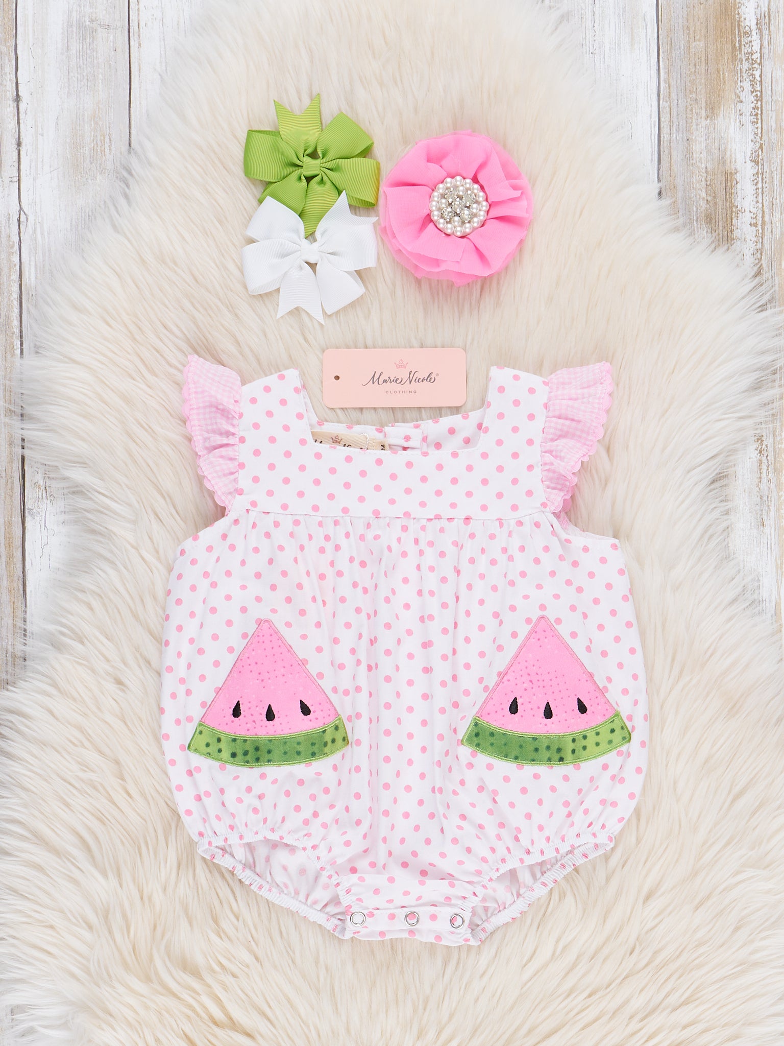 Sweeten up her summer wardrobe with the Dotty Watermelon Embroidered Flutter Bubble from Marie Nicole Clothing! This charming bubble features a playful polka dot pattern and vibrant watermelon embroidery that captures the essence of warm-weather fun. The ruffle-trimmed sleeves add a touch of whimsy and flair, perfect for picnics, playdates, or picture-perfect moments.