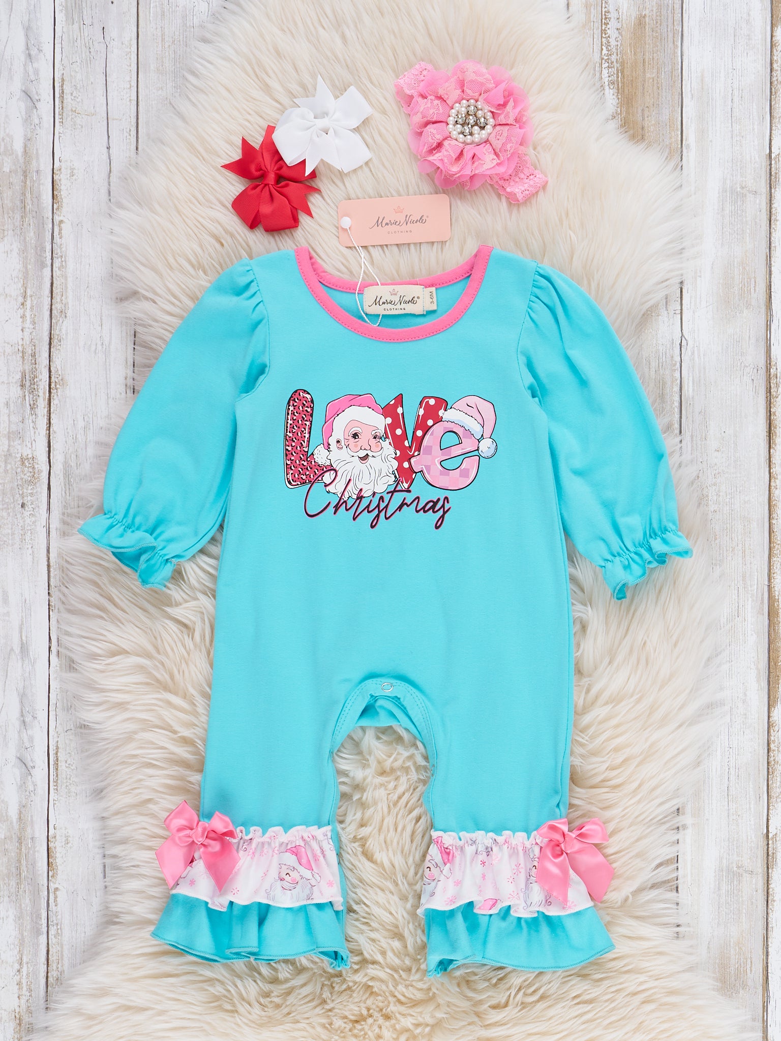 The Dreamy Christmas Love Romper by Marie Nicole Clothing features playful ruffle cuffs and a sweet, printed “Love Christmas” graphic, bringing cheerful style to every festive occasion. Crafted from soft, stretchy fabric with whimsical layered details at the ankles, this romper is perfect for cozy holiday moments and joyful playtime.
