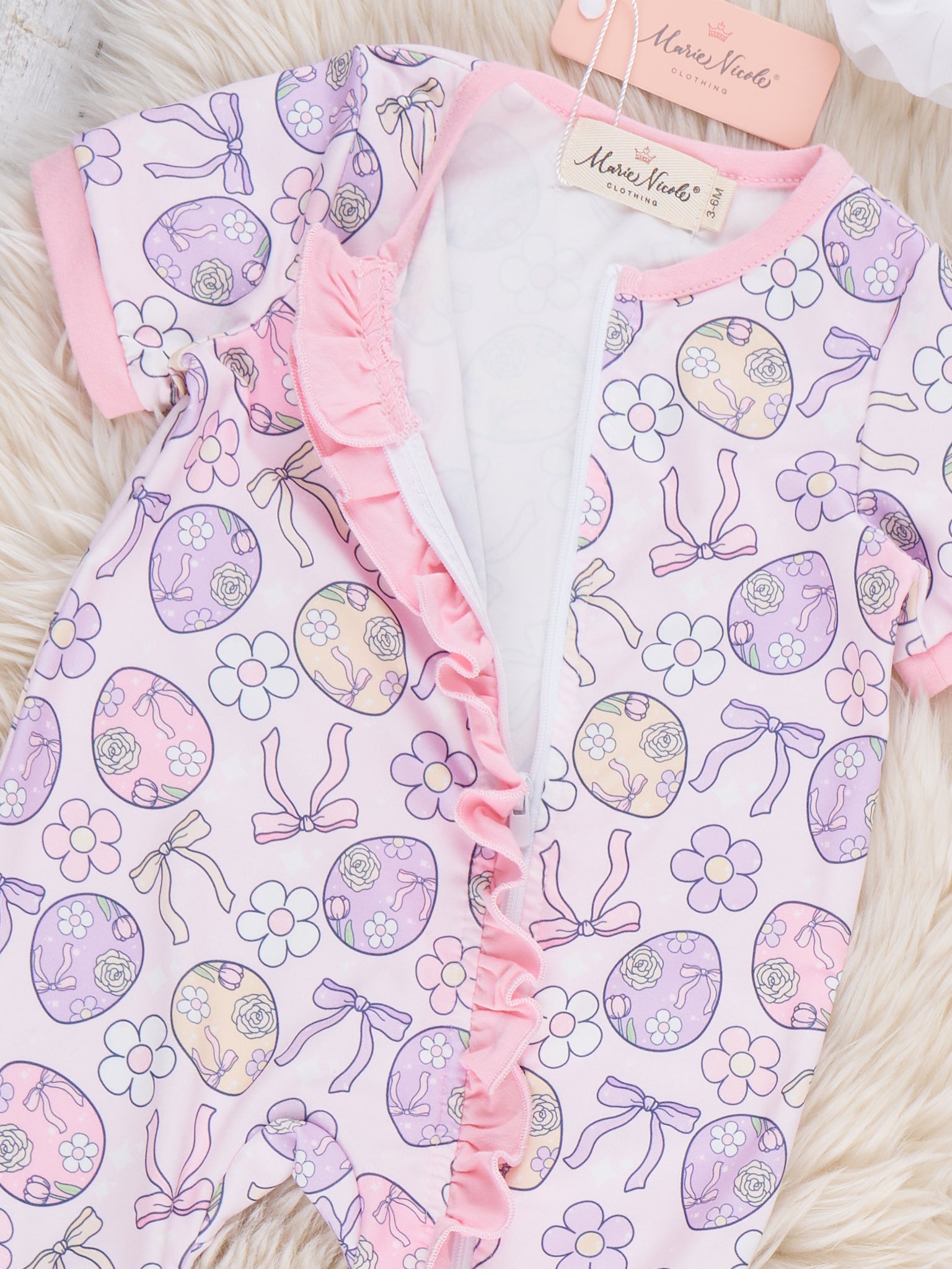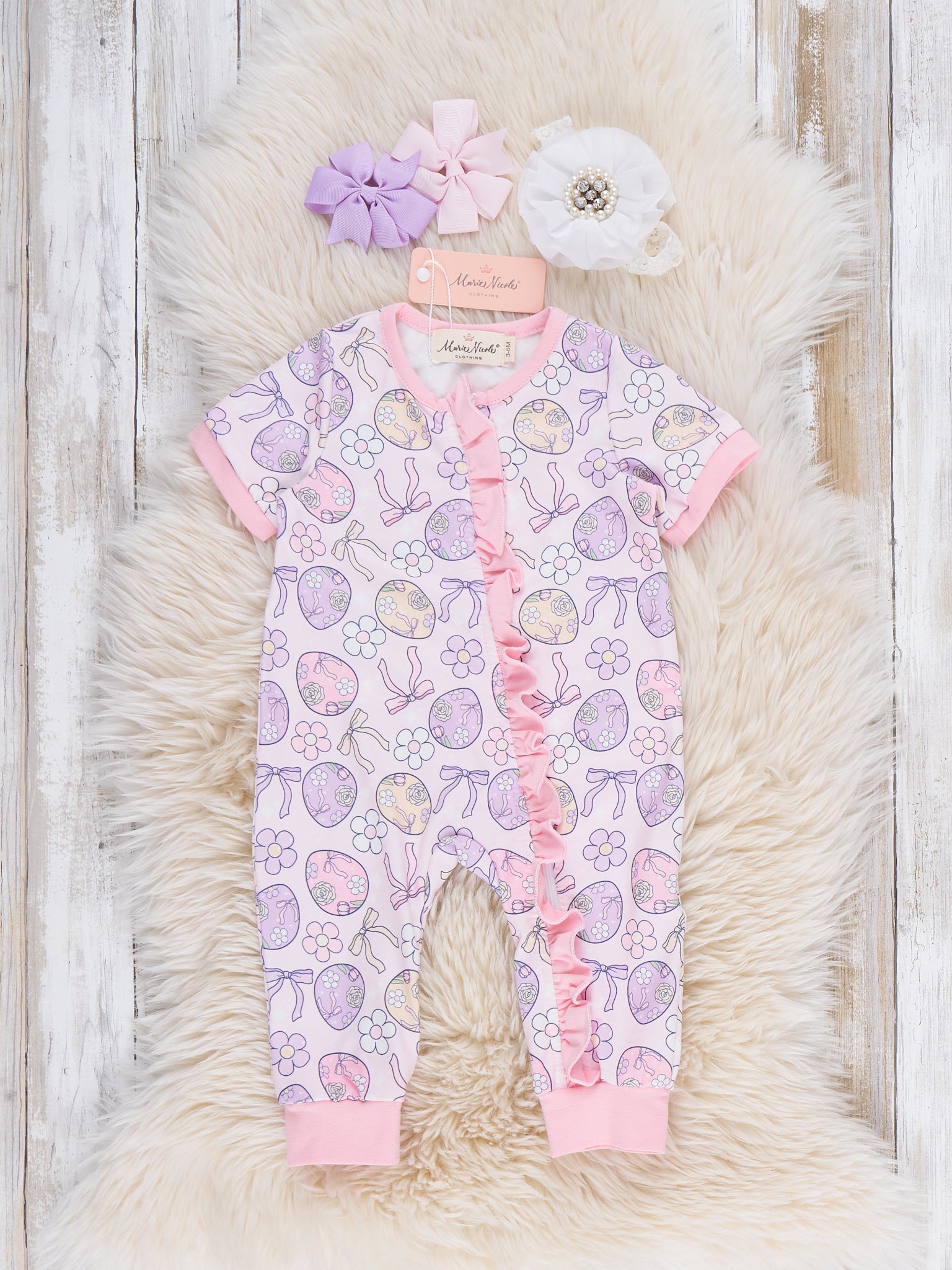 Eggs Galore Ruffle Sleeper Pajamas by Marie Nicole Clothing are a cozy one-piece sleeper in a pastel Easter-egg print with contrast trim and a ruffle-edged front placket. Soft knit fabric, cuffed ankles, and easy snaps keep baby snug and make middle-of-the-night changes simple for Easter and all spring long.