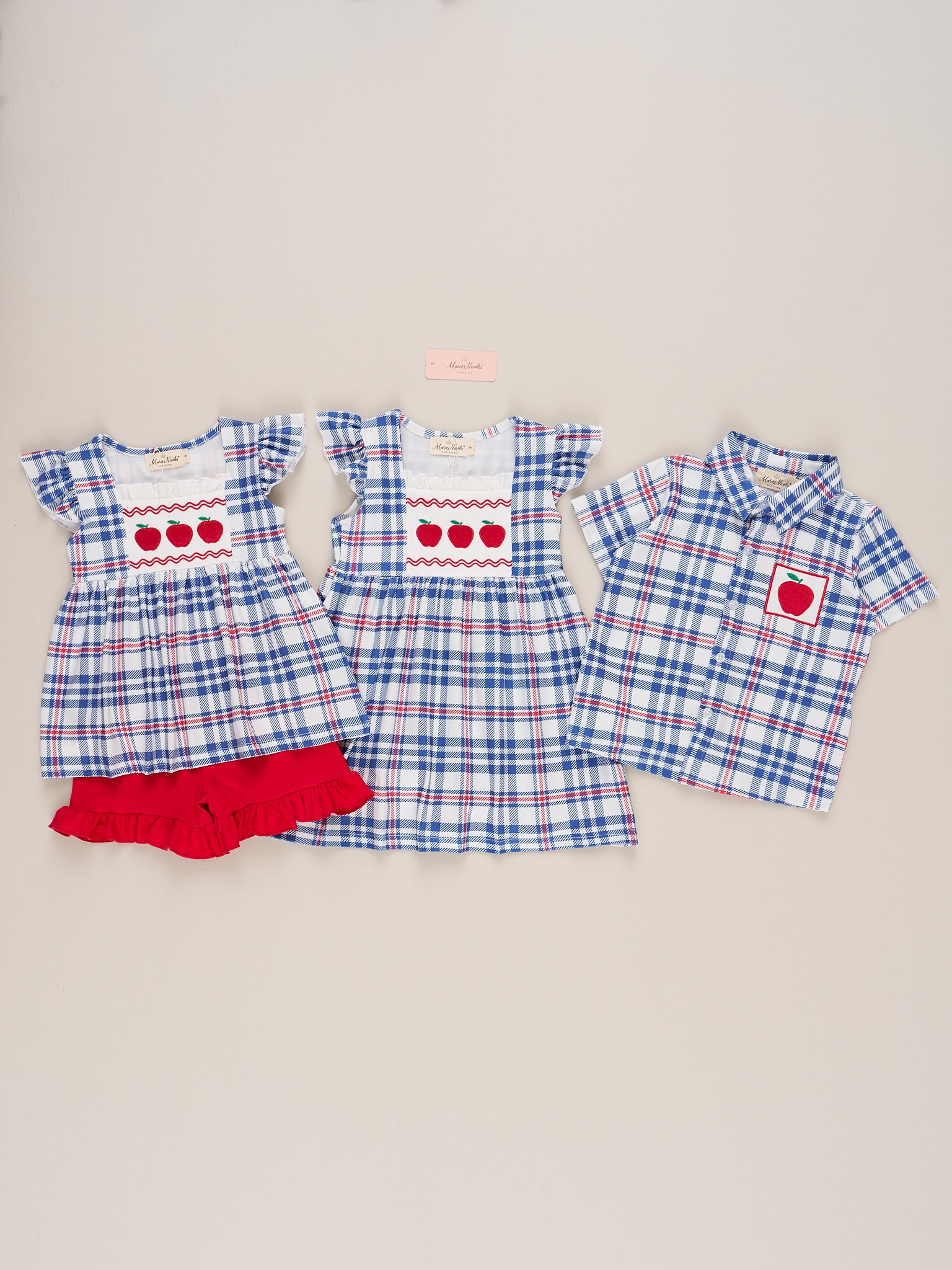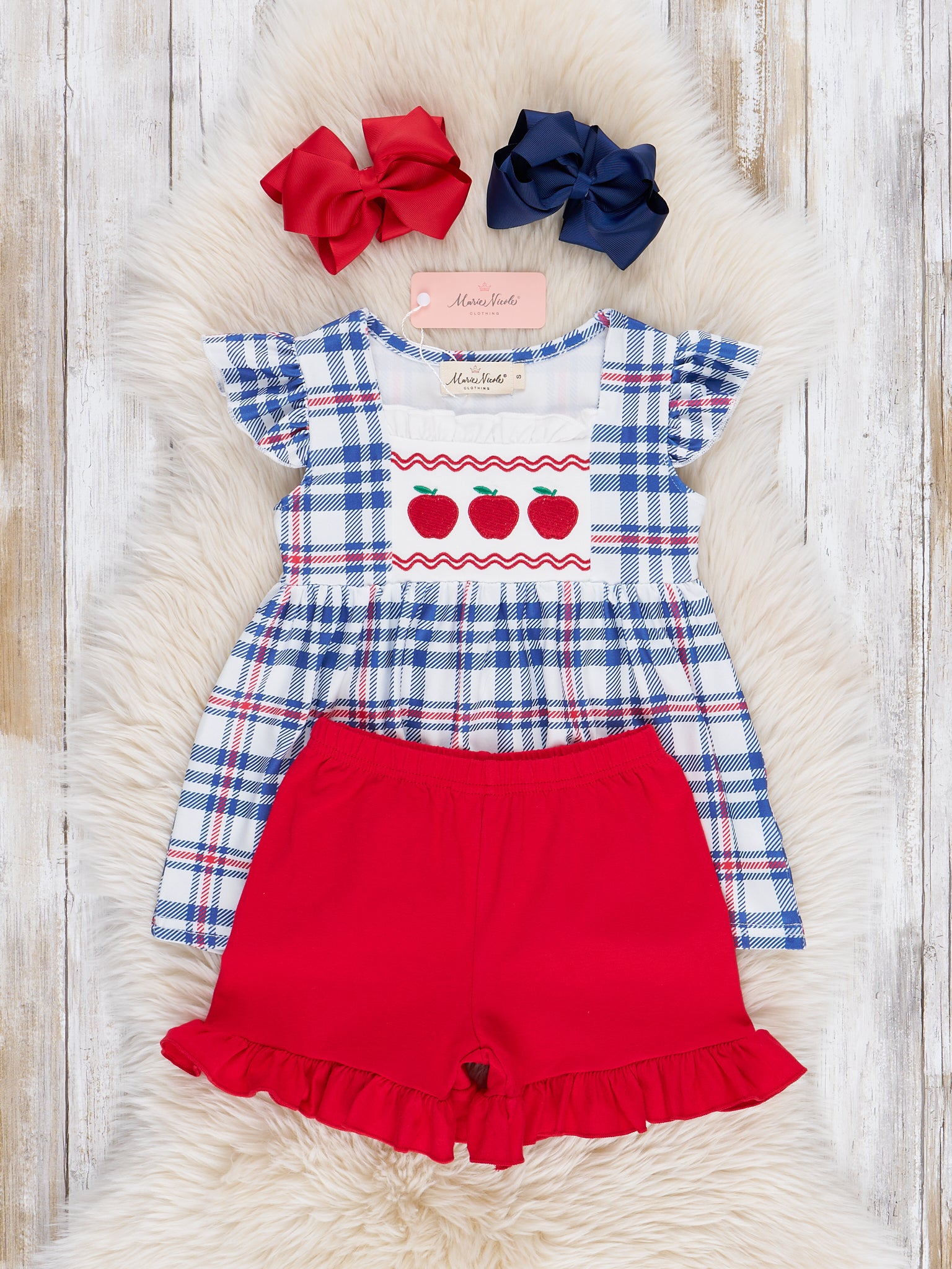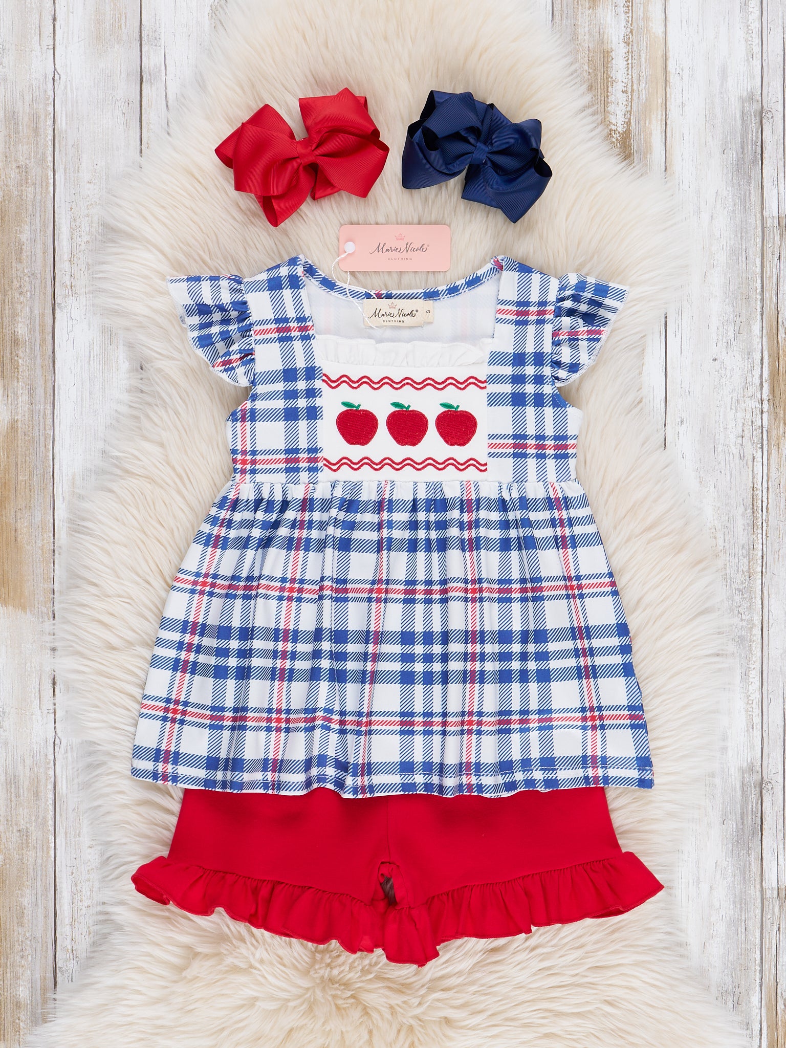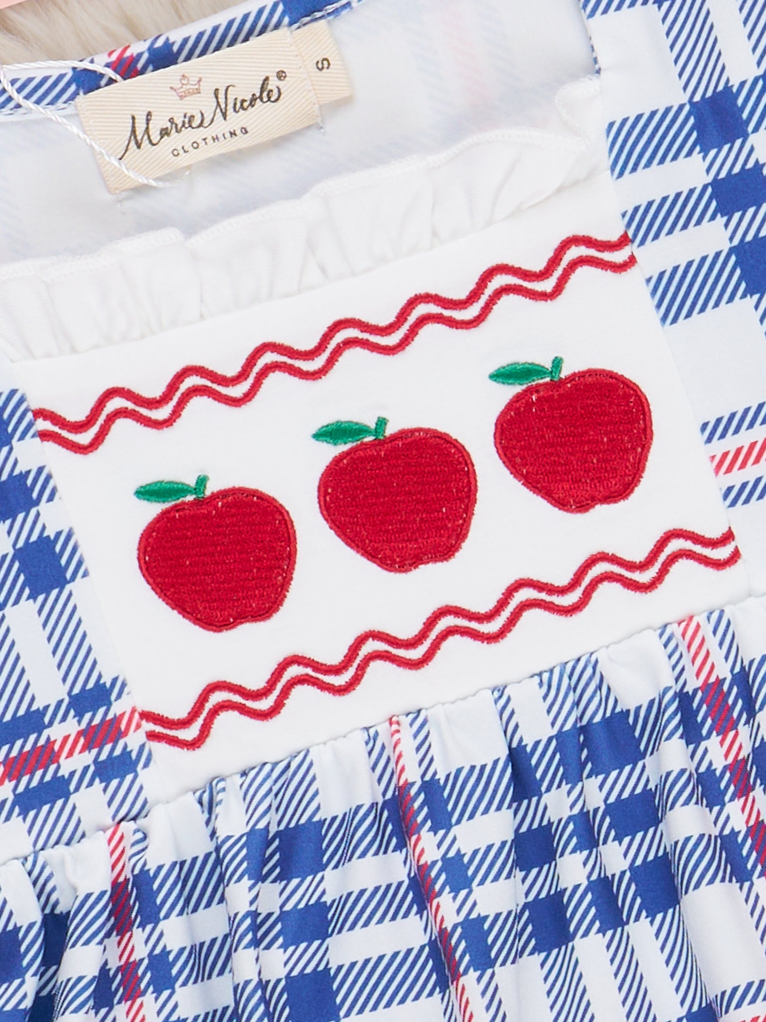 The Embroidered Apples School Plaid Ruffle Outfit is a classic and charming choice for back-to-school and beyond. Featuring adorable apple embroidery paired with timeless plaid and finished with soft ruffle details, this outfit from Marie Nicole Clothing combines playful style with comfortable wear. Lightweight and breathable, it’s perfect for classroom days, family photos, or any occasion she wants to look effortlessly sweet.