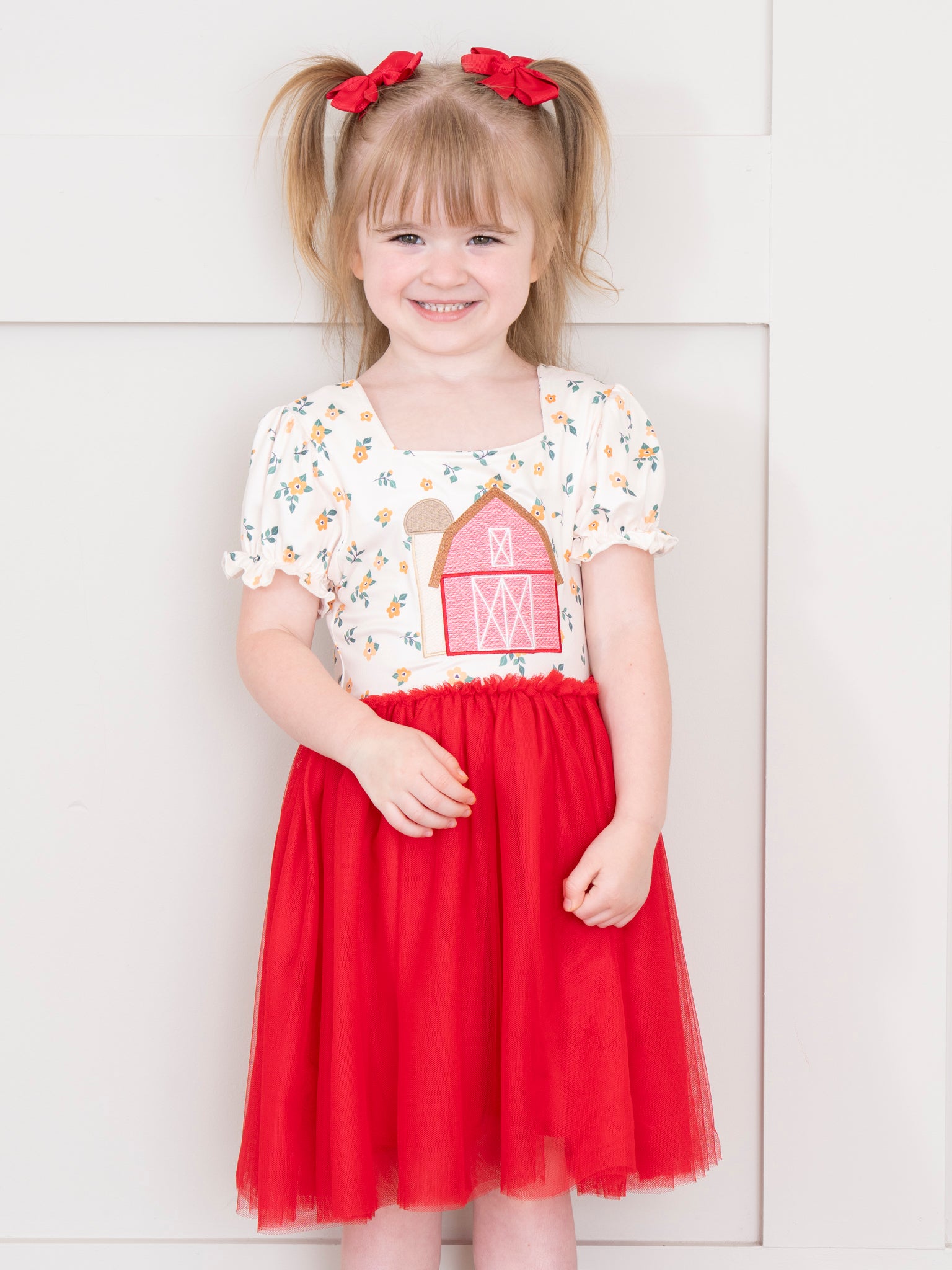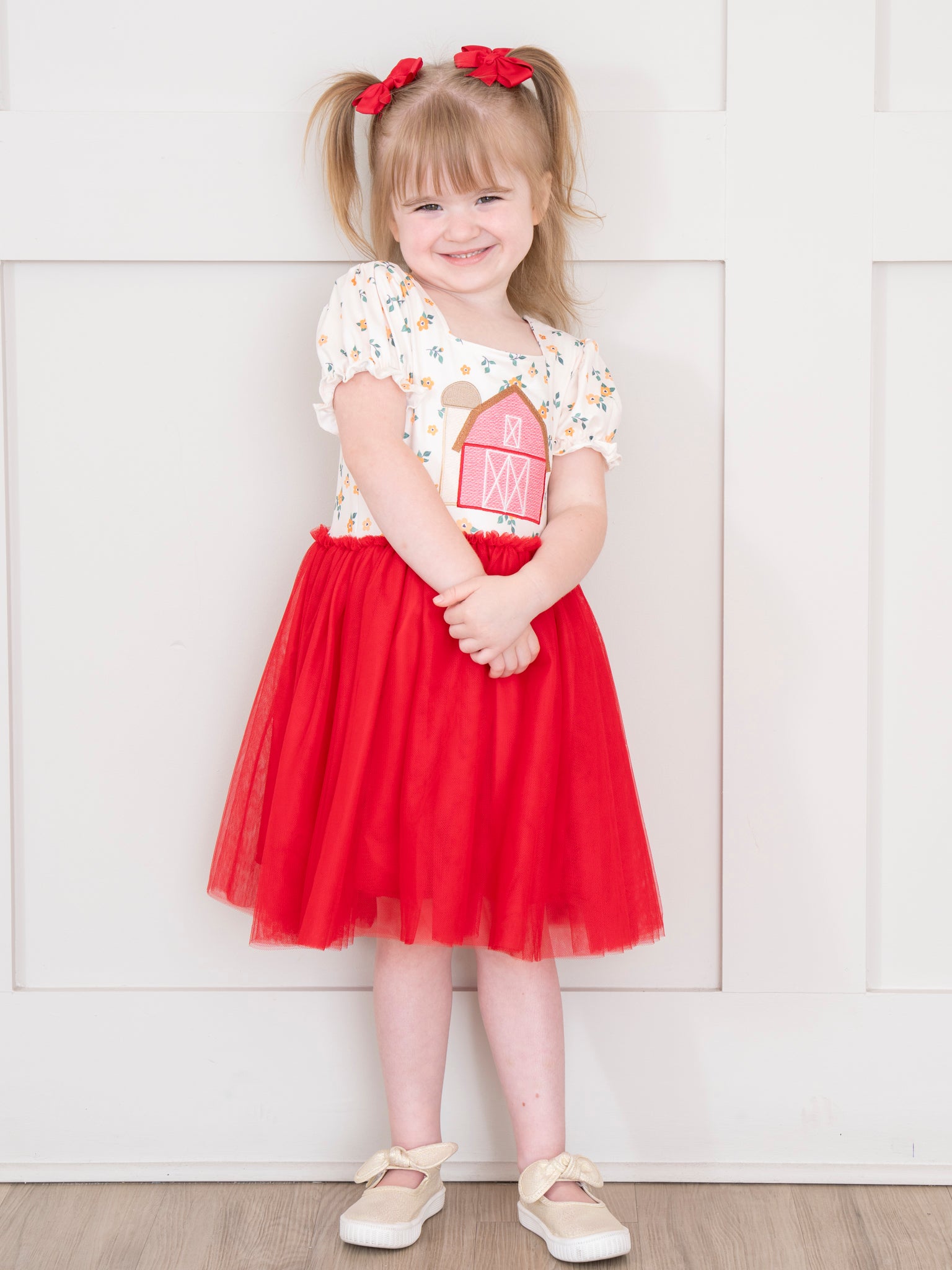 The Embroidered Barn Tulle Dress from Marie is a darling dress featuring a charming barn embroidery and soft layers of tulle for a playful, farm-inspired touch. With its gentle fabric, it's as comfy as it is cute—perfect for special occasions or everyday fun.