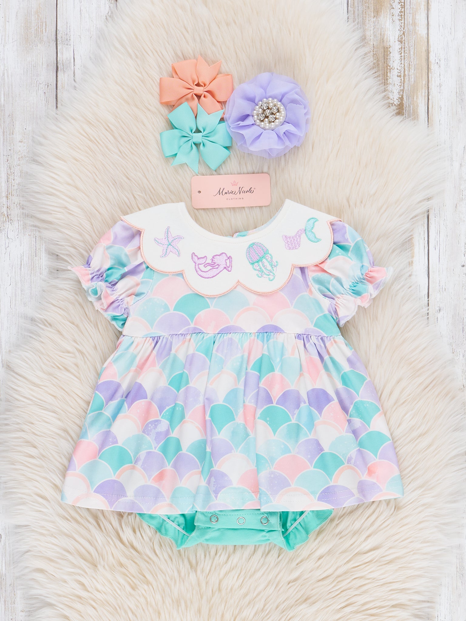 The Embroidered Mermaid Life Ruffle Bubble is a magical one-piece featuring whimsical mermaid embroidery and soft ruffle accents for a playful, ocean-inspired look. From Marie Nicole Clothing this bubble is perfect for sunny days and seaside adventures.