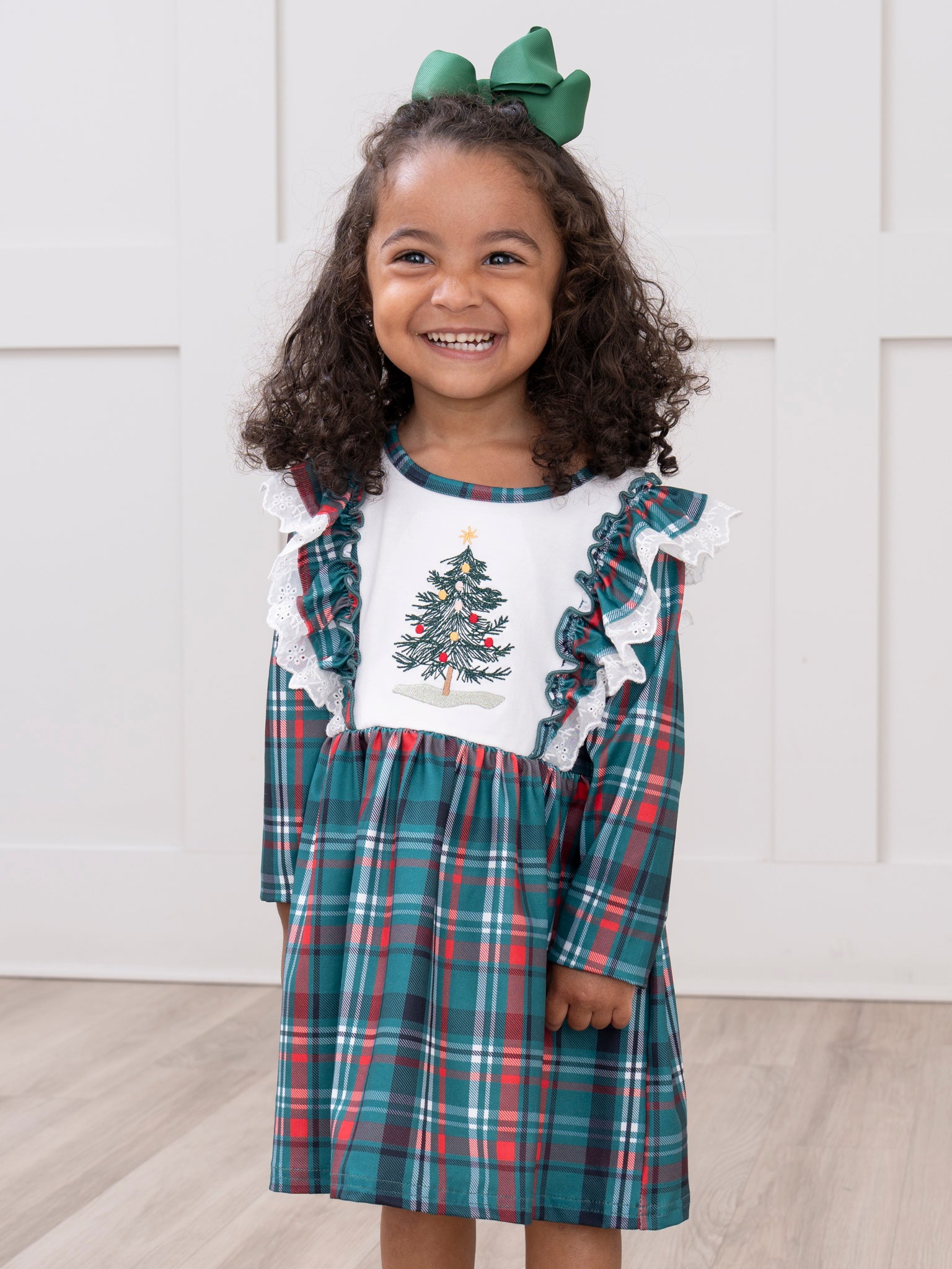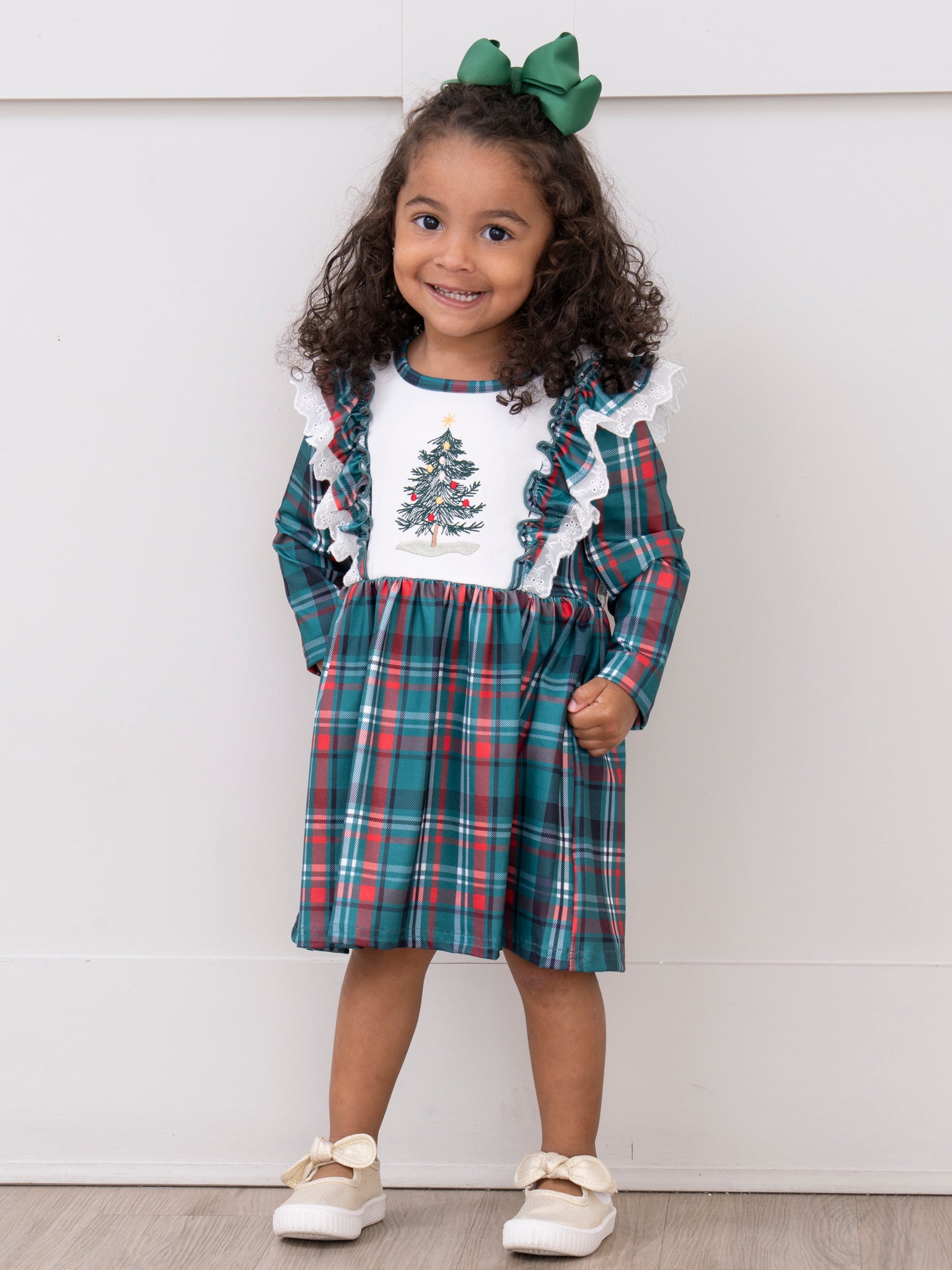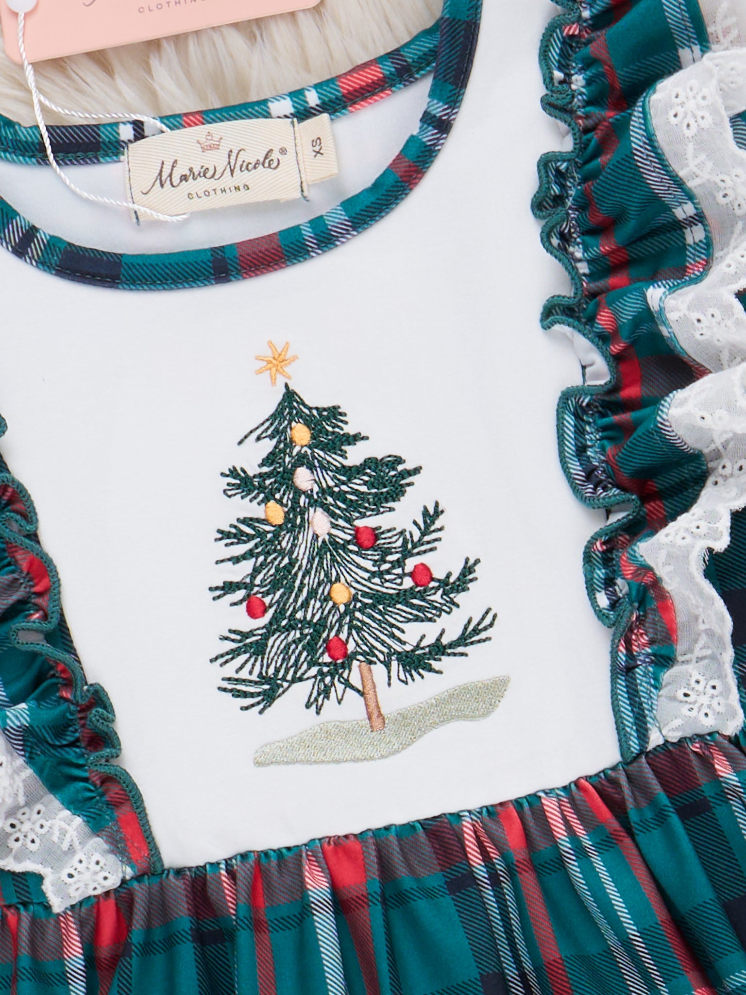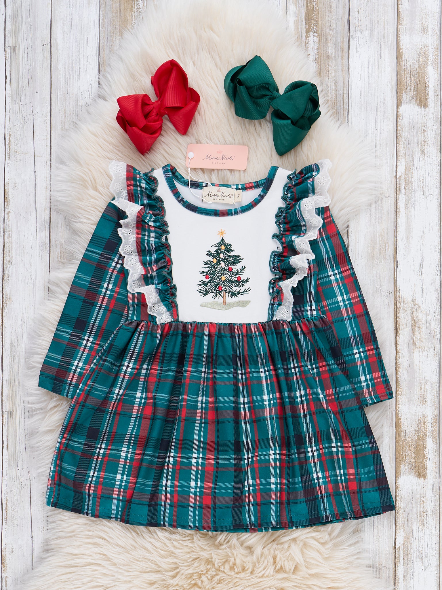 The Evergreen Plaid Embroidered Dress blends timeless style with delicate details, featuring a classic plaid pattern, charming ruffle trim, and an embroidered tree accent. Crafted by Marie Nicole Clothing, this dress is designed for comfort and elegance, perfect for seasonal celebrations or capturing holiday portraits with a touch of tradition and playful flair.