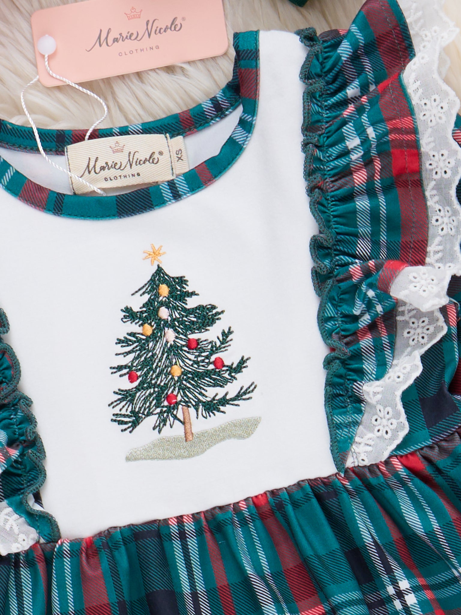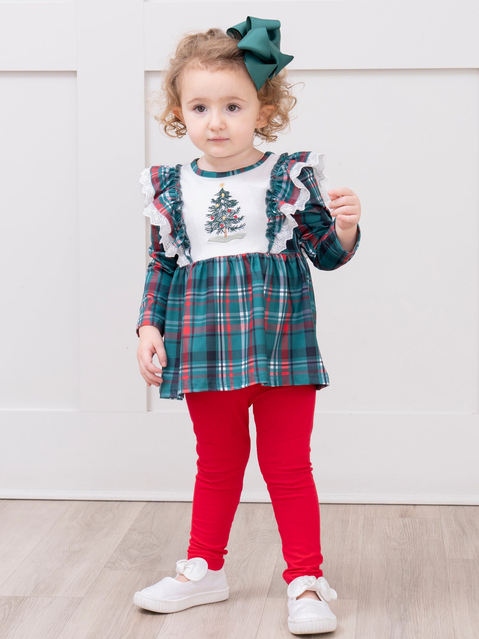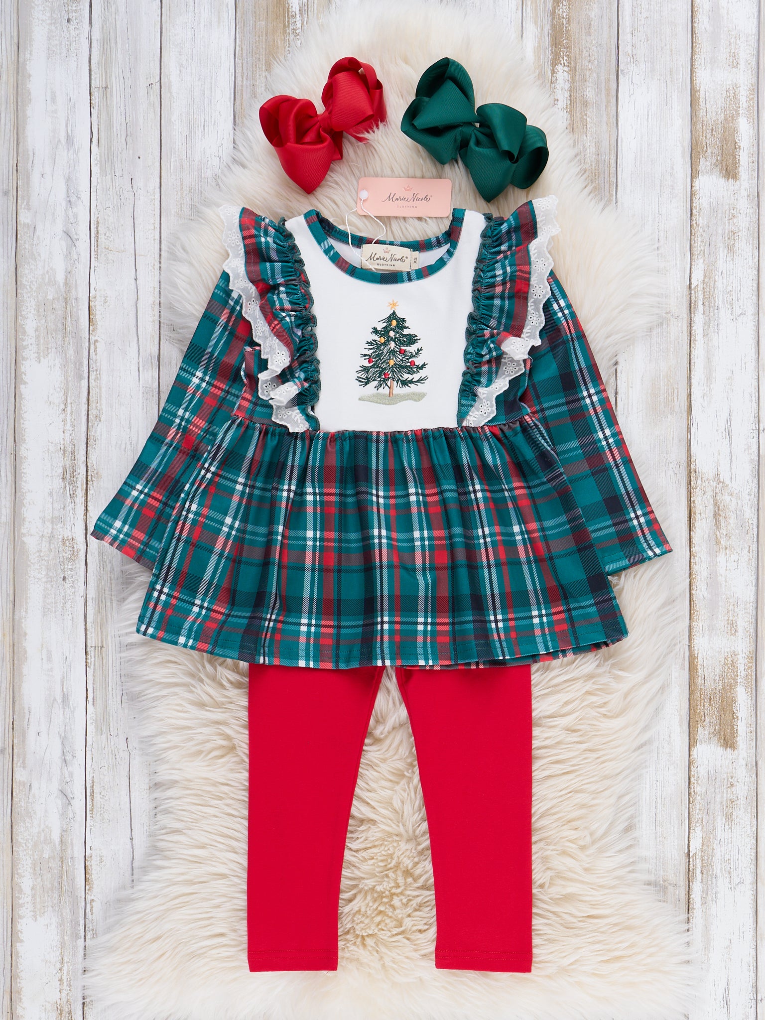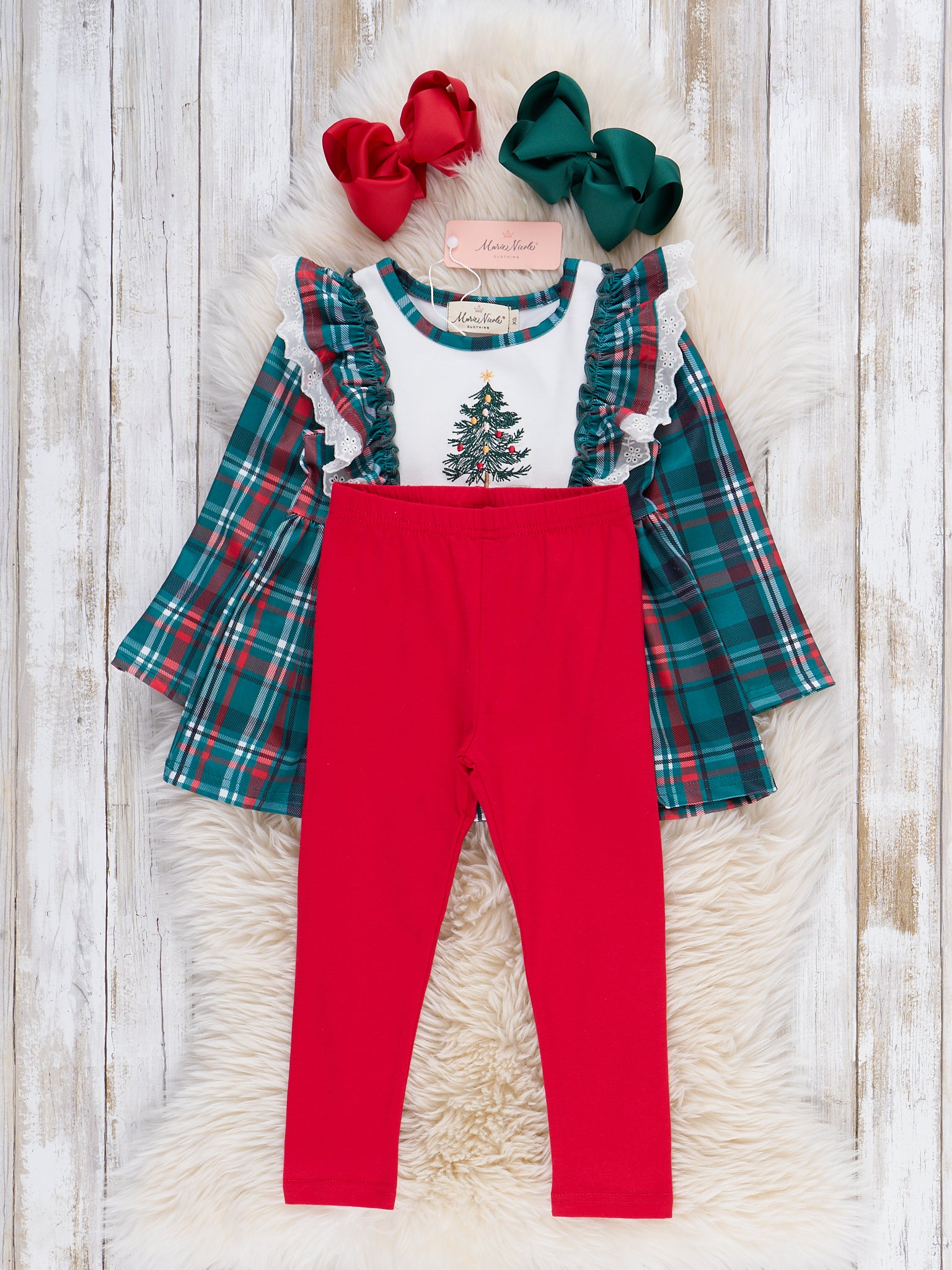 The Evergreen Plaid Embroidered Outfit features a timeless plaid top with festive embroidered details, paired with soft leggings for all-day comfort. Crafted by Marie Nicole Clothing, this charming set offers a classic look and playful design elements, making it perfect for holiday gatherings and seasonal celebrations with a touch of tradition and style.