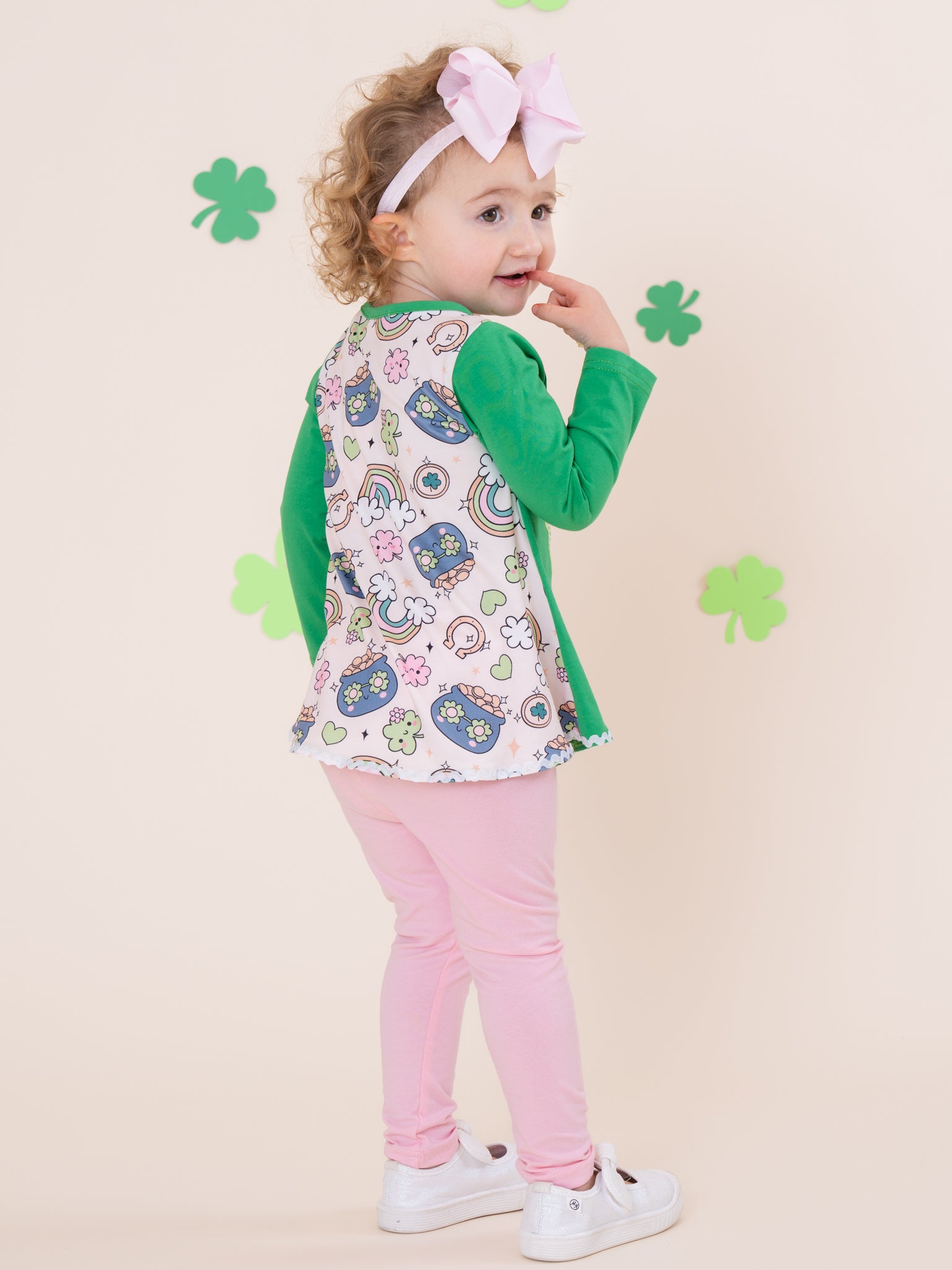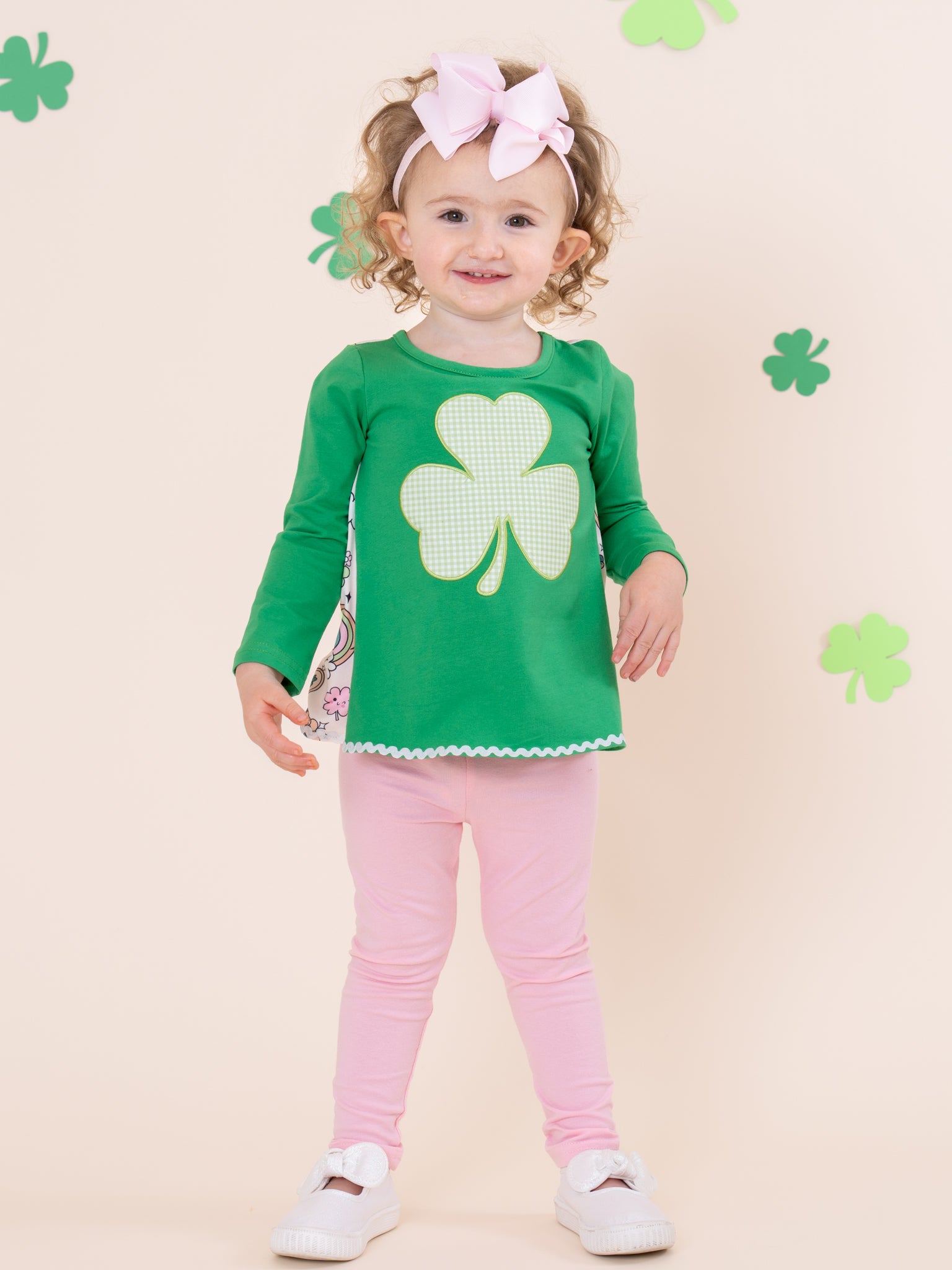The Ever-Lucky Celebration Embroidered Outfit by Marie Nicole Clothing features a cheerful shamrock-embroidered top paired with comfortable, stylish bottoms and a distinct back design. This set is designed for festive fun and everyday joy, bringing playful St. Patrick's Day spirit and vibrant charm to your child's wardrobe.