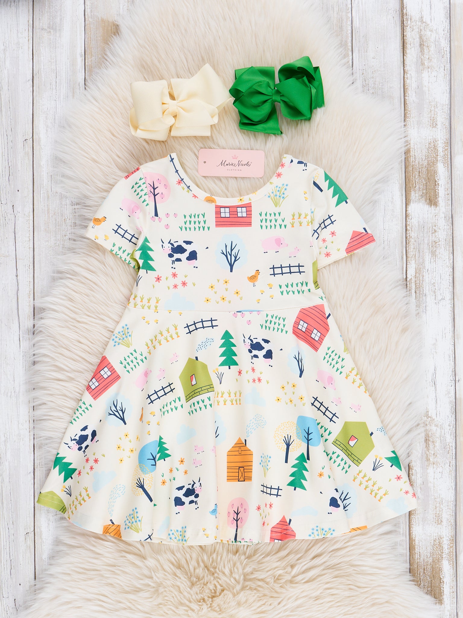 Kick up your farm fashion game with our Farm Fun Swing Dress! Featuring charming barnyard illustration, this dress is sure to turn heads. Perfect for a laid-back day on the farm, this dress adds a touch of whimsy to any outfit. Don't miss out on this unique, playful piece!