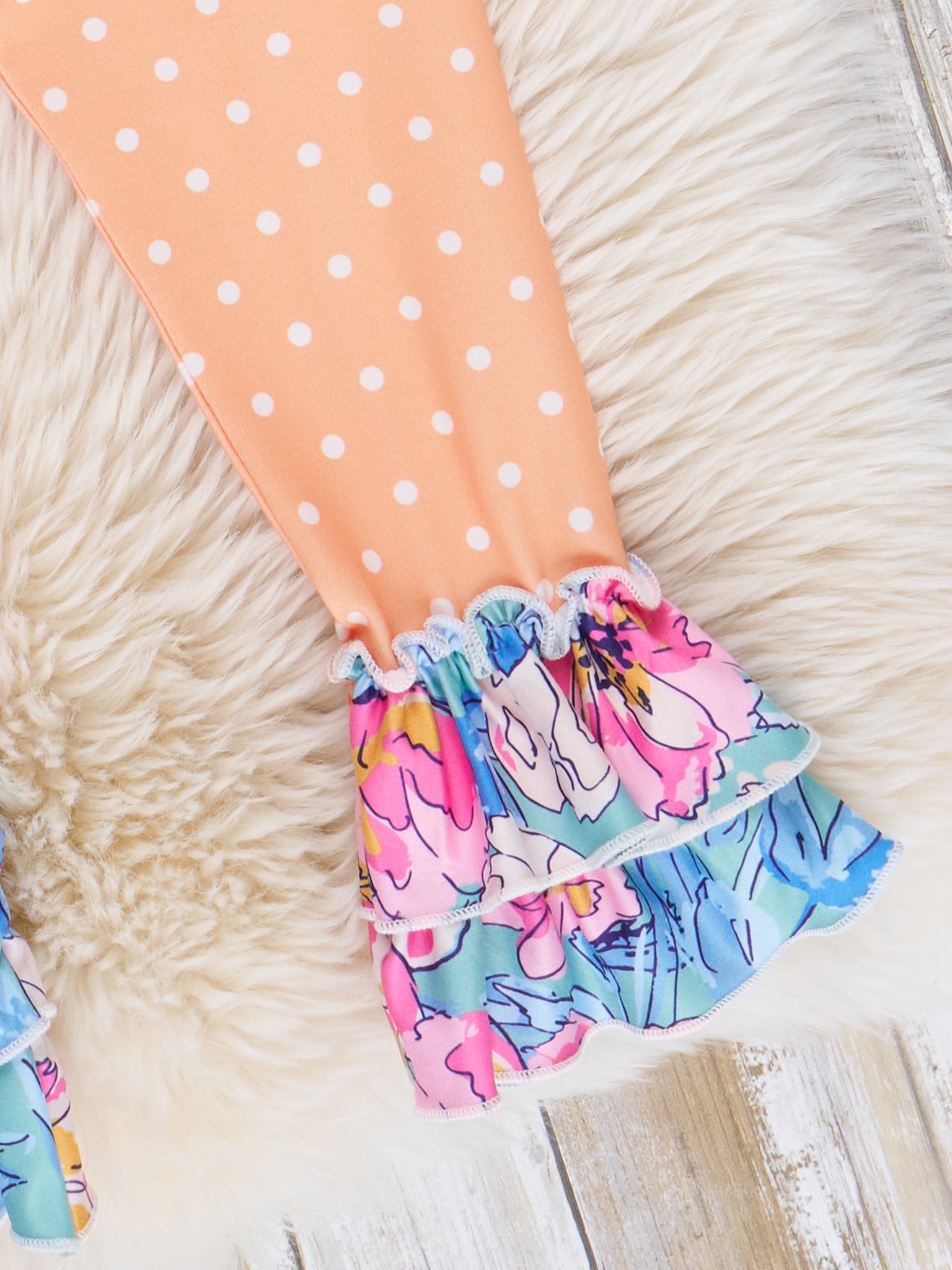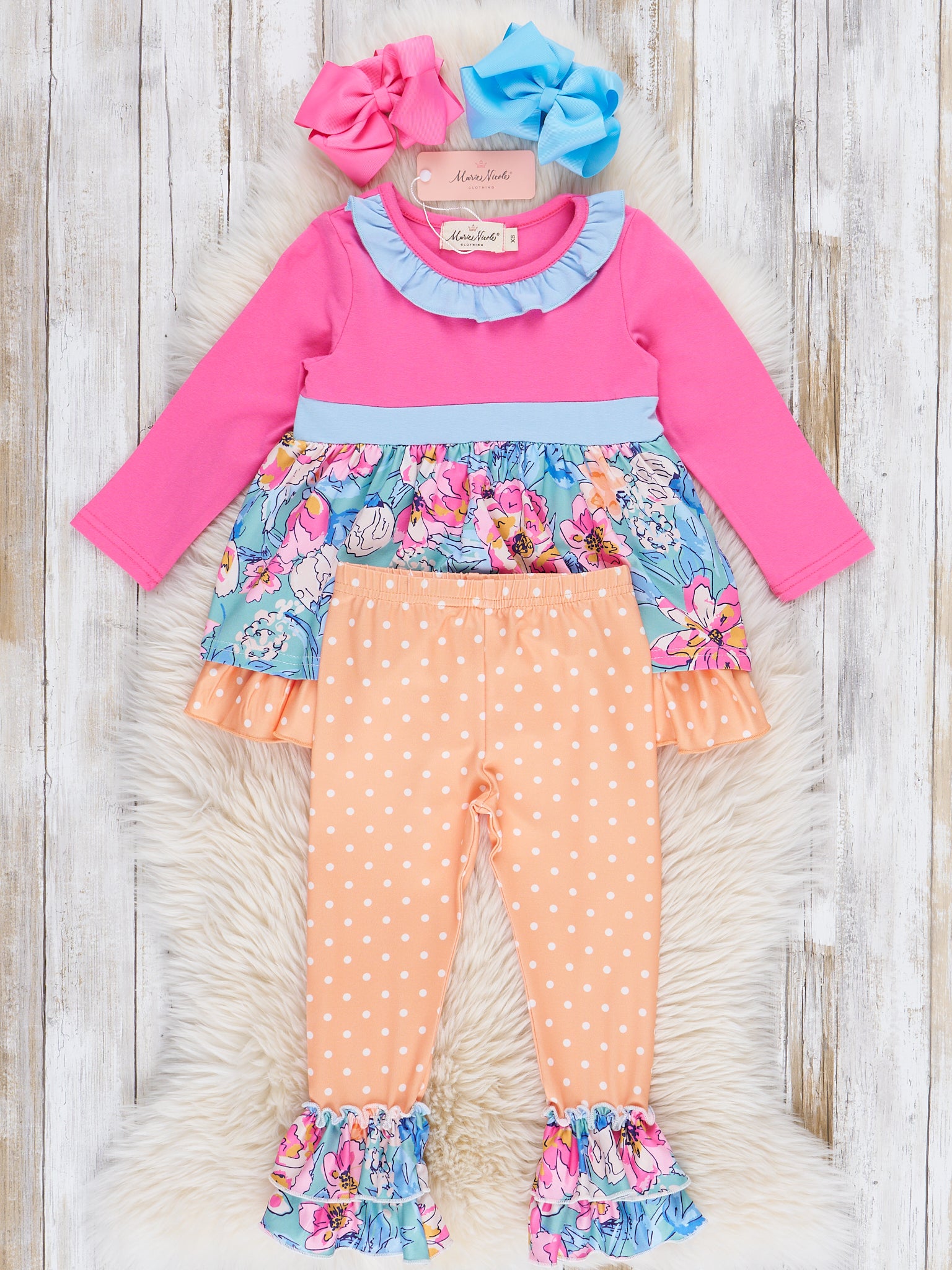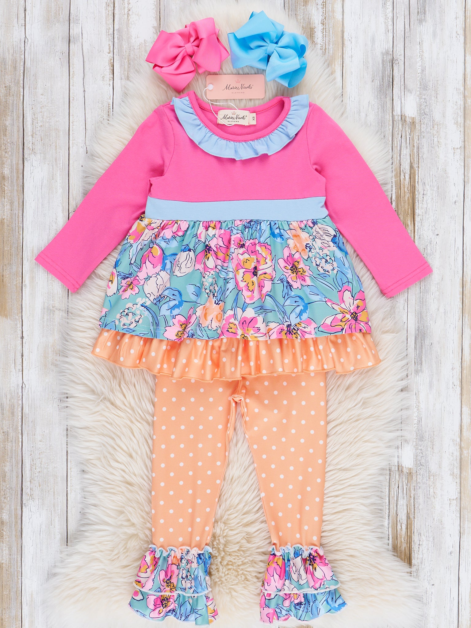 The Floral Daydream Ruffle Outfit is a soft and dreamy choice perfect for sunny days and special moments. Featuring a delicate floral print and finished with gentle ruffle details, this outfit from Marie Nicole Clothing blends timeless charm with lightweight comfort. Ideal for playdates, family gatherings, or twirling through any day she wants to feel like a daydream.