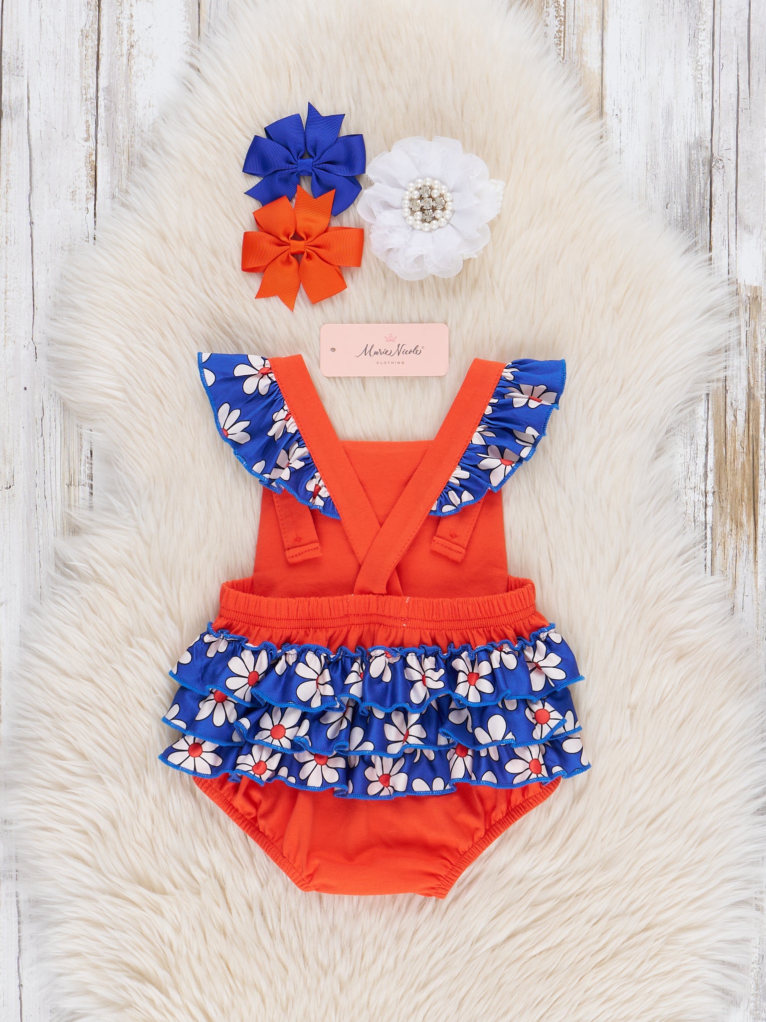The Florida Embroidered Floral Ruffle Bubble is a bright and playful and perfect for sunny days and sweet adventures. Featuring a bold orange color with ruffled floral sleeves and a charming Florida applique, this outfit from Marie Nicole Clothing is ideal for warm weather, family outings, or cheering on your favorite team in style—perfect for game day spirit!