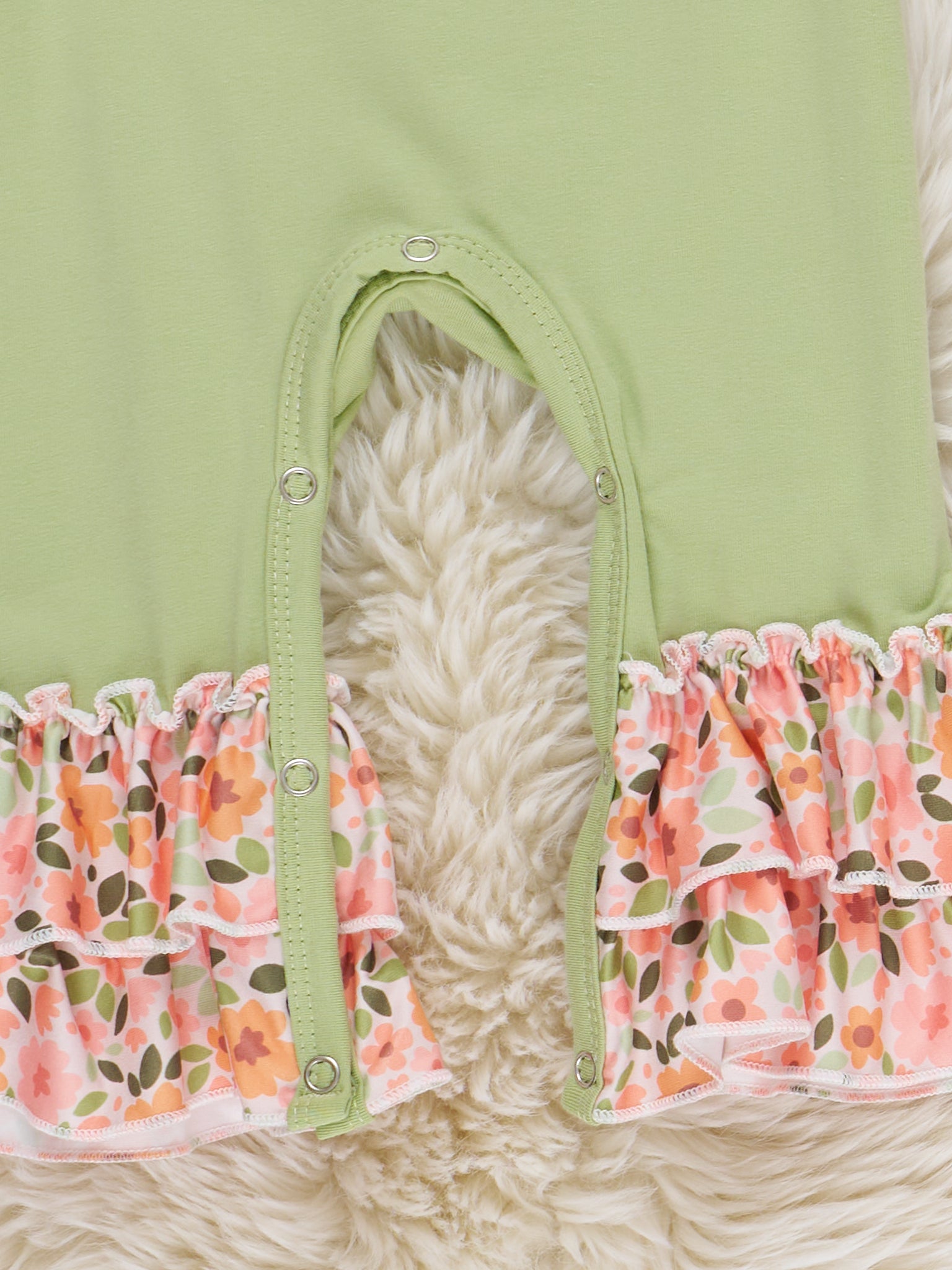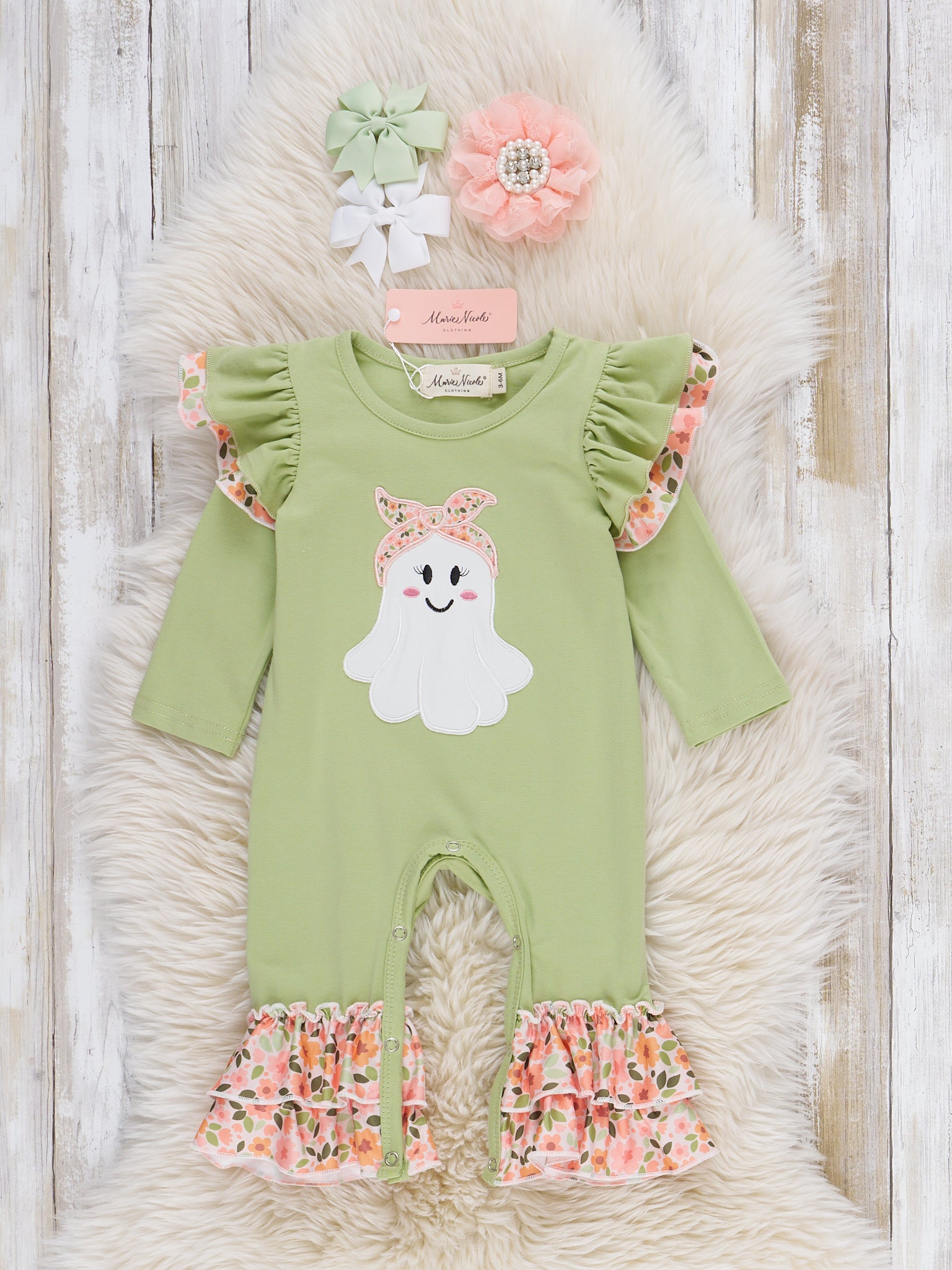 Flowers don't stop blooming in autumn! The Ghostly Frolicking Embroidered Ruffle Romper brings reminders of meadows and sunshine with the adorable ruffles and floral decals, but also of Halloween with the charming embroidered ghost. This one-piece from Marie Nicole Clothing is cheerful to wear for any autumn occasion, indoor or out.