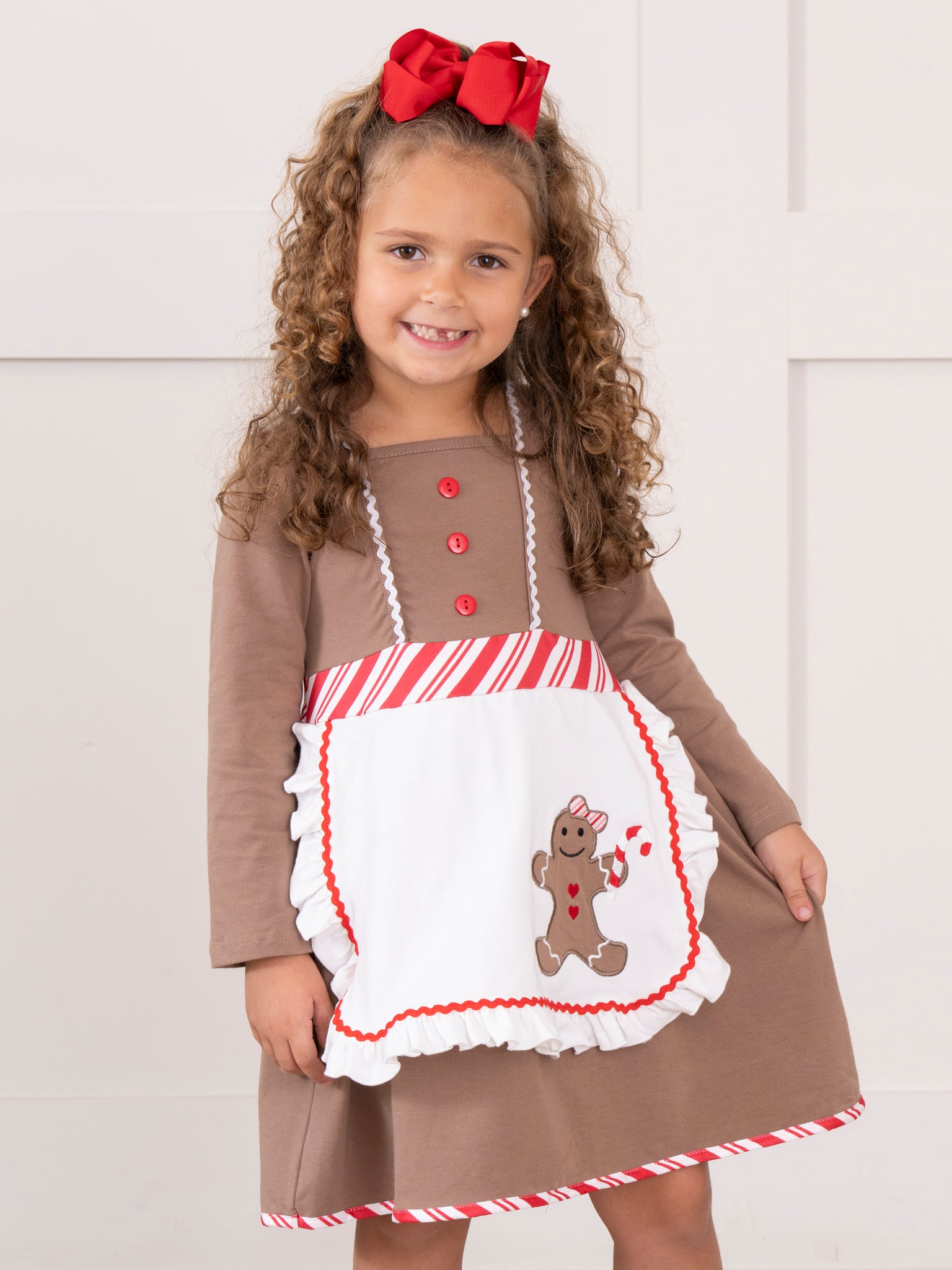 The Gingerbread Baker Embroidered Dress by Marie Nicole Clothing is a delightful holiday piece designed with playful charm. This dress features a faux apron decorated with a sweet gingerbread motif, candy-cane-inspired trims, and button details on the bodice. Perfect for festive baking days, Christmas celebrations, and holiday photos, it brings gingerbread magic to every occasion.