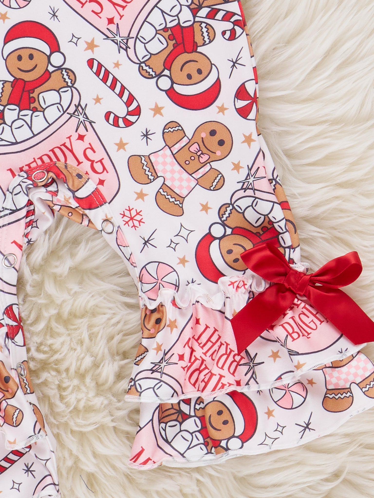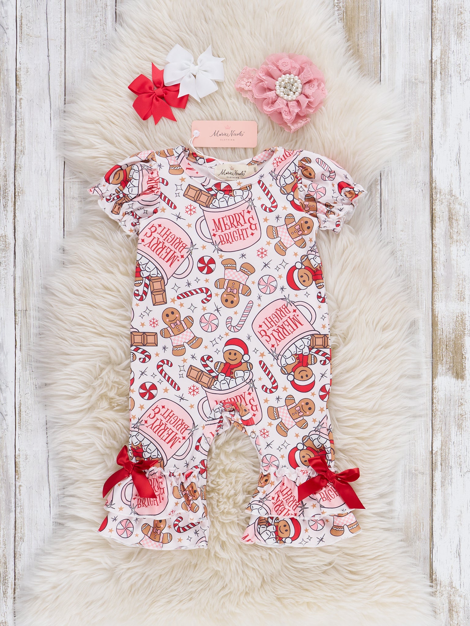 The Gingerbread Spice & Everything Nice Ruffle Romper by Marie Nicole Clothing features a playful allover gingerbread and holiday treats print, with sweet ruffle accents and dainty bows at the ankles. Designed for comfort and festive flair, this adorable romper brings cheerful spirit to holiday gatherings, photos, and cozy celebrations.
