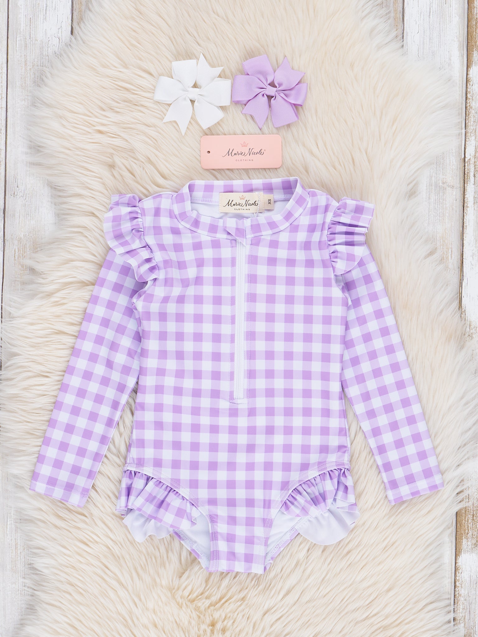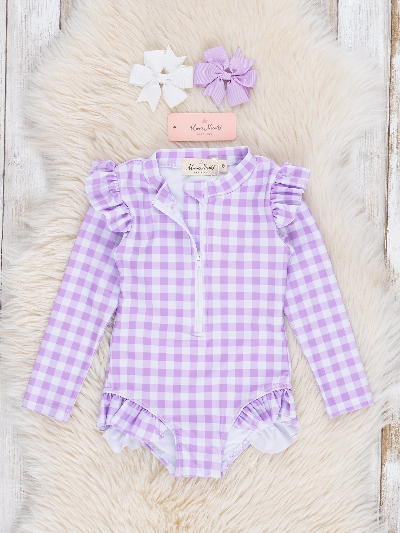 Make a splash with a touch of whimsy in this playful purple Gingham Zipper Rash Guard Swimsuit! Perfect for pool days and beach trips, this Marie Nicole Clothing swimsuit features a unique purple gingham print, adorable ruffle detail, and a convenient zipper front. Get ready for a fun-filled summer in style!