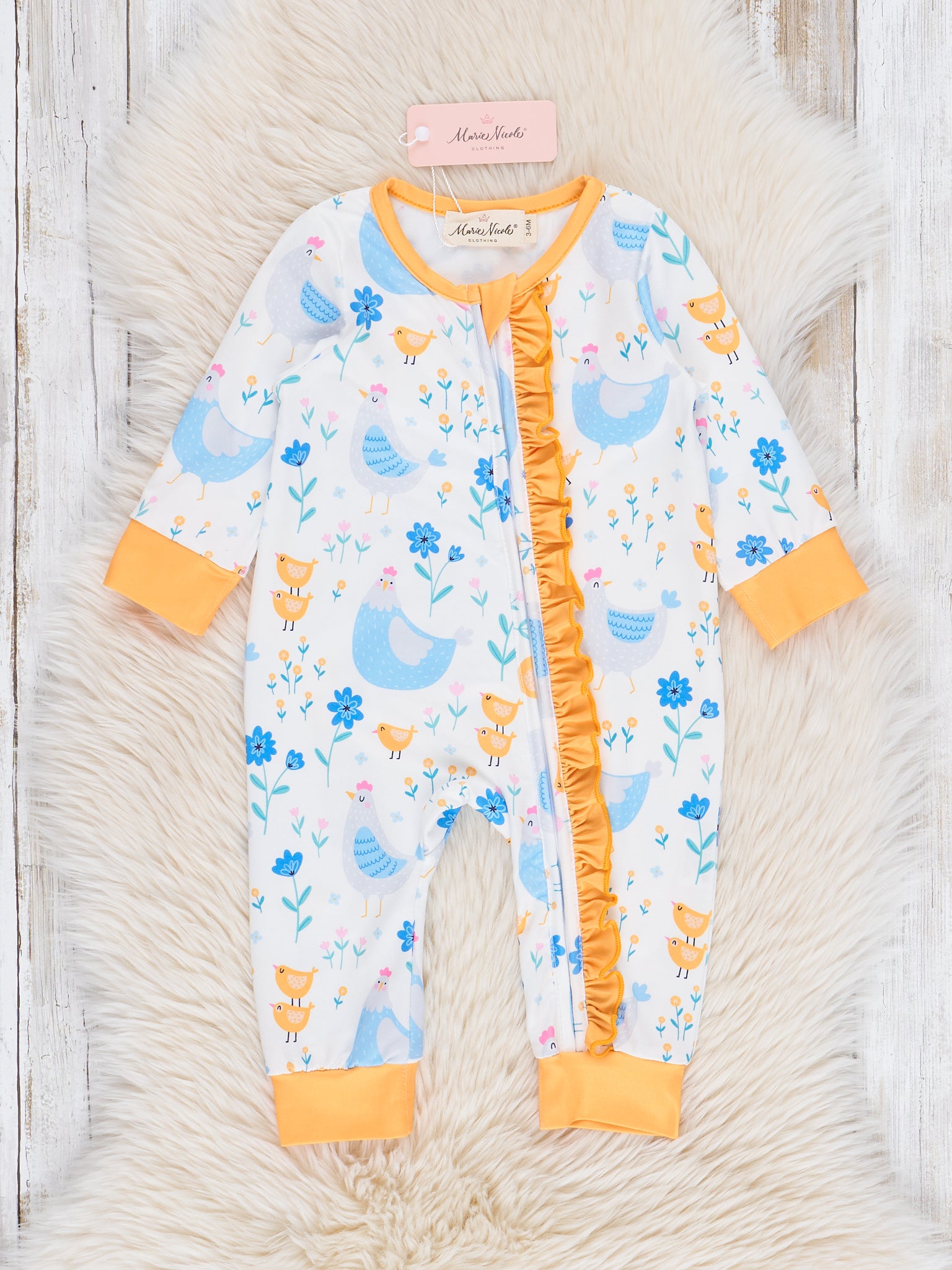 Get ready to make your baby girl the cutest chickadee around with our Golden Chickadee Ruffle Sleeper Pajamas! Featuring a playful chicken print in blue and yellow, these pajamas also come with a matching sleep set by Marie Nicole Clothing for ultimate comfort. With a secure knot closure and a golden yellow bodice, your little one will be both stylish and cozy.