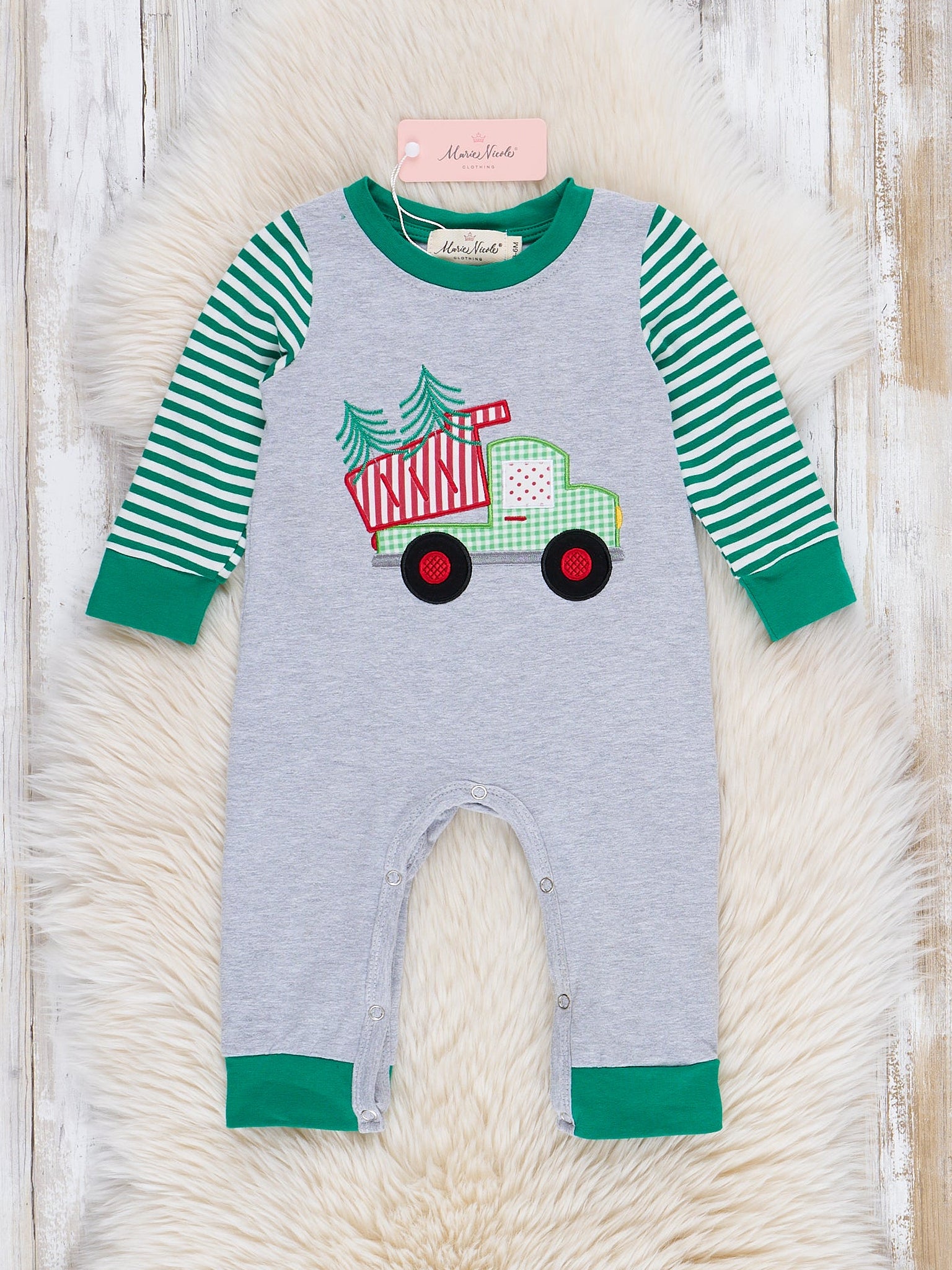This Grey & Green Striped Evergreen sibling set is perfect for your littles to rock over the holidays. With its festive green stripe raglan sleeves and embroidered Christmas tree car, it's stylish and comfortable. This romper is sure to set off those holiday pics in style, no matter who's wearing it!