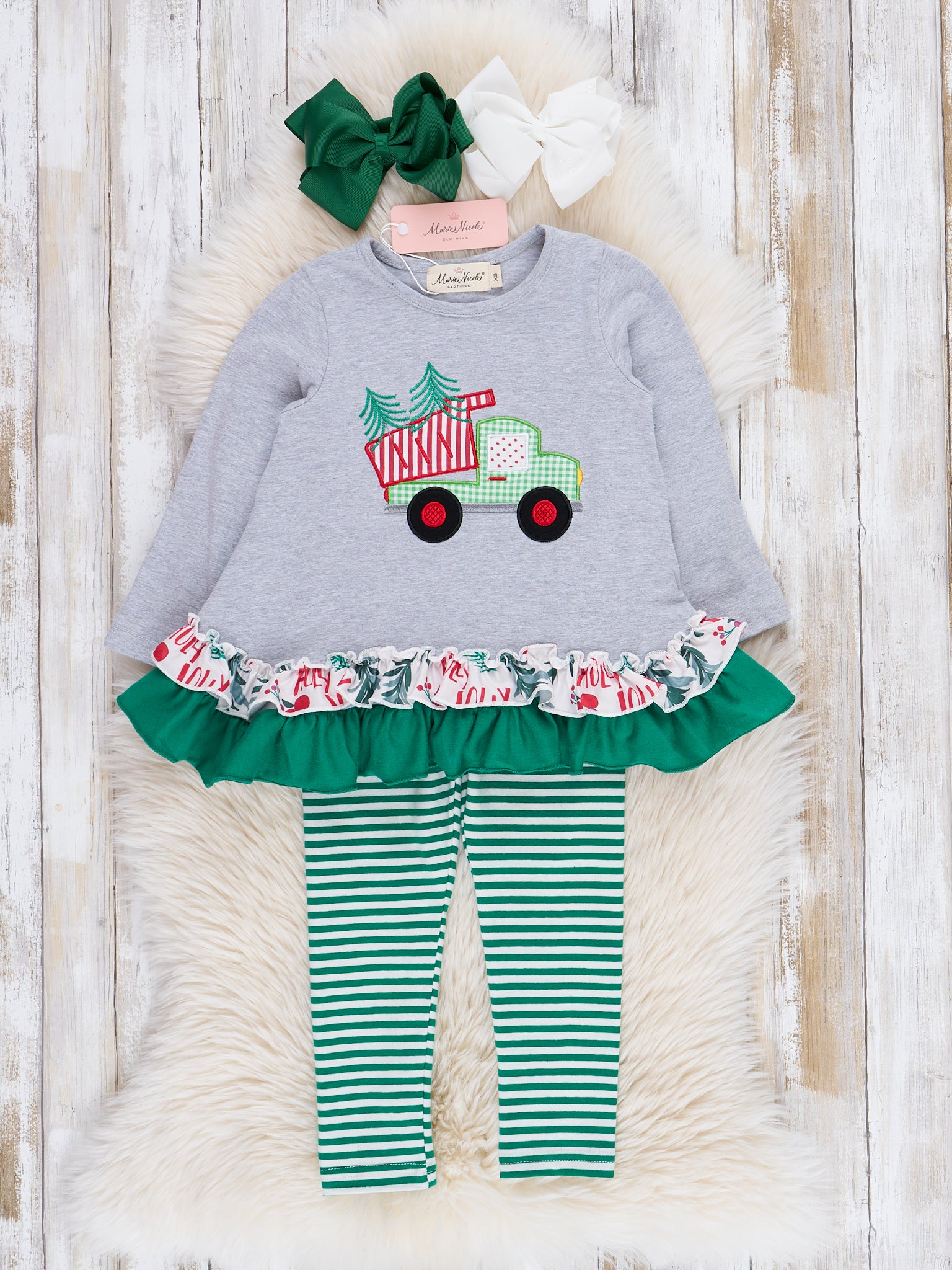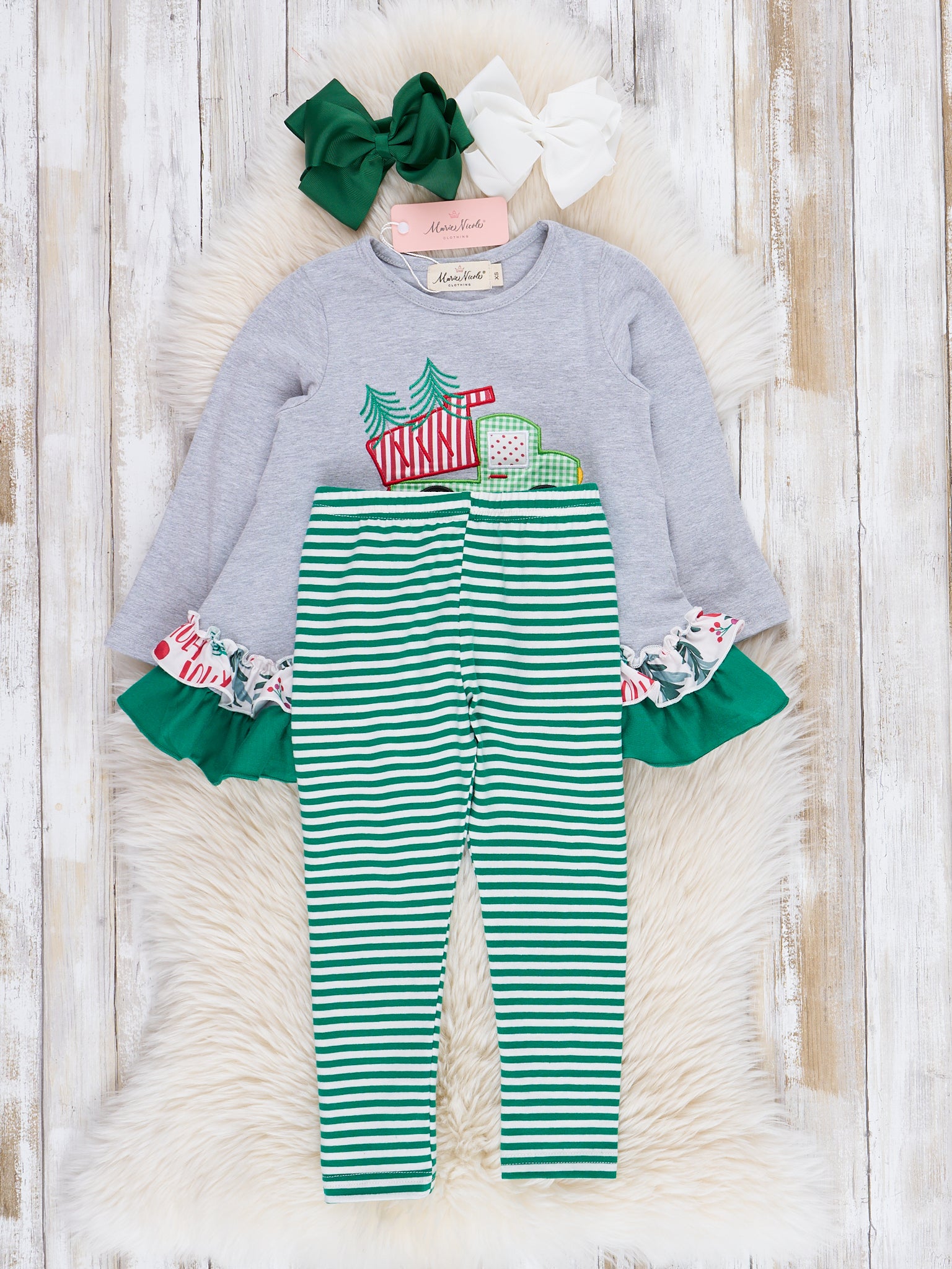 Grey & Green Striped Evergreen Ruffle Outfit