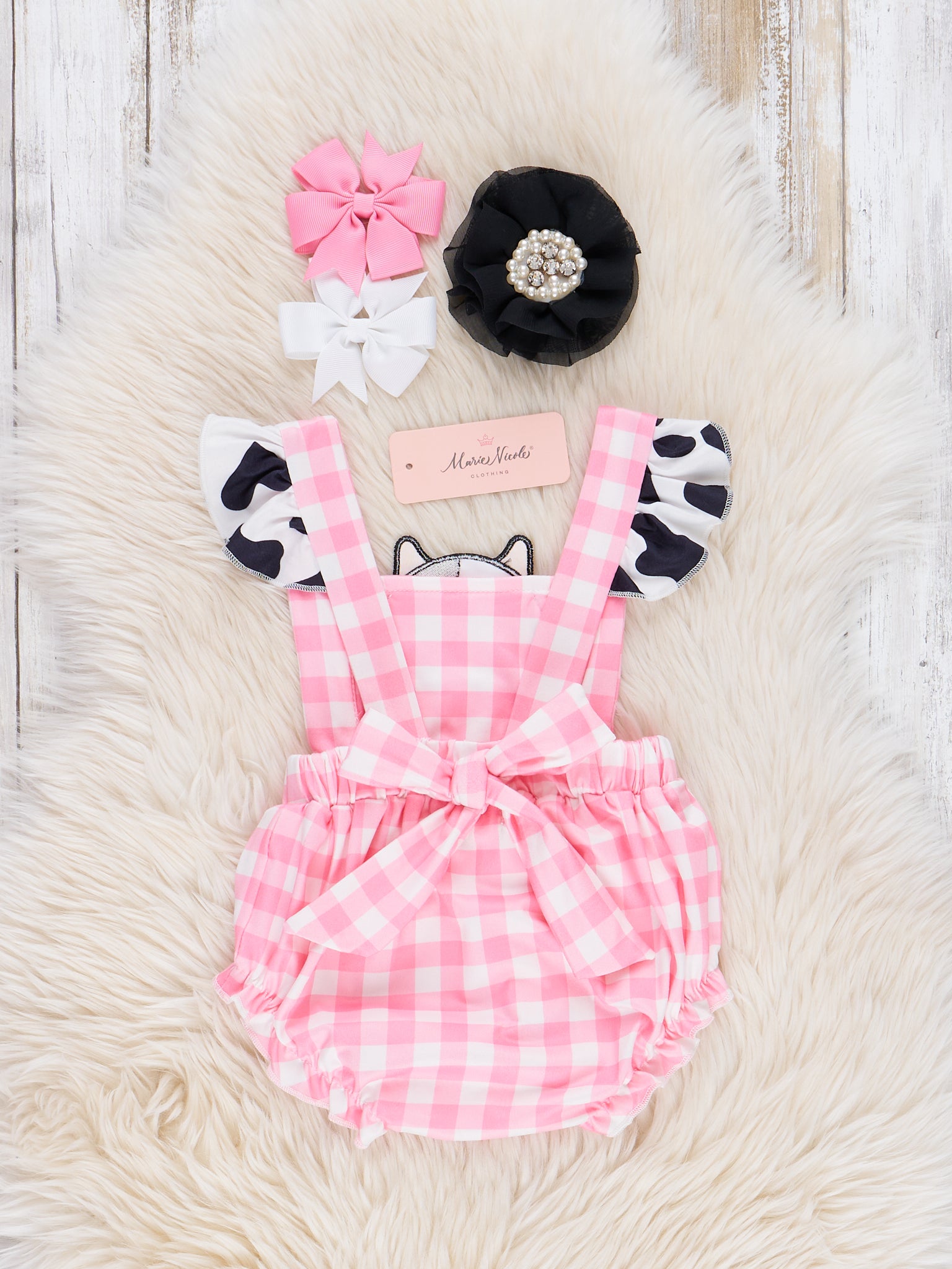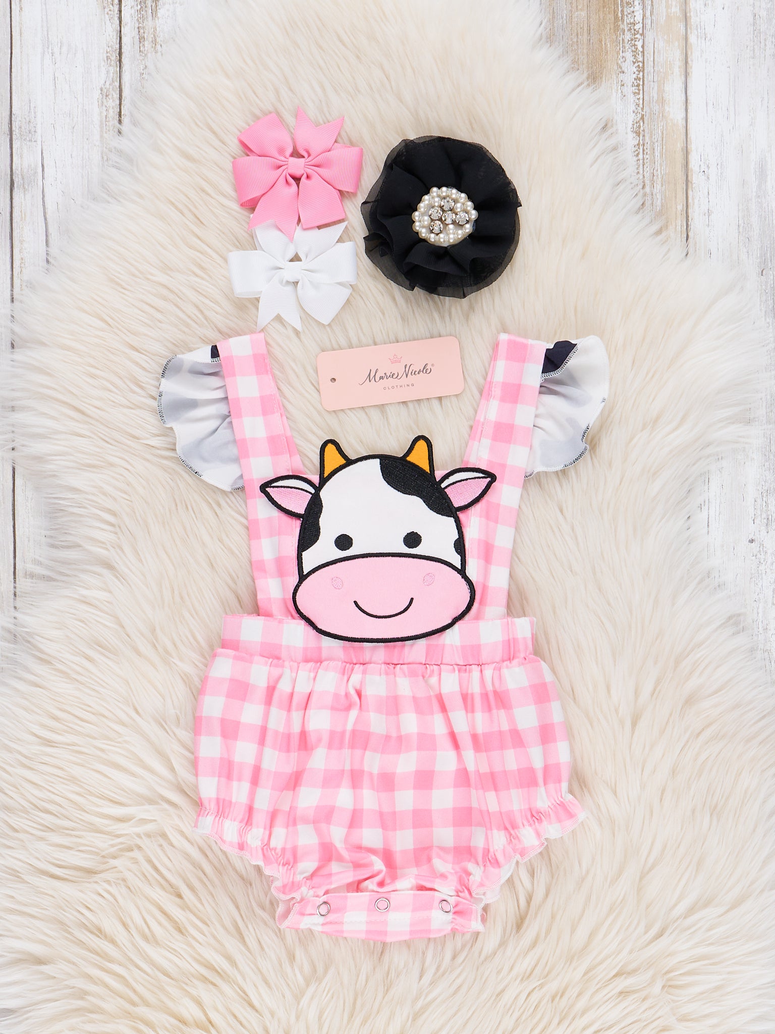 Get your little girl ready for a day of fun with our Happy Cow Gingham Ruffle Bubble! This adorable bubble features a pink gingham bodice with a cute cow print ruffle sleeve detail and an embroidered happy cow. The adjustable straps and bow back add a playful touch. Part of the adorable Happy Cow sibling set from Marie Nicole Clothing.