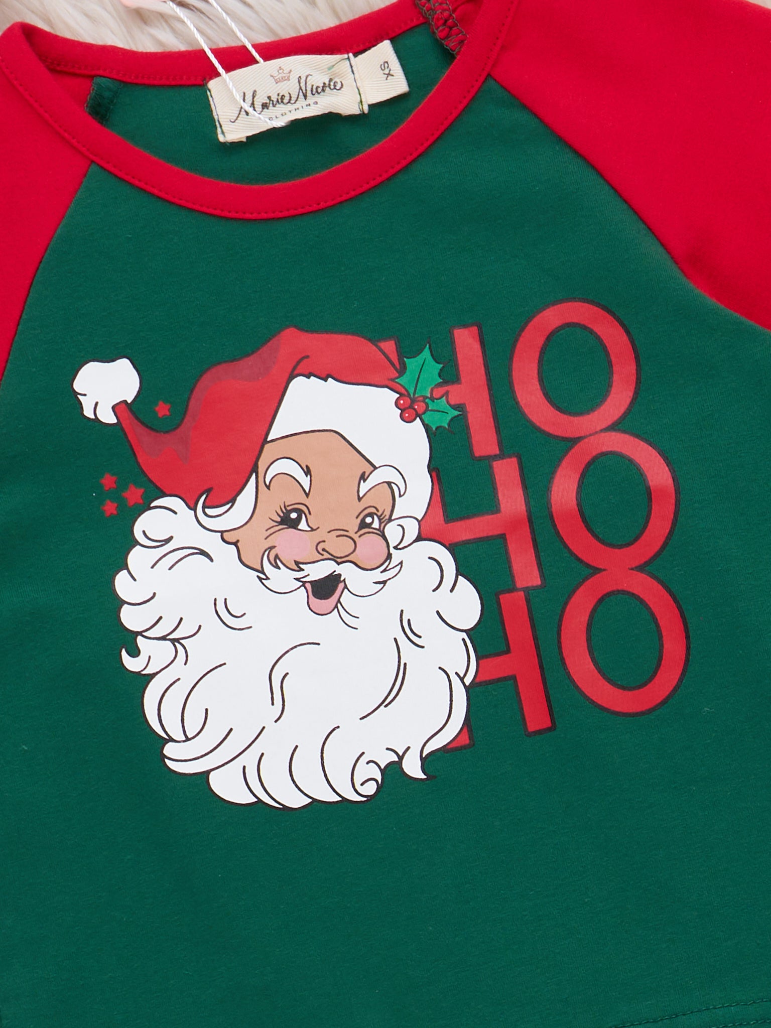 The Holiday Ho Ho Ho Bell Bottom Outfit is a festive two-piece set that features a top with playful holiday design and a cheerful print Santa motif, paired with matching bell bottom pants adorned with a joyful seasonal print. This outfit is designed by Marie Nicole Clothing for comfort, easy movement, and spirited holiday celebrations, perfect for photos, parties, or cozy family gatherings.