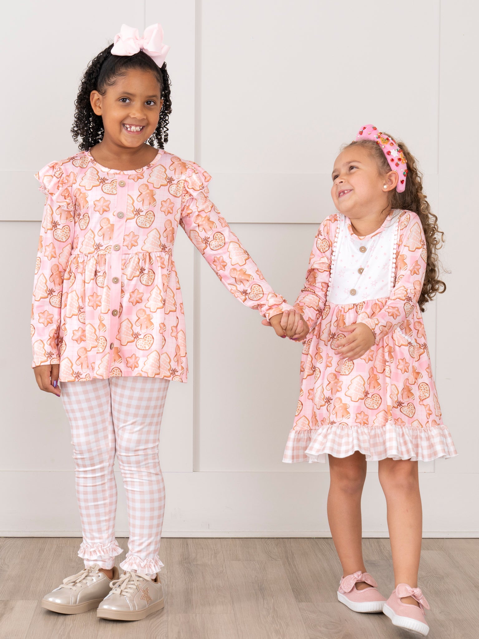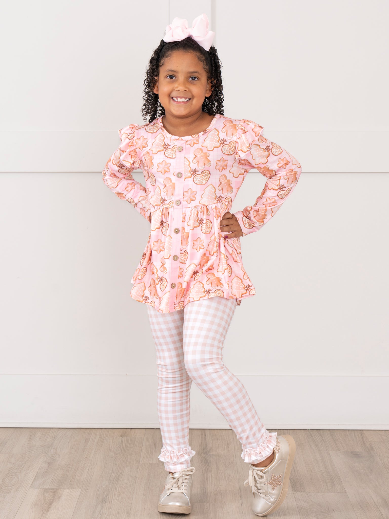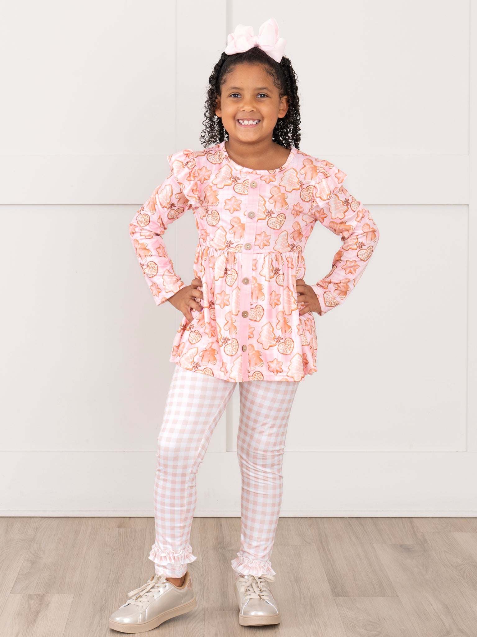 Get ready for a sweet holiday with this sister set! This outfit boasts a playful gingham ruffle leggings, your little girl will be the star of any Christmas party. And who can resist the adorable holiday sugar cookies print top? It's the perfect outfit for a fun and festive season!