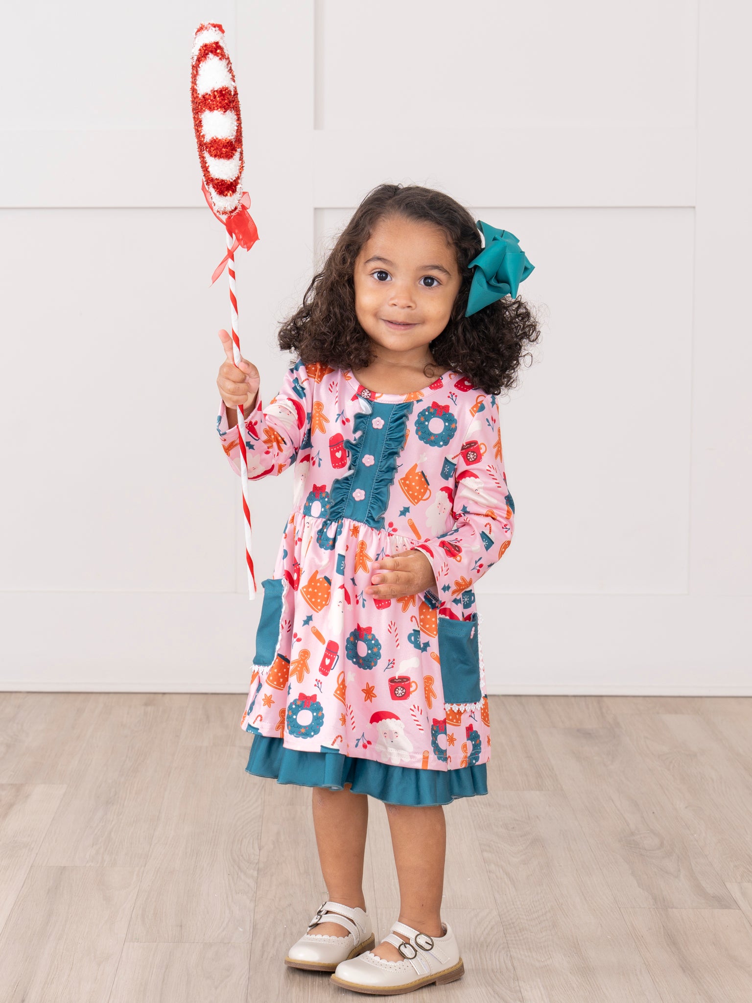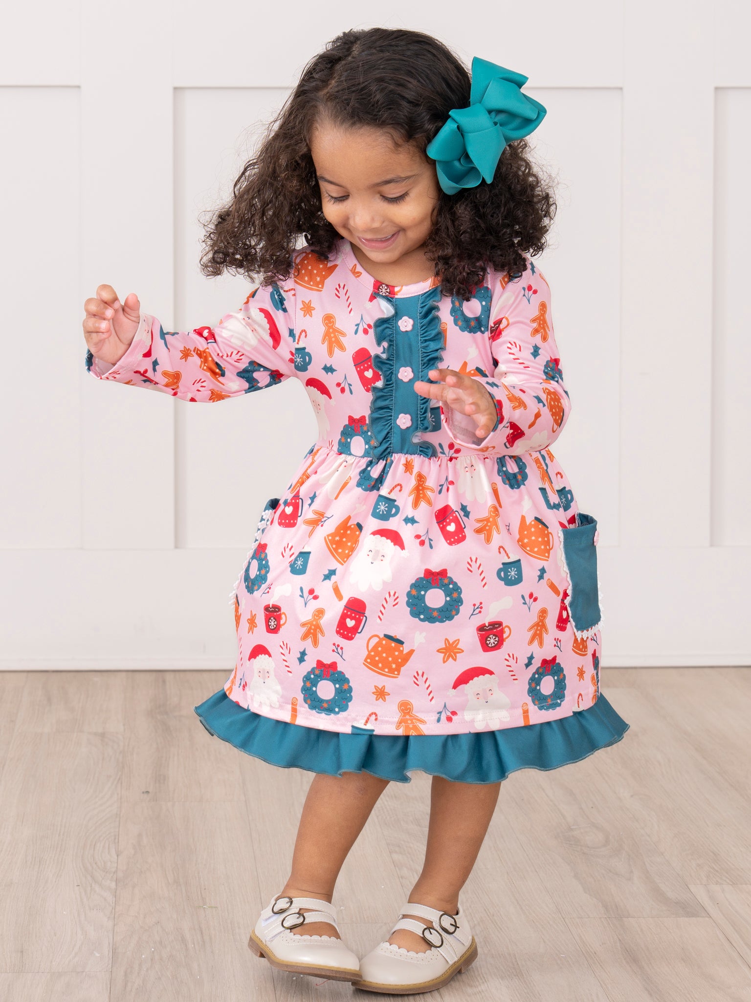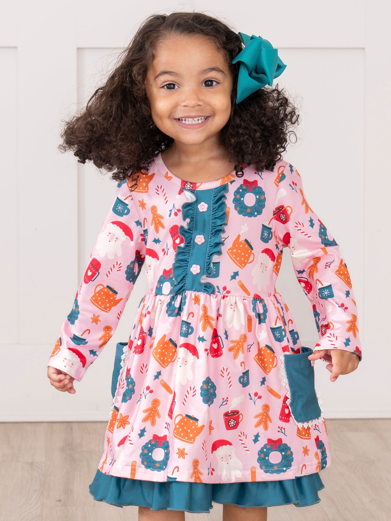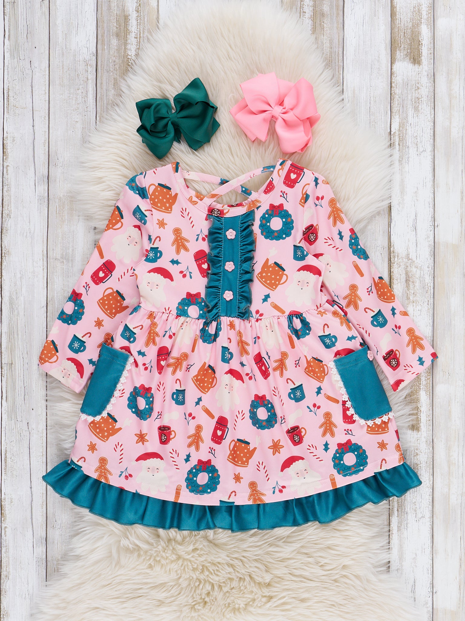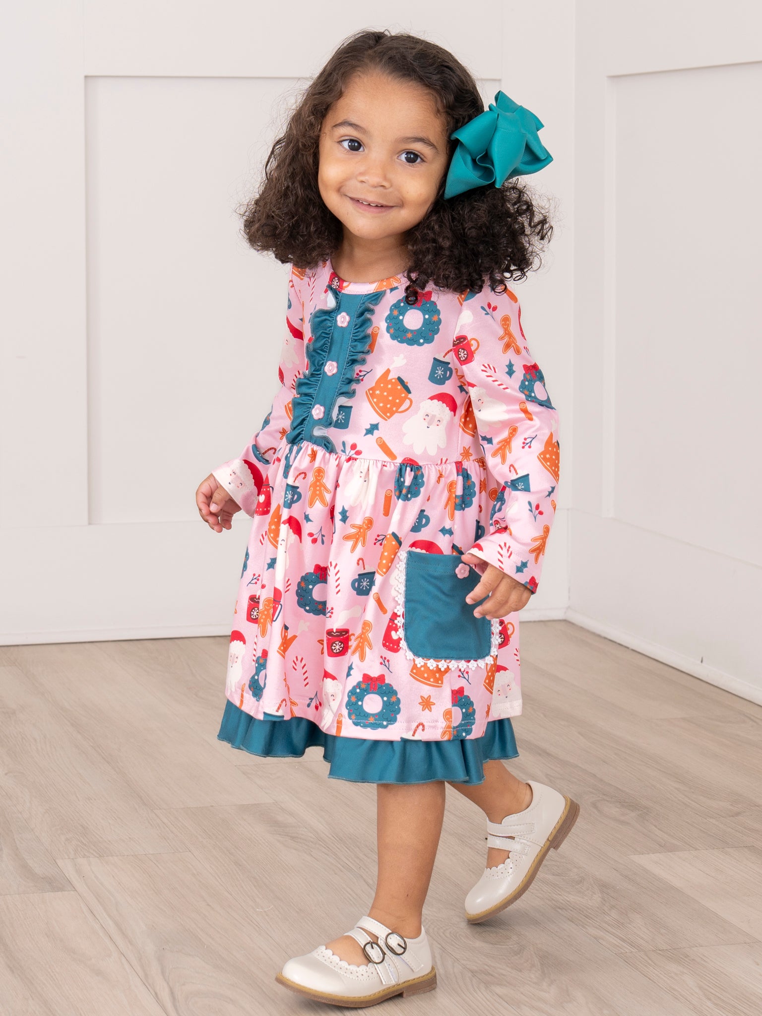 The Cozy Holiday Moments Ruffle Dress is a festive delight, featuring a cheerful holiday wreath print, button-front detail, and contrasting ruffle trim for added charm. Complete with practical side pockets and a comfortable fit, this dress from Marie Nicole Clothing is perfect for holiday gatherings, family photos, and creating joyful Christmas memories.