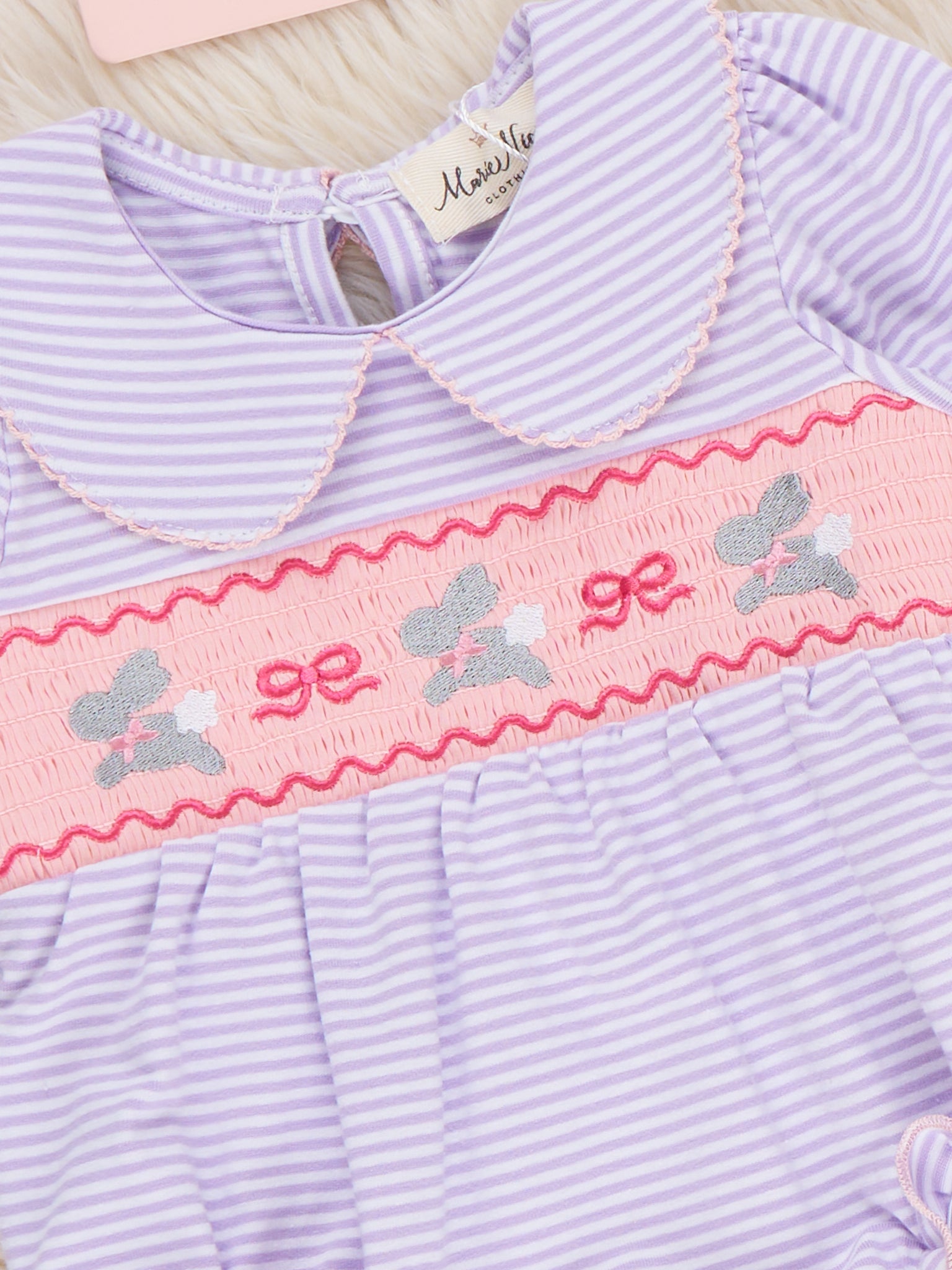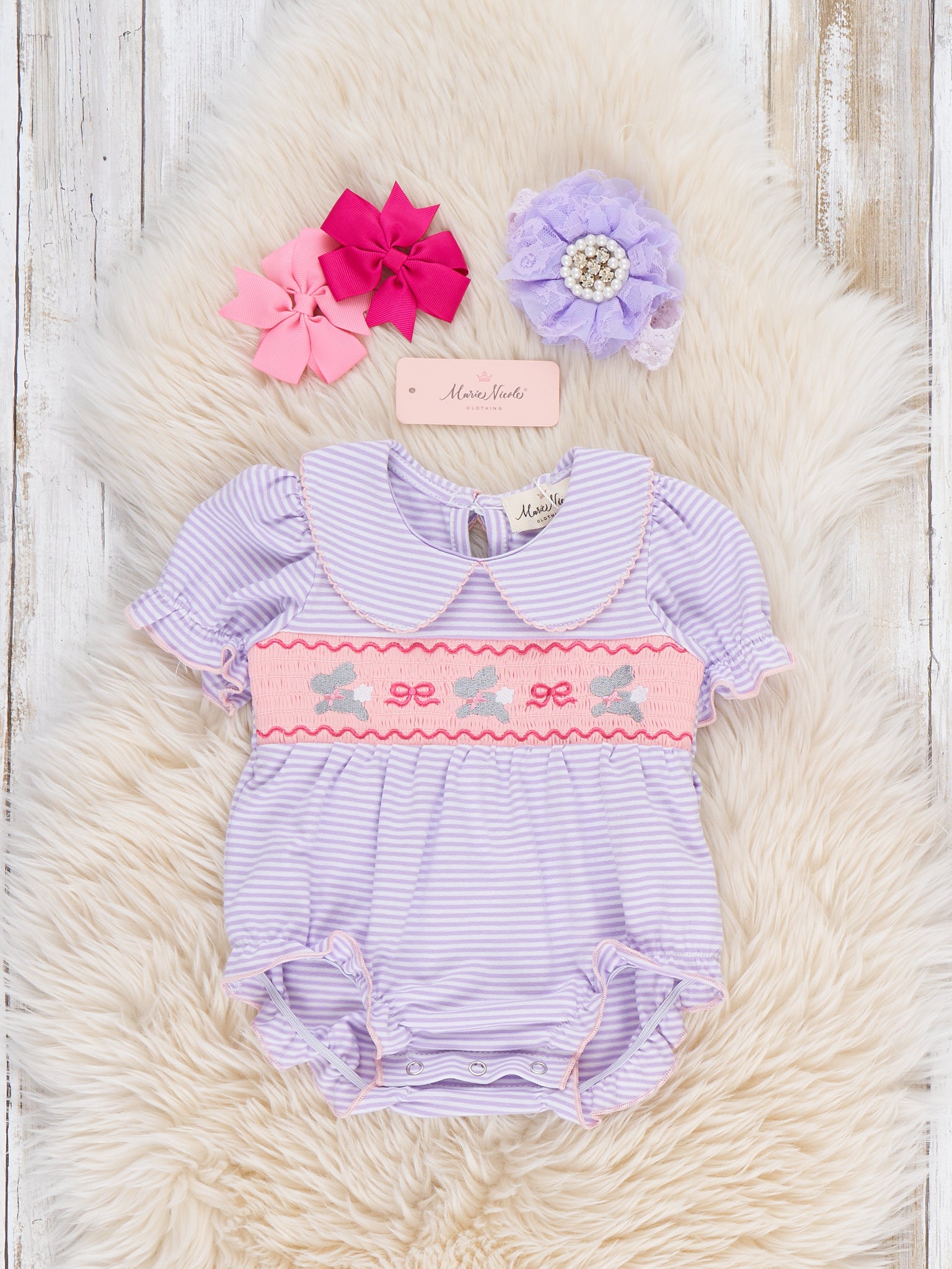 The Hop & Bow Smocked Cotton Bubble by Marie Nicole Clothing features classic stripes, a crisp Peter Pan collar, and a smocked panel adorned with tiny hopping bunnies and bows. Puff sleeves and gentle elastic at the legs create a sweet, vintage-inspired silhouette. Soft fabric and convenient bottom snaps keep baby comfy and make changes easy for spring outings, celebrations, and photo-ready moments.