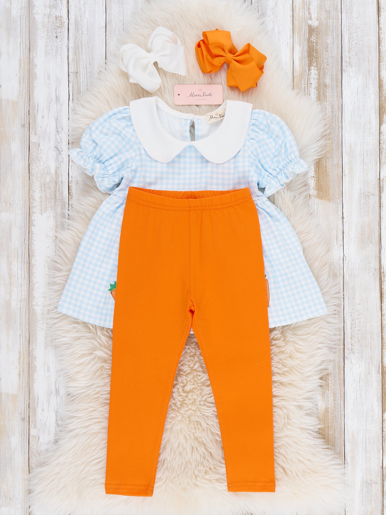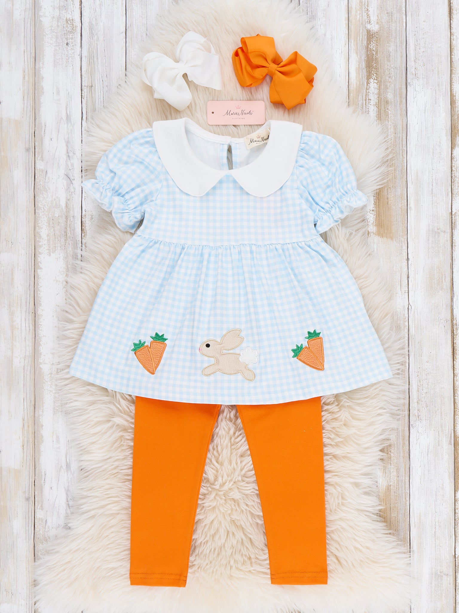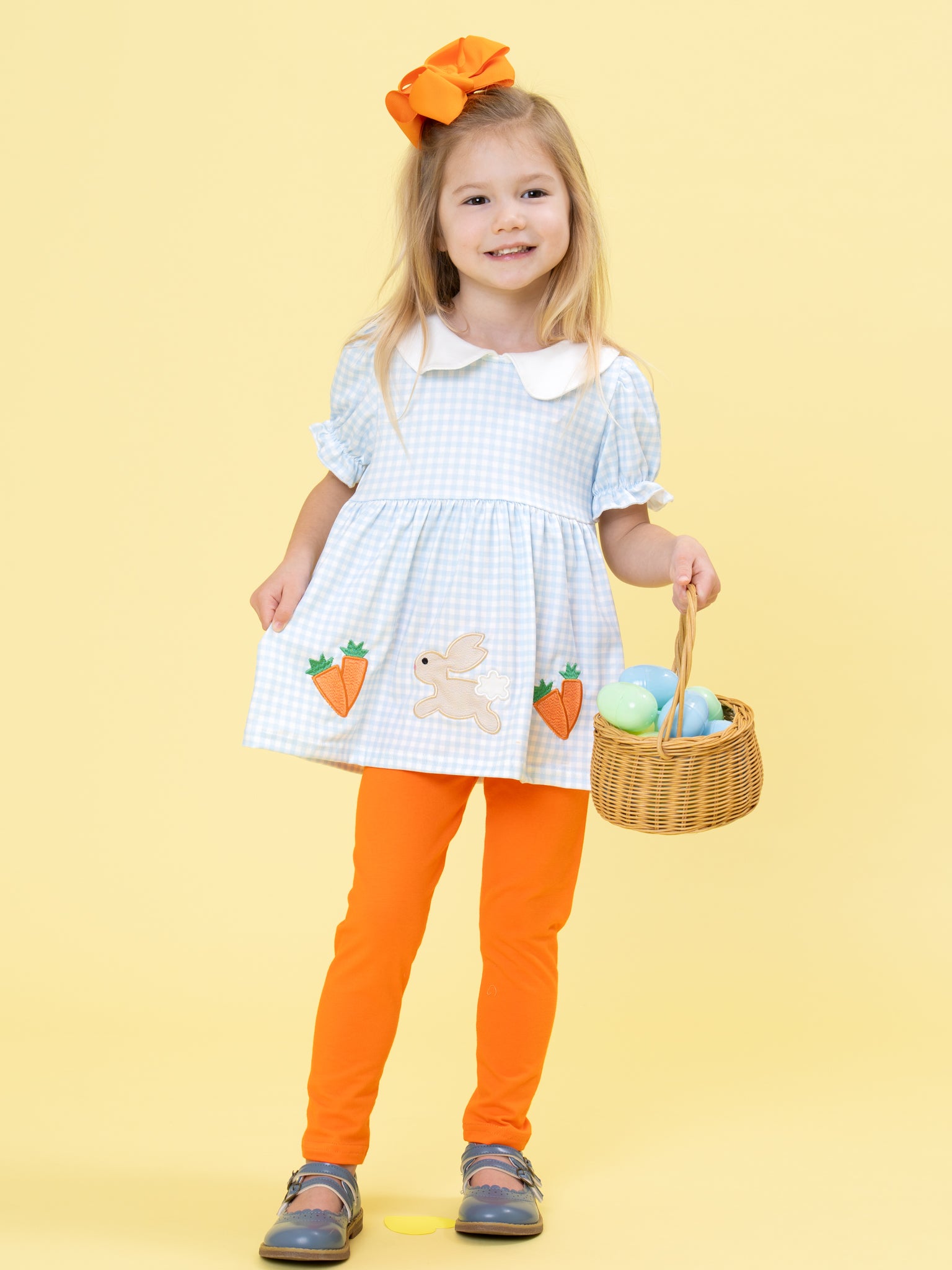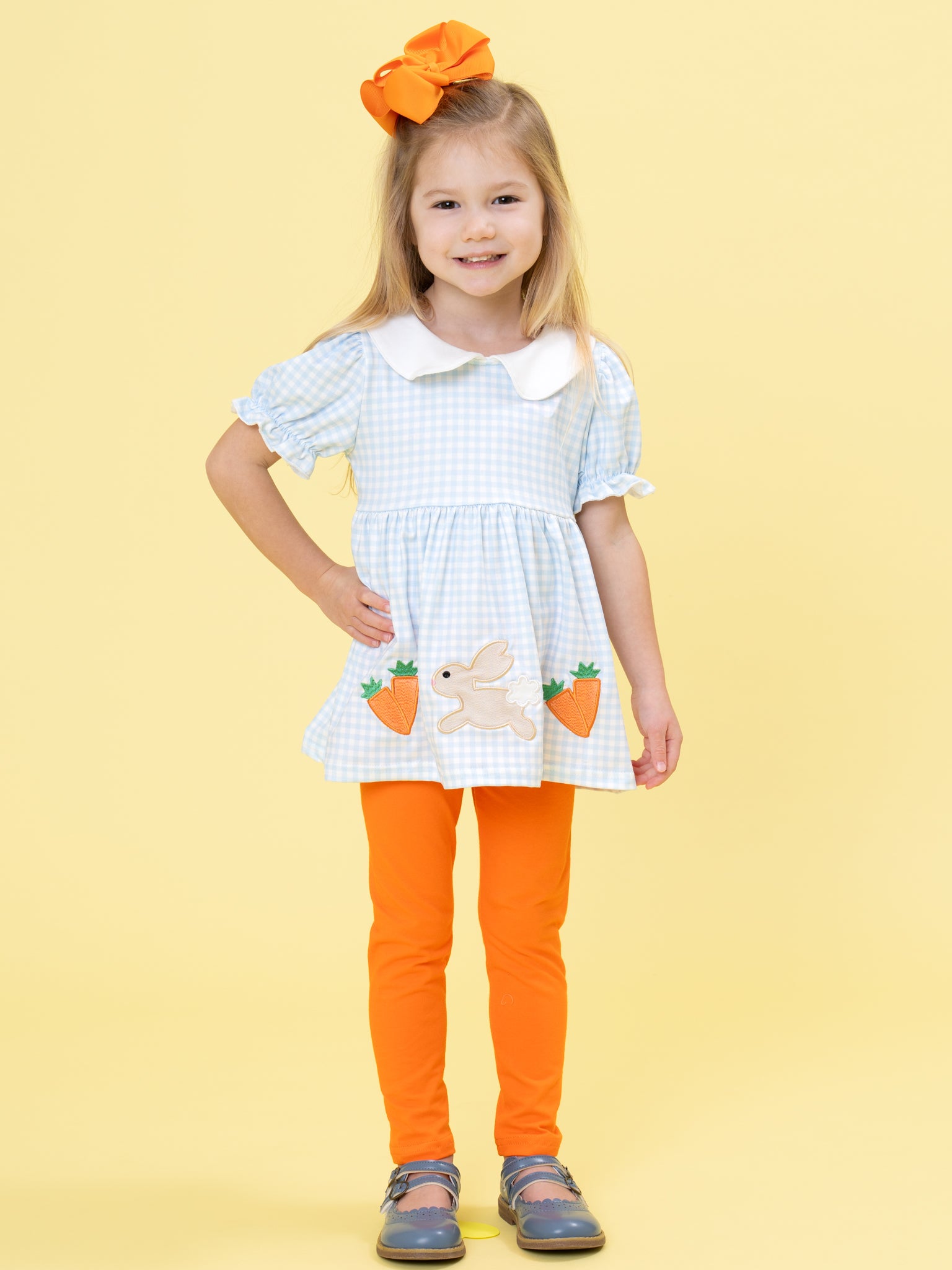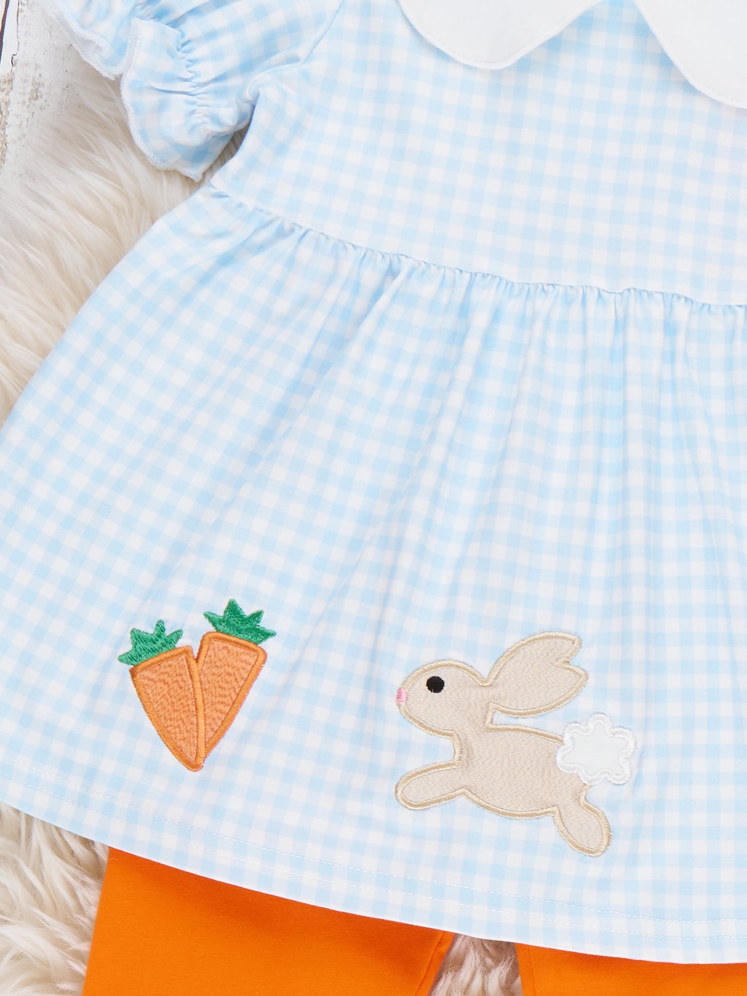 Hop & Harvest Embroidered Outfit by Marie Nicole Clothing features a gingham dress with a scalloped collar, puff sleeves, and playful bunny and carrot appliques on the skirt, paired with stretch knit leggings. This set blends classic charm and festive motifs, perfect for springtime celebrations, Easter events, or everyday comfort. The design ensures both style and ease for little ones throughout the season.