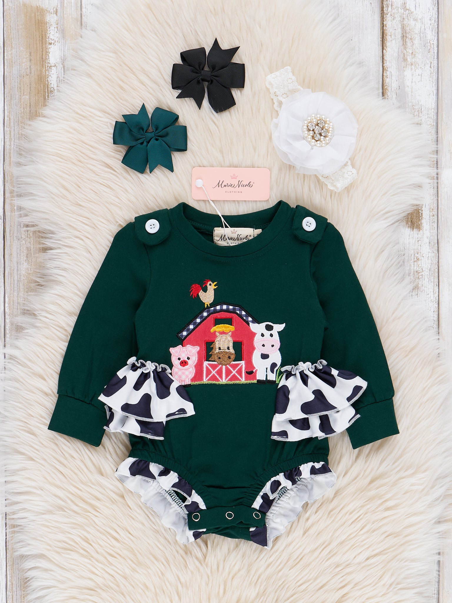 Moo-ve over for this sibling set—a playful ensemble that's udder-ly stylish! With gorgeous hunter green and the whimsy cow print, this ruffle bubble by Marie Nicole Clothing is a delightful fusion of trendiness and fun. 🐄💚