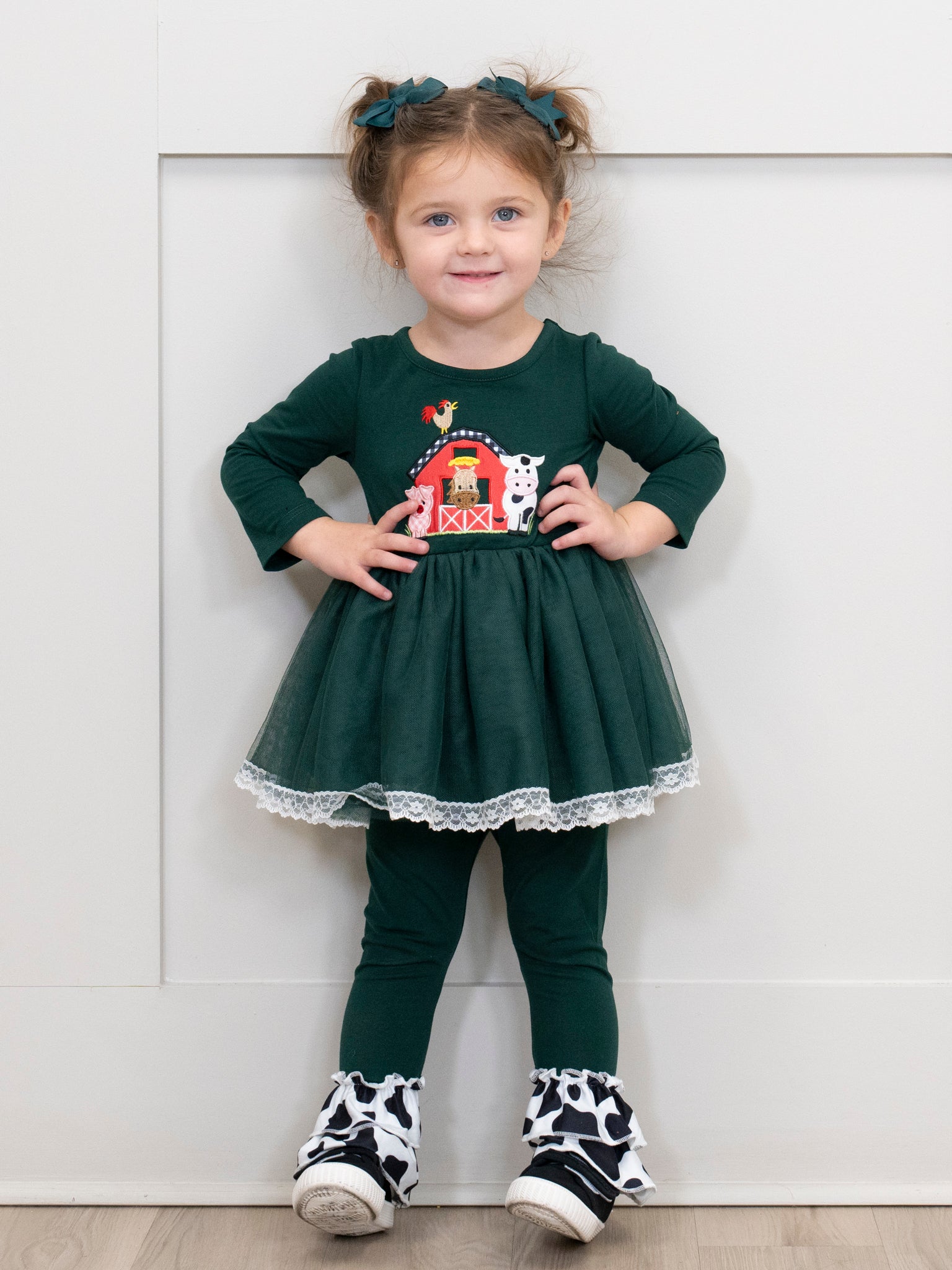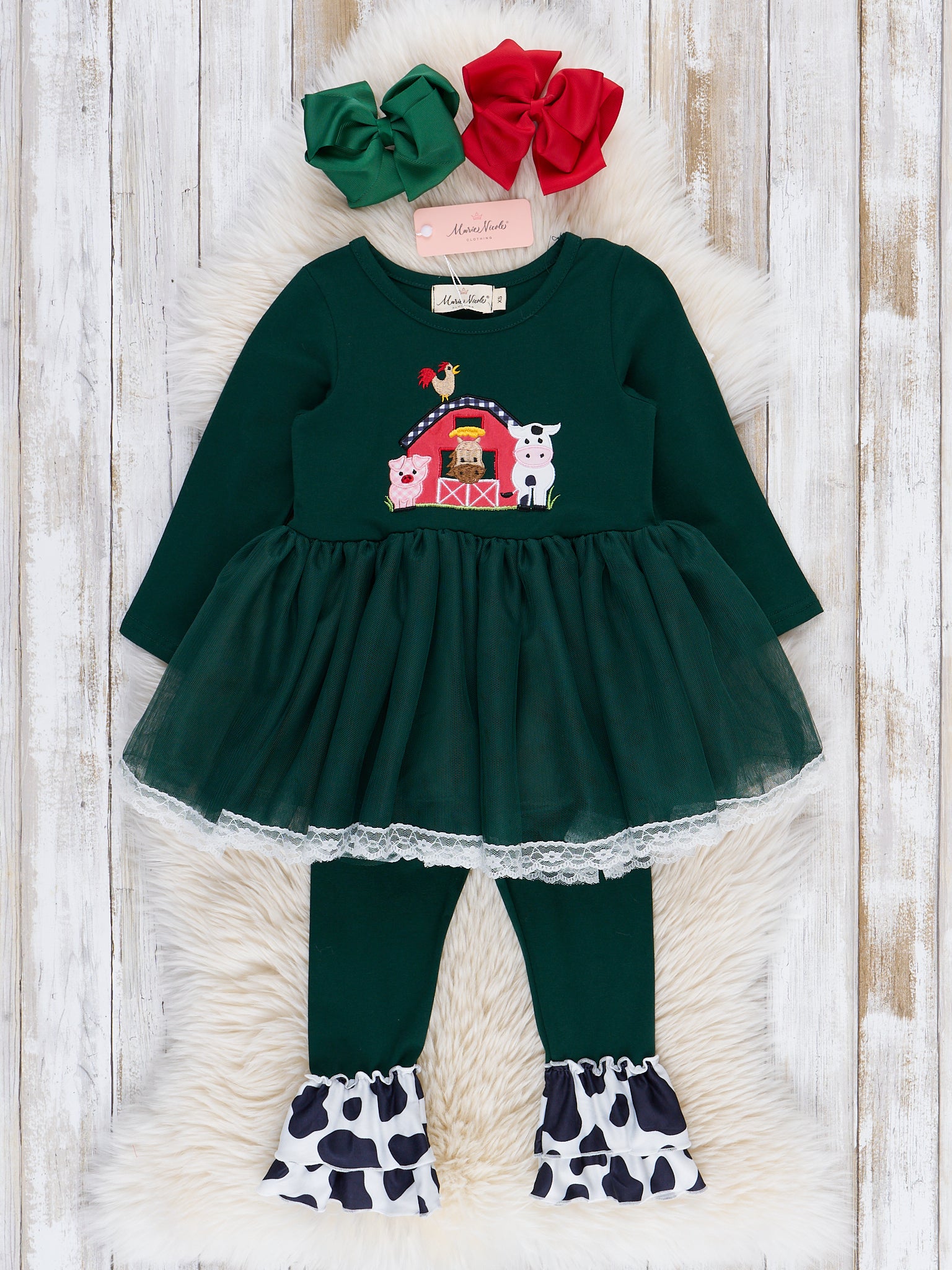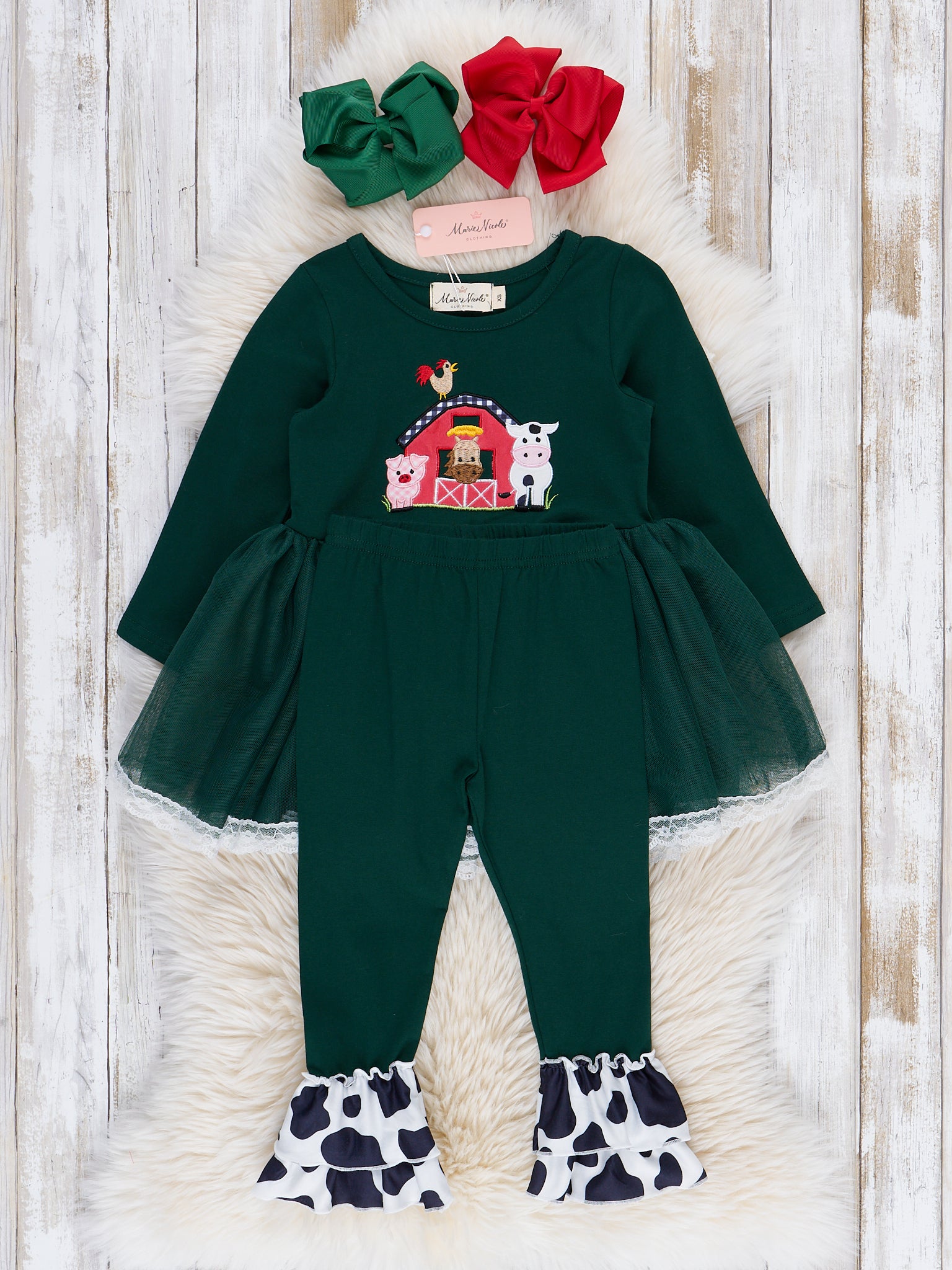 Moo-ve over for this sibling set—a playful ensemble that's udder-ly stylish! With embroidered farm friends on a gorgeous hunter green, and whimsical cow print, this outfit by Marie Nicole Clothing is a delightful fusion of trendiness and fun. 🐄💚 The tulle detailing adds a touch of magic, making every twirl an adventure. 🐄💚