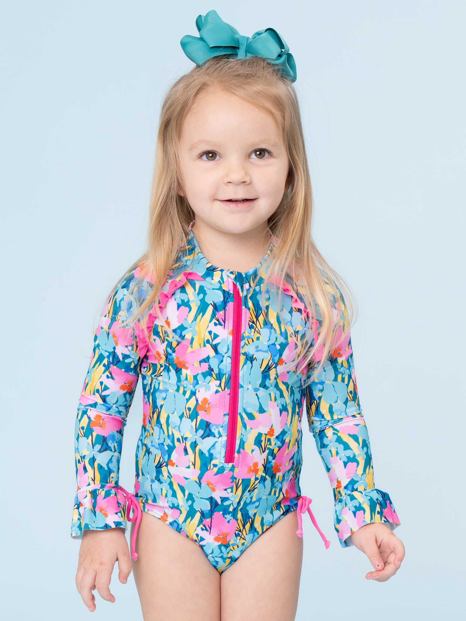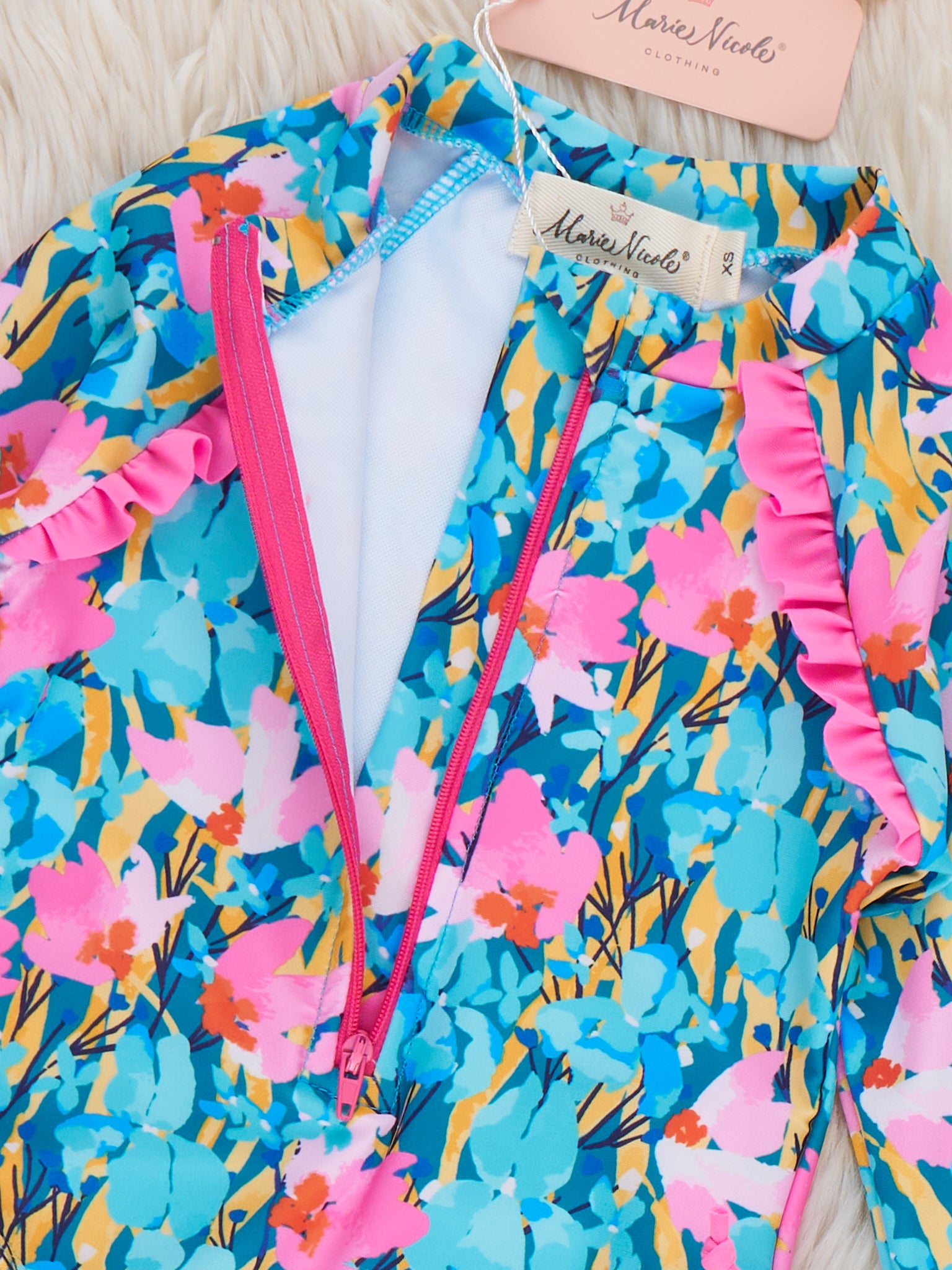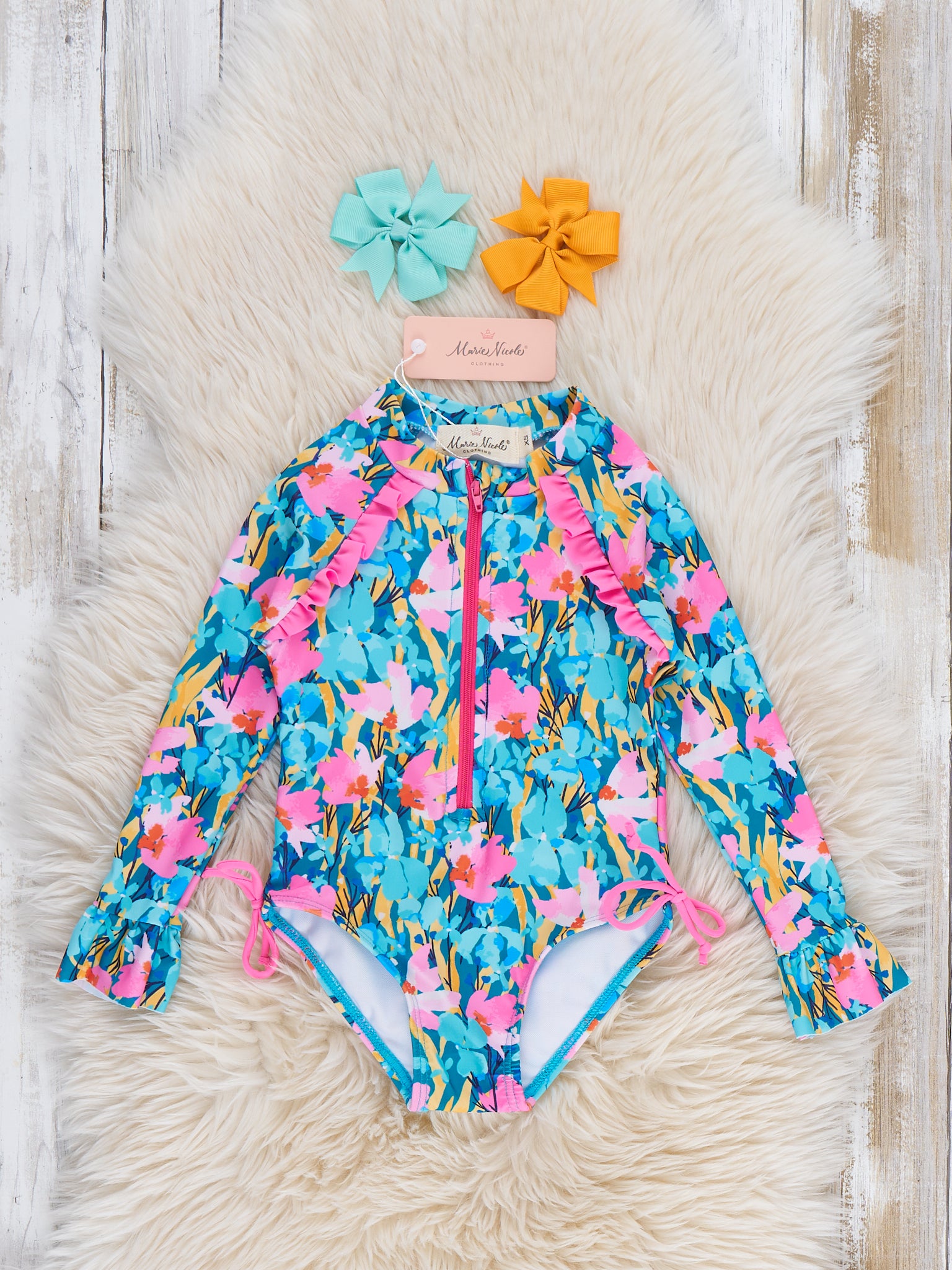 The Island Flora Rashguard by Marie Nicole Clothing offers long sleeves with front zipper for full, secure coverage. A lovely floral print gives this bodysuit a fun, festive vibe. With stretchy lined fabric, this rashguard is the go-to for sunny adventures to the beach or the pool!