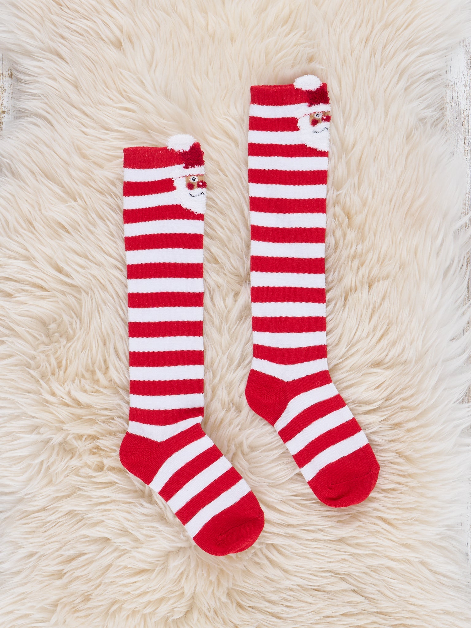 The Jolly Santa Striped Knee Socks by Marie Nicole Clothing are festive knee-high socks featuring bright red and white stripes with a cheerful Santa face detail near the top. These cozy socks add a playful holiday touch to any outfit, ideal for celebrating the Christmas season and keeping feet warm in style.