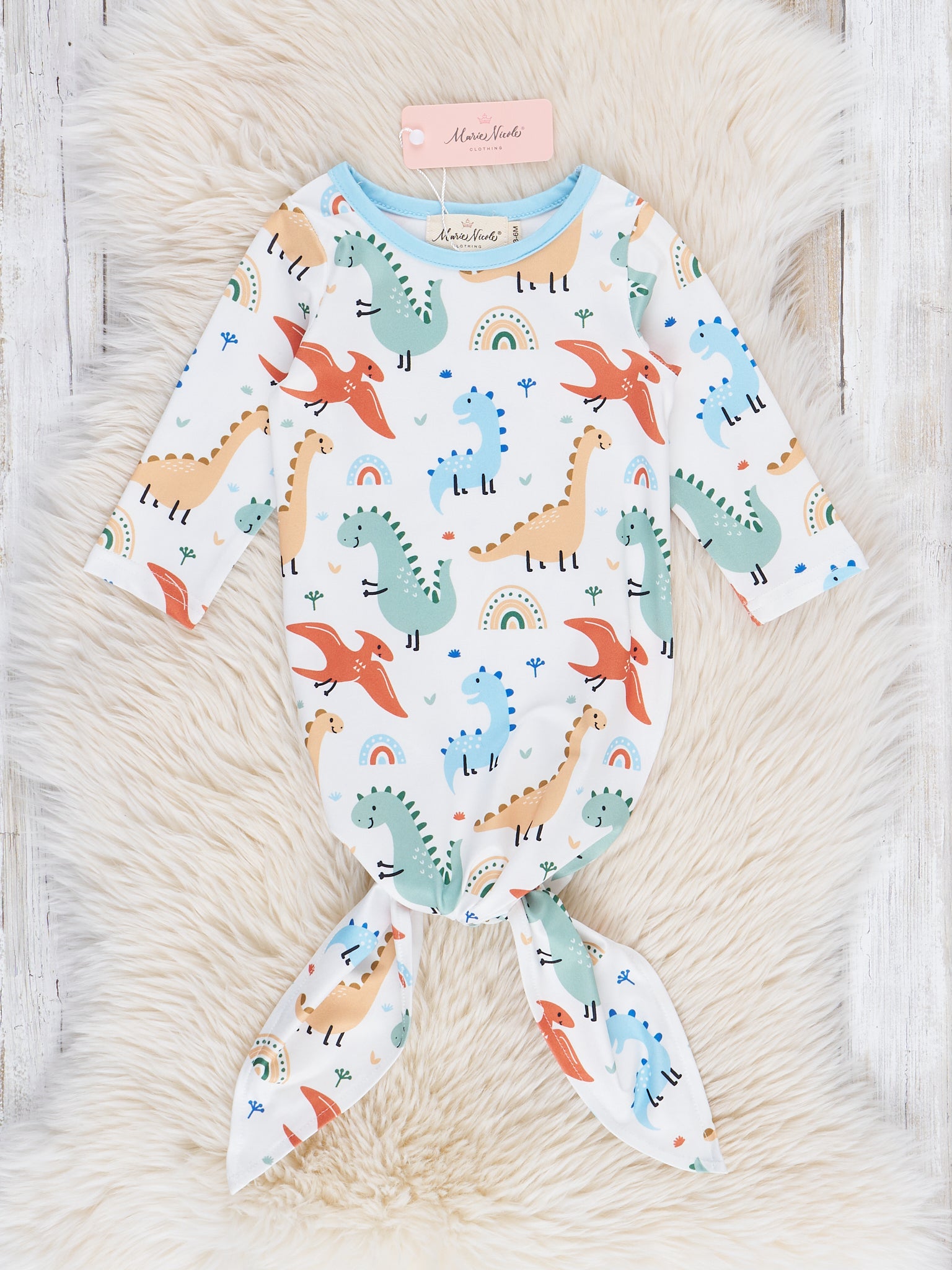 Unleash your little one's wild side with our Jurassic Slumbers Knot Gown! This boys gown by Marie Nicole Clothing features a playful dinosaur print and a convenient knot closure for easy on and off. Complete the matching sleep set for a roar-some bedtime adventure!