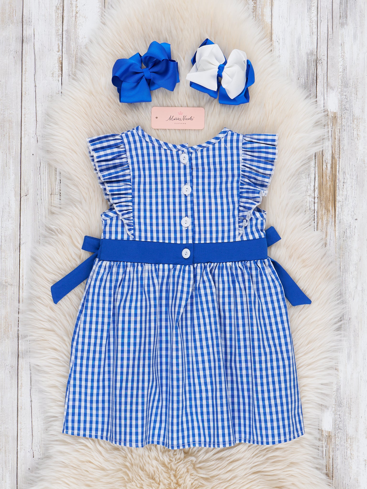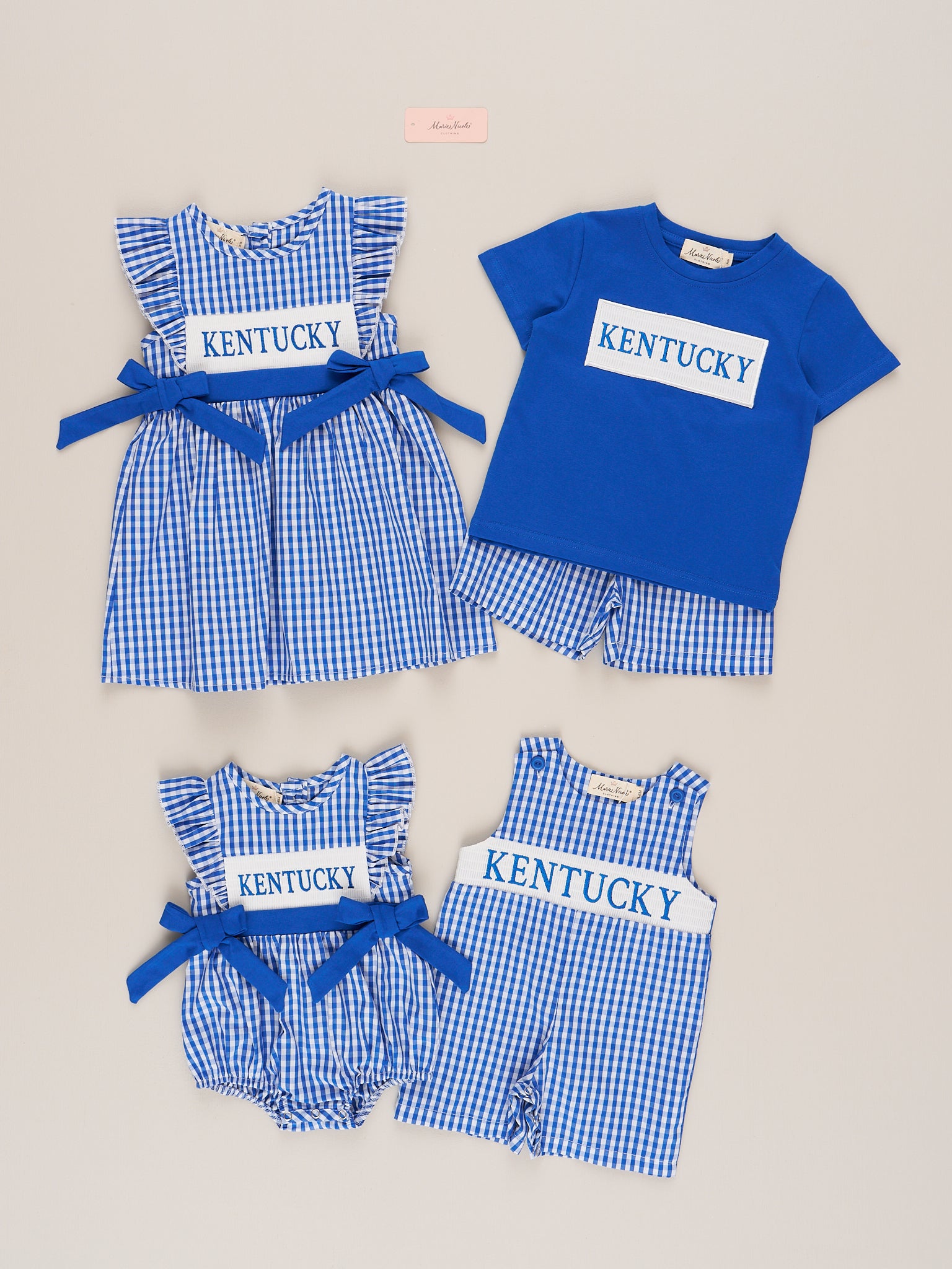 The Kentucky Smocked Gingham Dress is a darling combination of Southern charm and team spirit. Featuring a classic blue and white gingham pattern, sweet ruffle sleeves, and a smocked panel embroidered with “Kentucky” this dress from Marie Nicole Clothing is perfect for game days, family gatherings, or sunny day adventures. Finished with bold blue waist ties for a polished look, it’s a spirited style your little fan will love to twirl in.