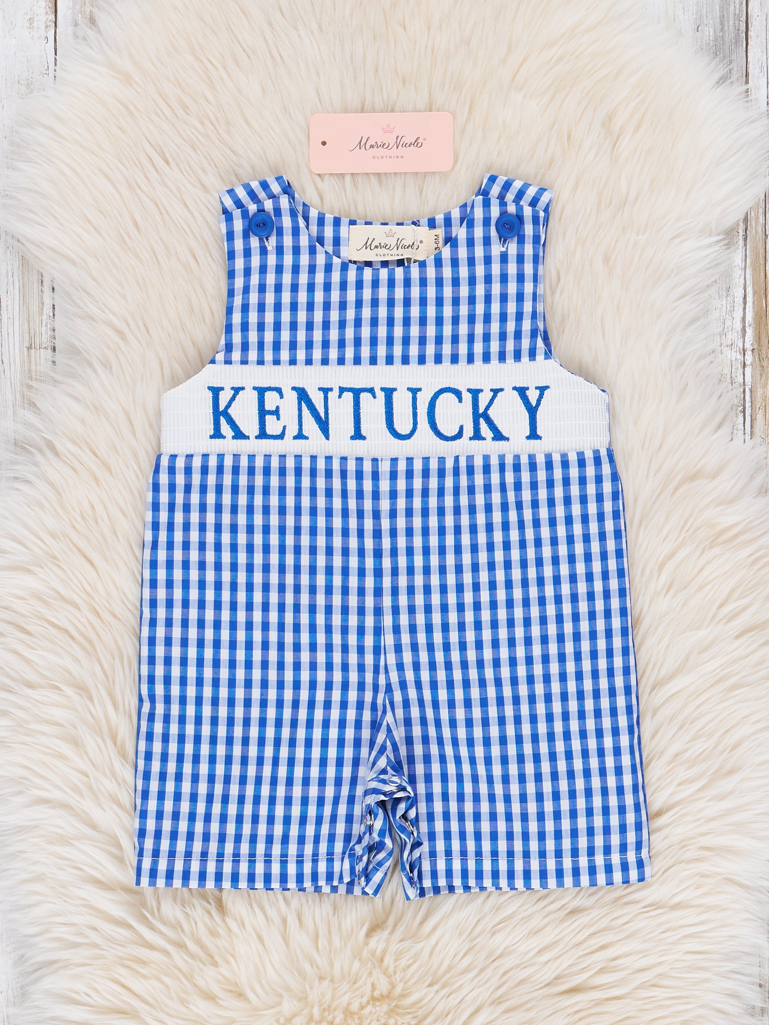 The Kentucky Smocked Gingham Johnny is a classic and charming choice for your little guy to show off his state pride. Featuring a timeless blue and white gingham print and a smocked panel with bold “Kentucky” embroidery, this one-piece from Marie Nicole Clothing brings Southern style to game day and beyond. Lightweight, breathable, and designed with convenient snaps for easy changes, it’s a spirited outfit perfect for tailgates, family photos, or sunny adventures.