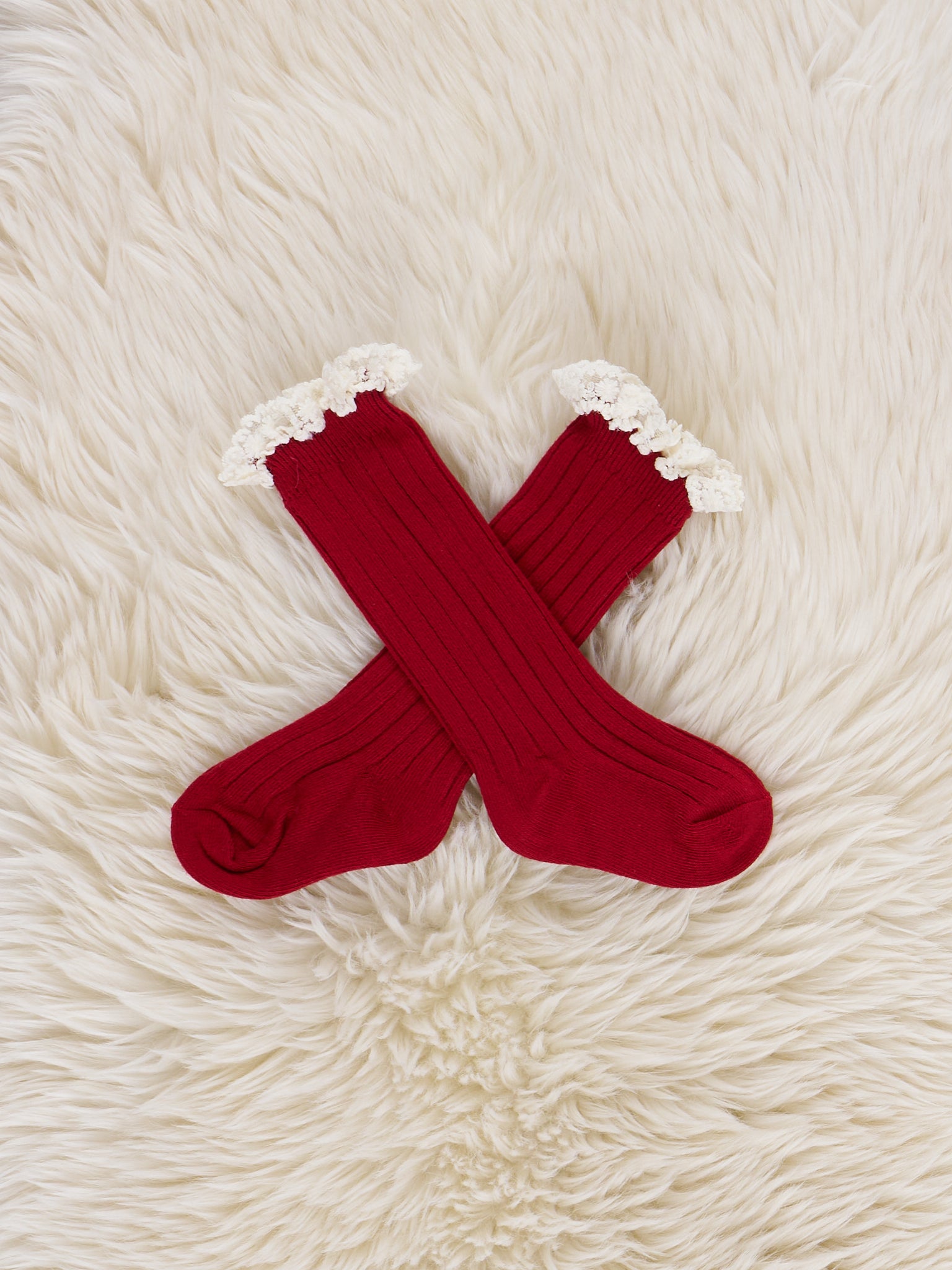 The Lace Trim Knee Socks in Red are a perfectly charming touch to any outfit, featuring a beautiful lace trim along the top. These ribbed socks by Marie Nicole Clothing are soft, stretchy, and classic, making them a must-own!
