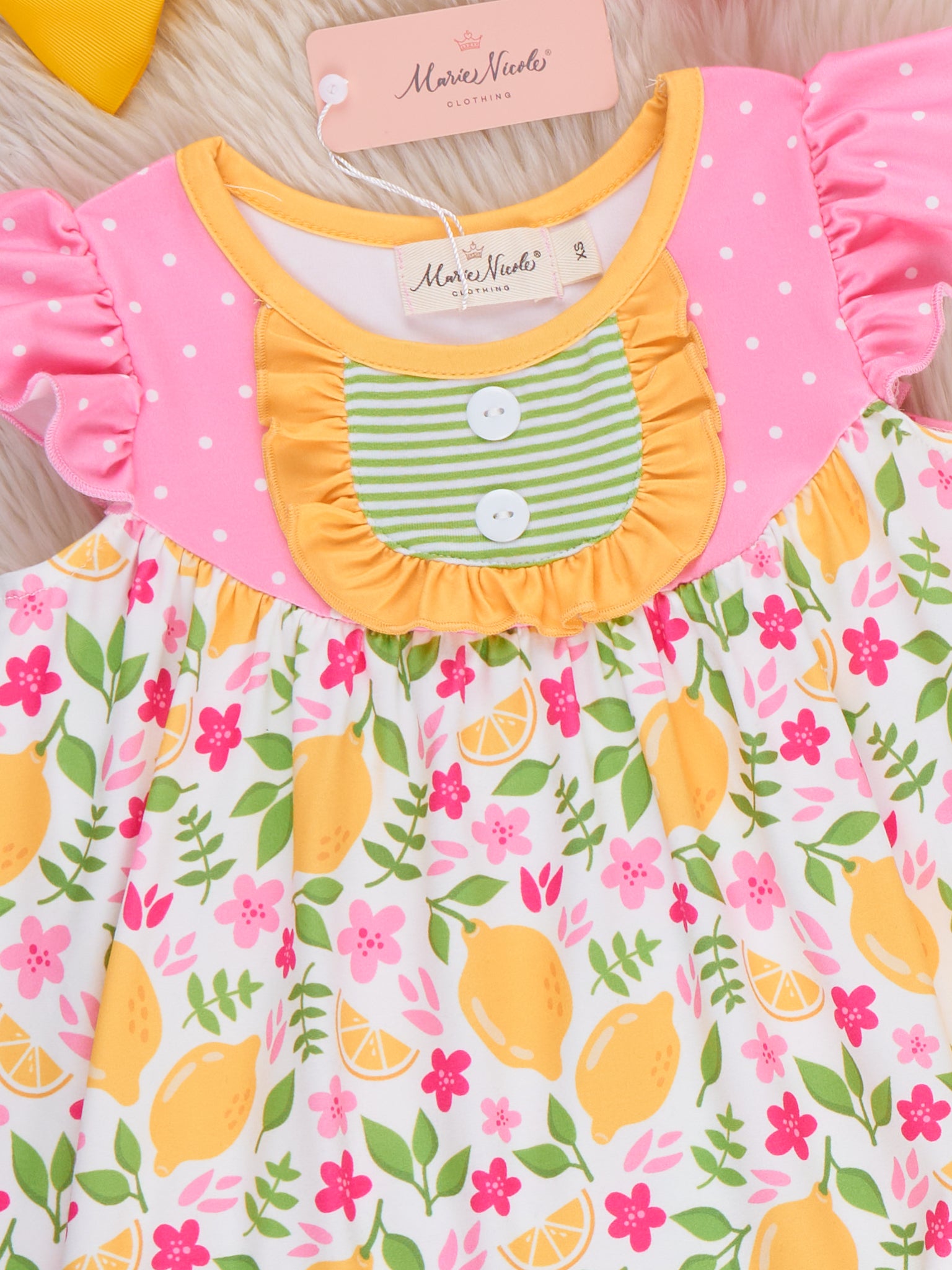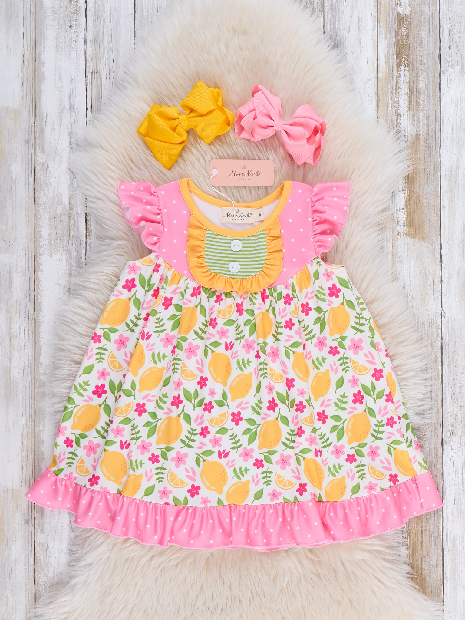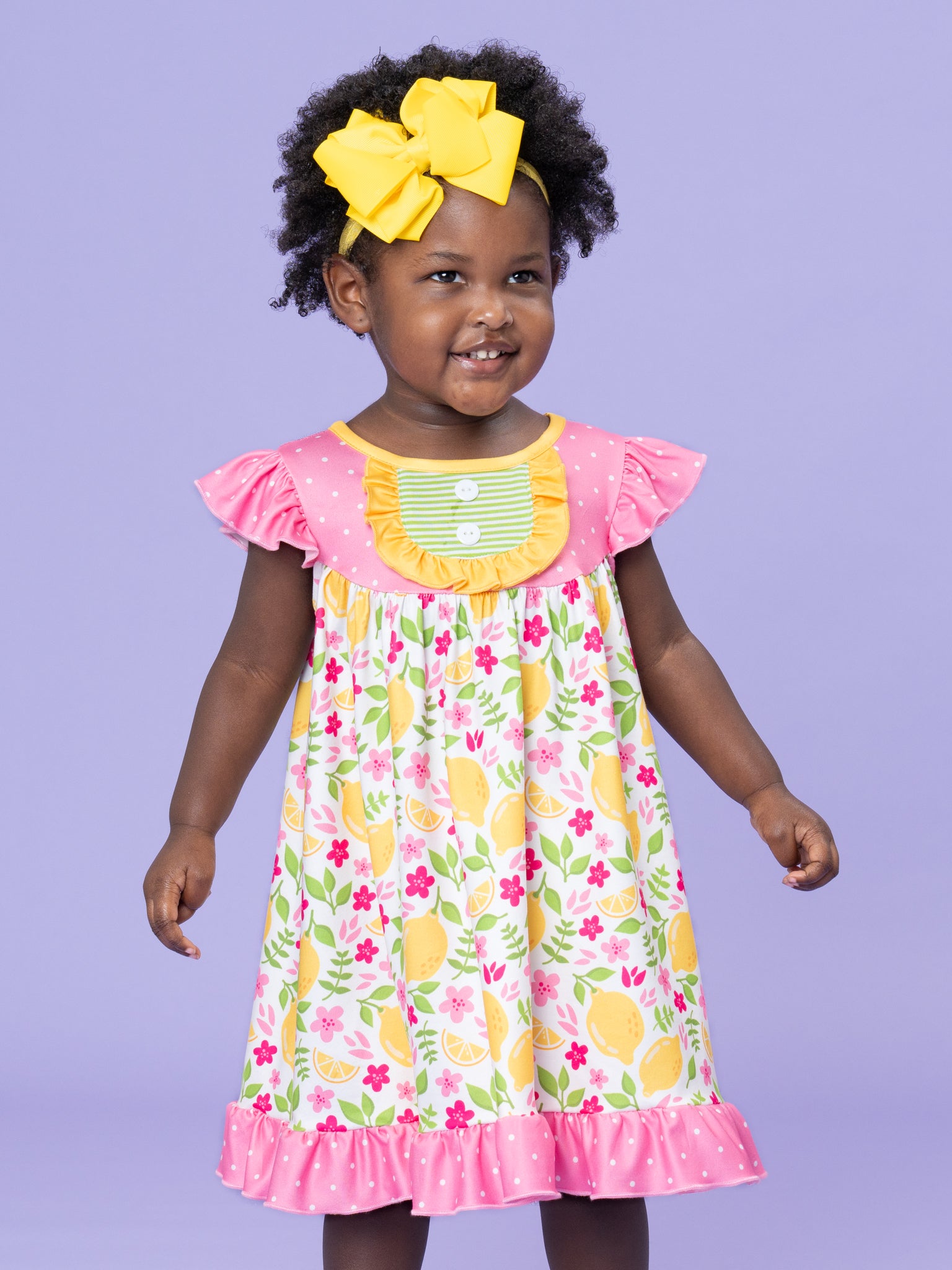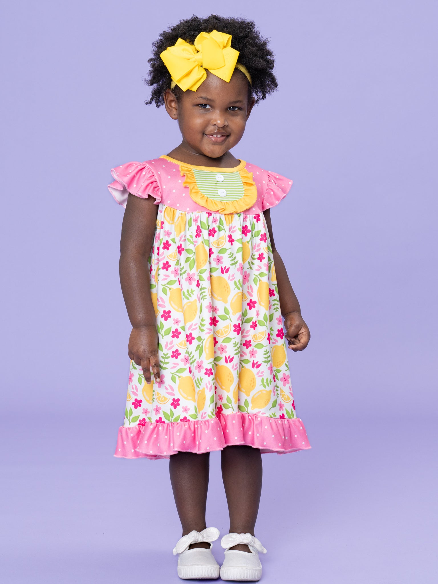 The Lemon Blossom Breeze Ruffle Dress by Marie Nicole Clothing offers a vibrant and playful look for little ones. With its bright lemon and floral print and ruffled hem, this dress is as cute as it is comfortable. Ideal for sunny days, it provides a cheerful, stylish option for casual outings and playtime adventures.