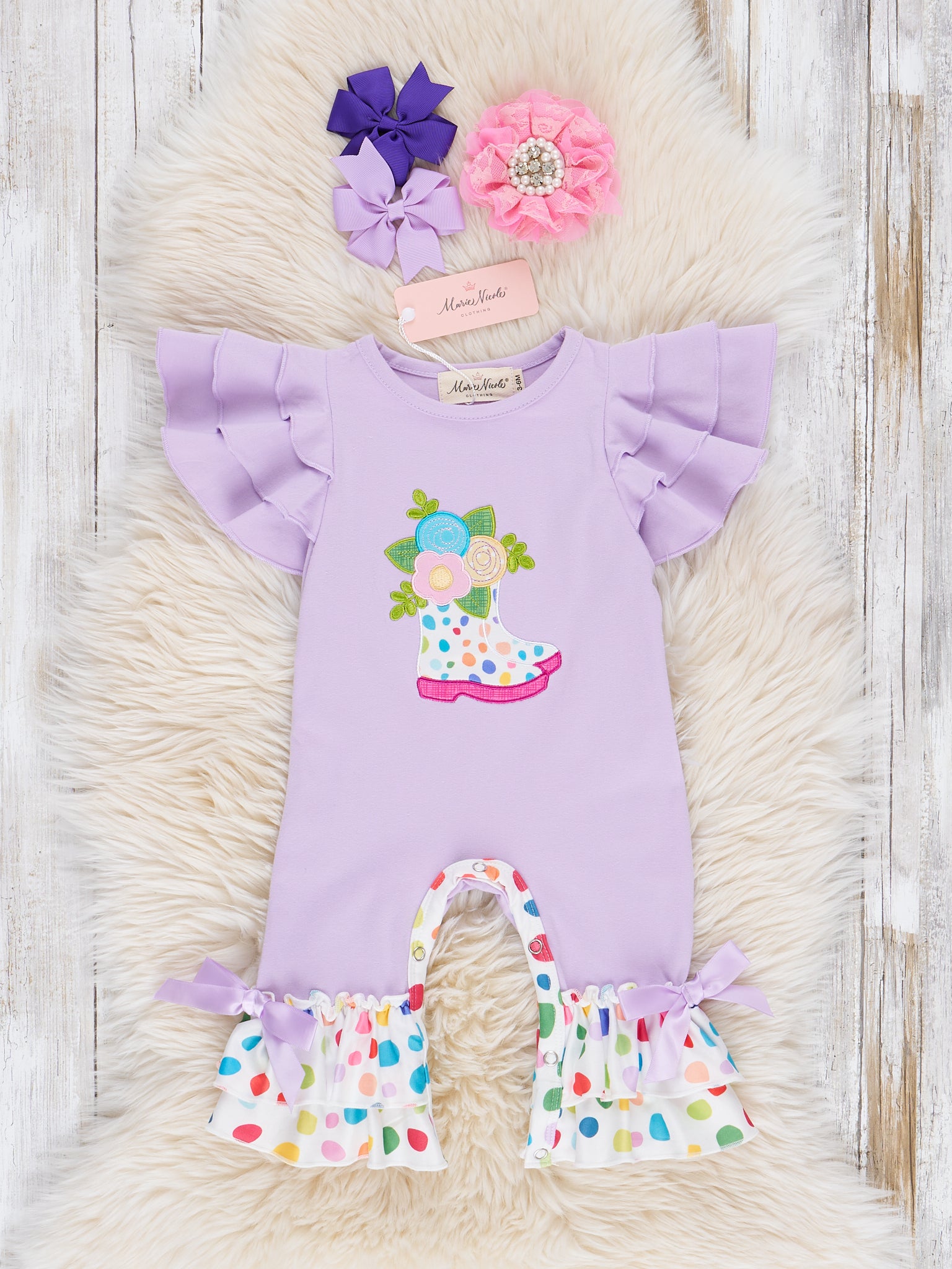 Yee-haw your way into spring with our Lilac Confetti Cowgirl Ruffle Romper! The playful confetti ruffle ankles round out the lilac bodice & cowgirl boot design. Complete the look with our matching sister set from Marie Nicole Clothing. Giddy up and grab one now!